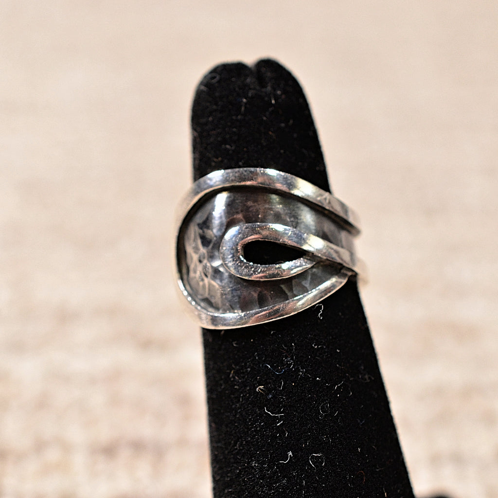 Beautiful handmade Margot de Taxco sterling silver ring with curves, repousse hammered finish, and open details.