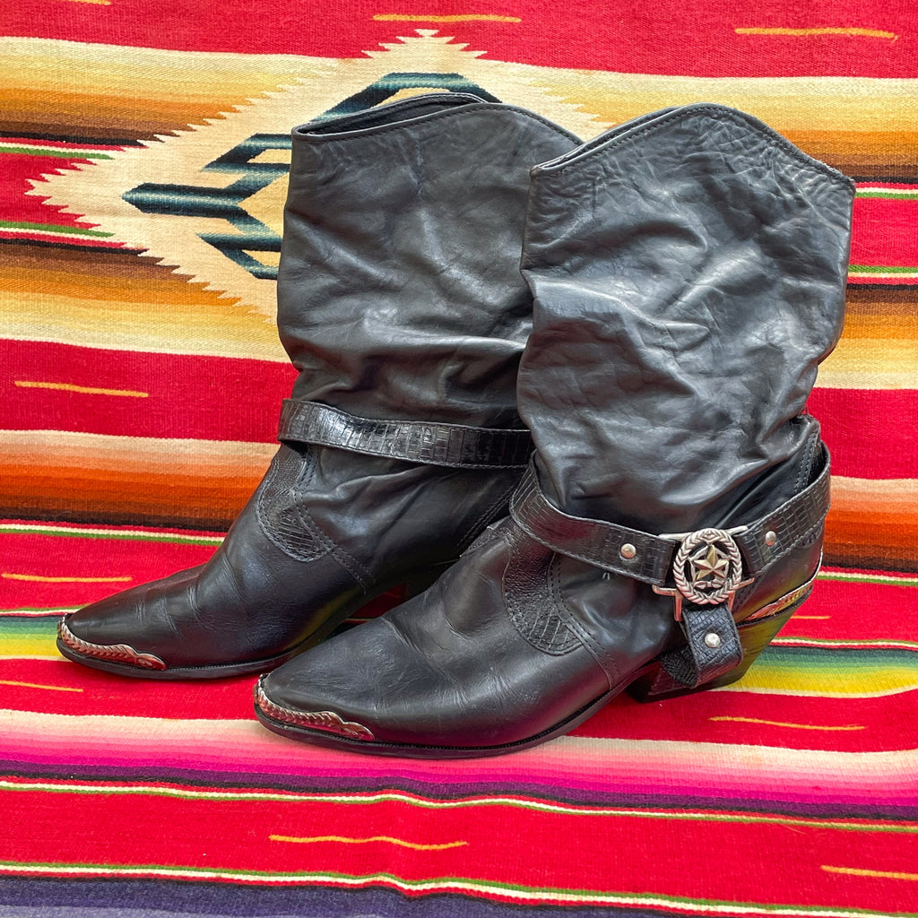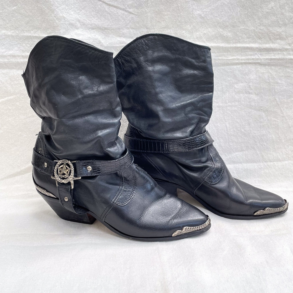Black leather 80s slouchy black leather ankle boots with straps.