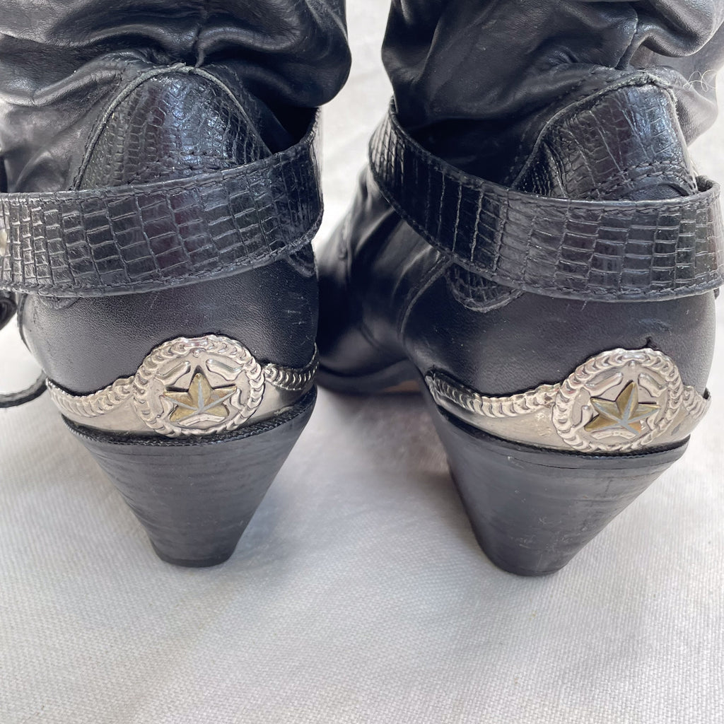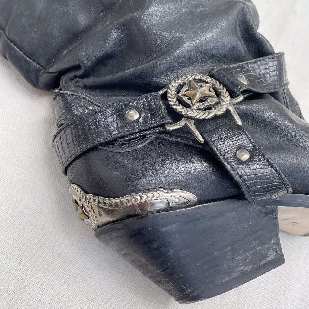 Pull on boots, with decorative metal caps & stars on the heels, toes and buckle.