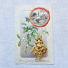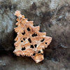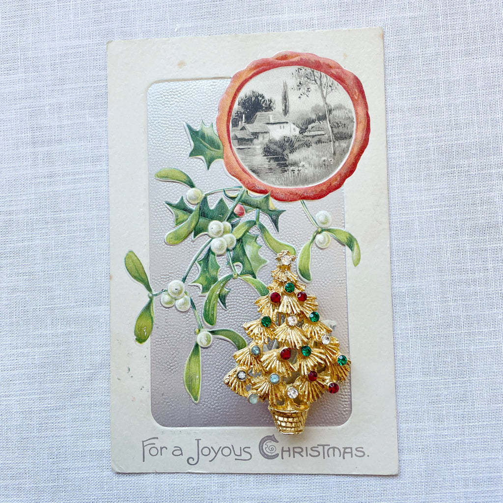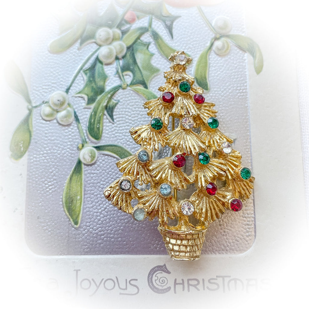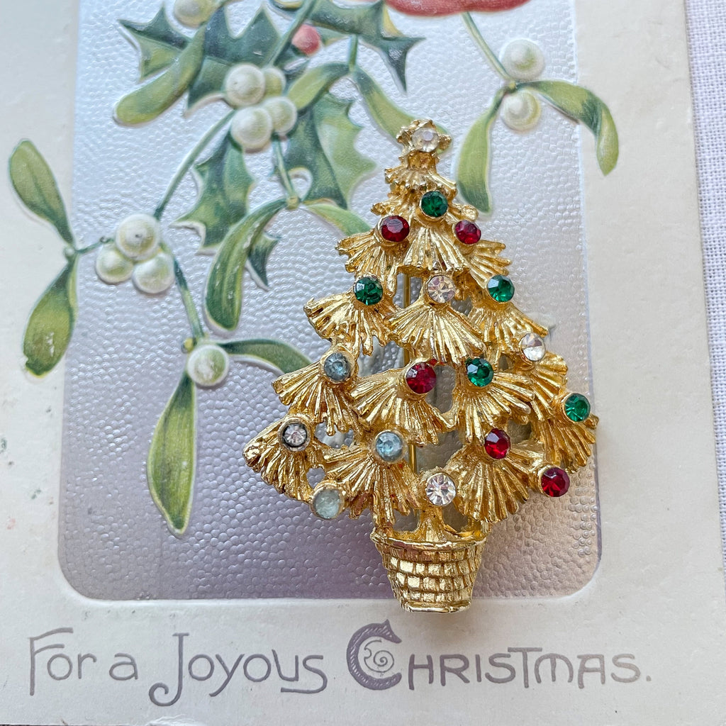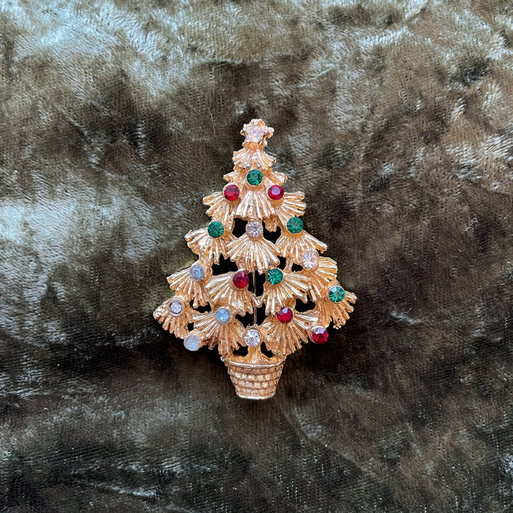 Vintage gold tone MCM Christmas tree brooch with rhinestone accents.