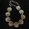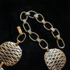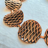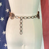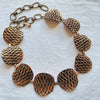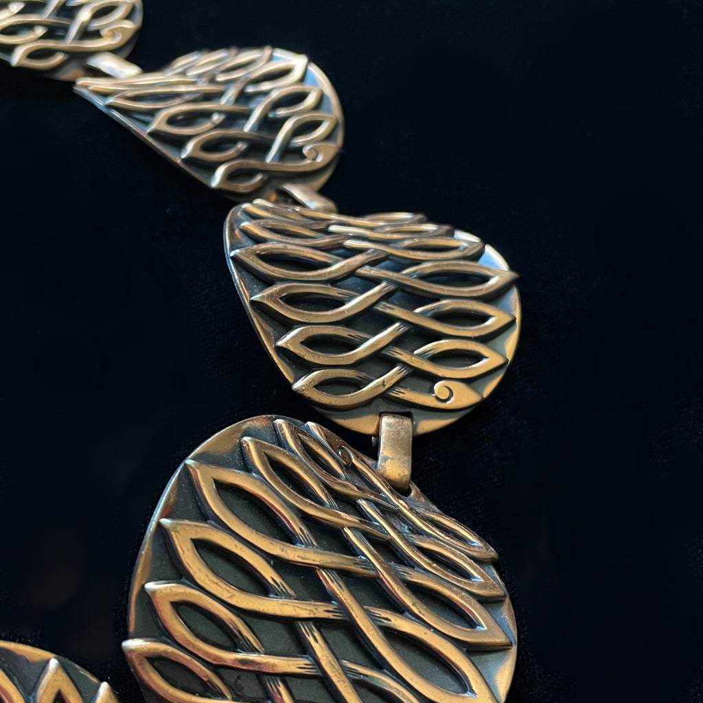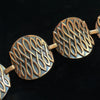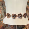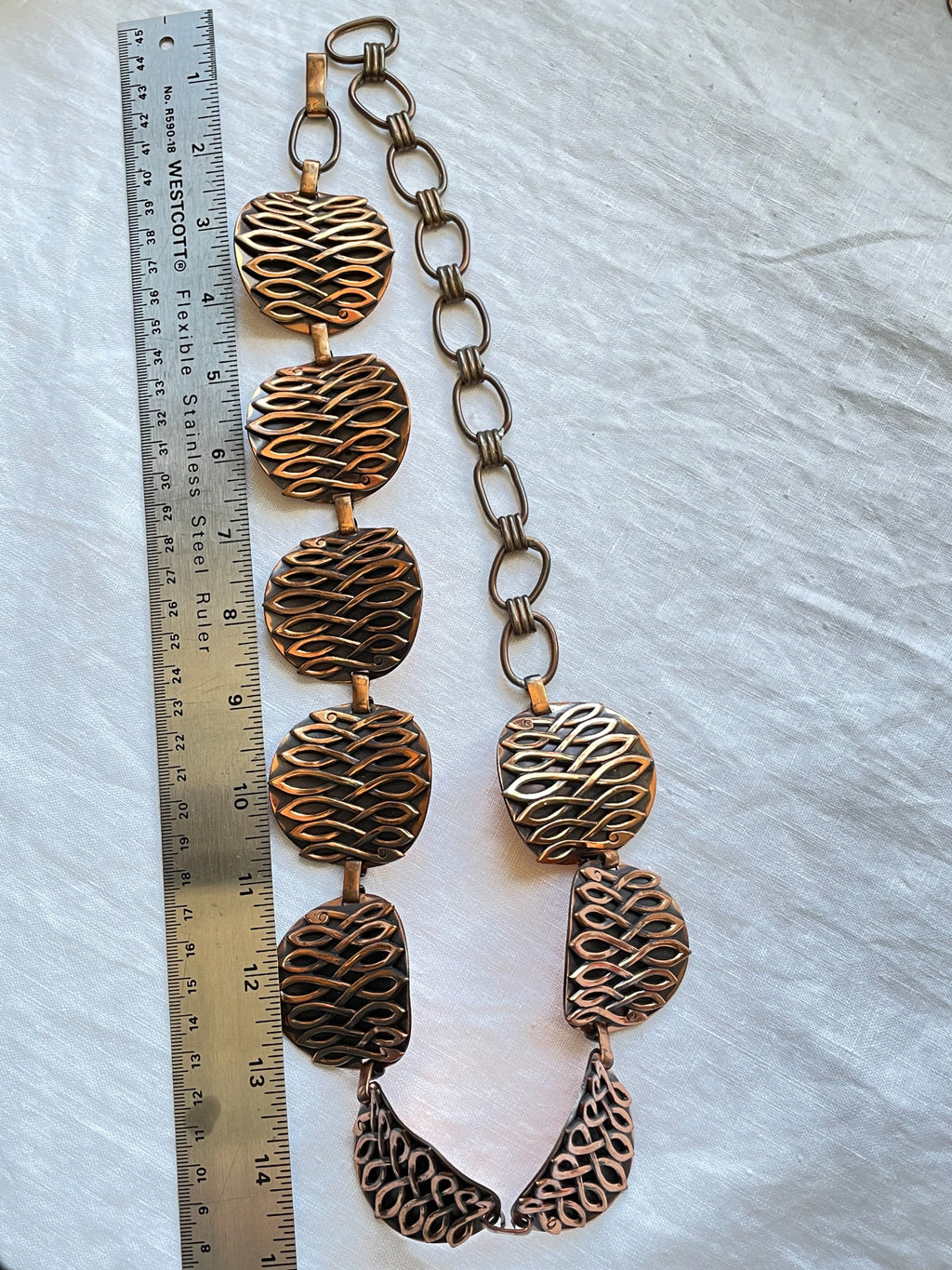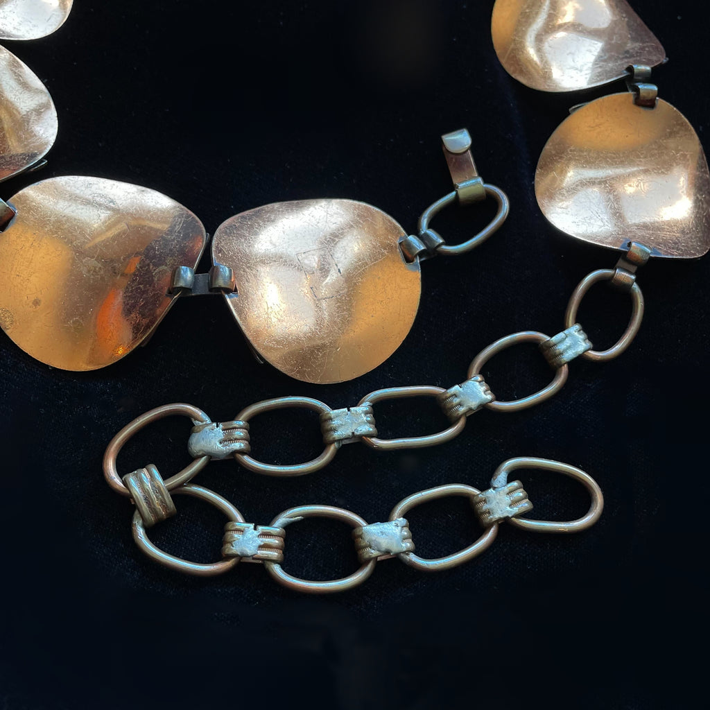 Vintage copper chain belt, curved discs with raised modernist details against a darker oxidized background. Very nice details.