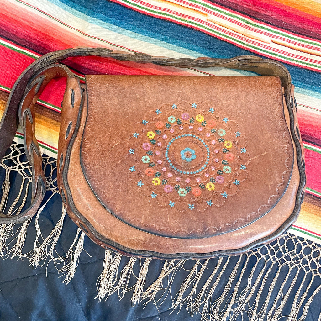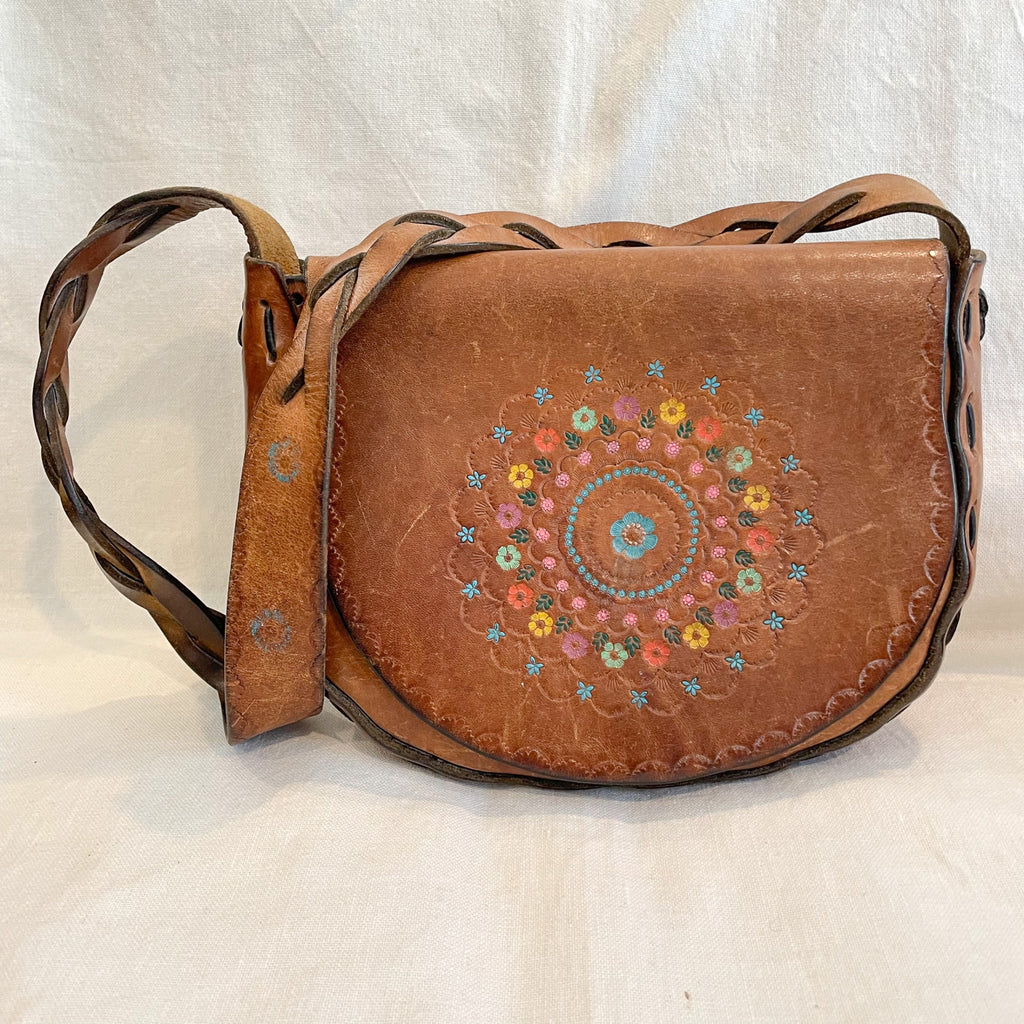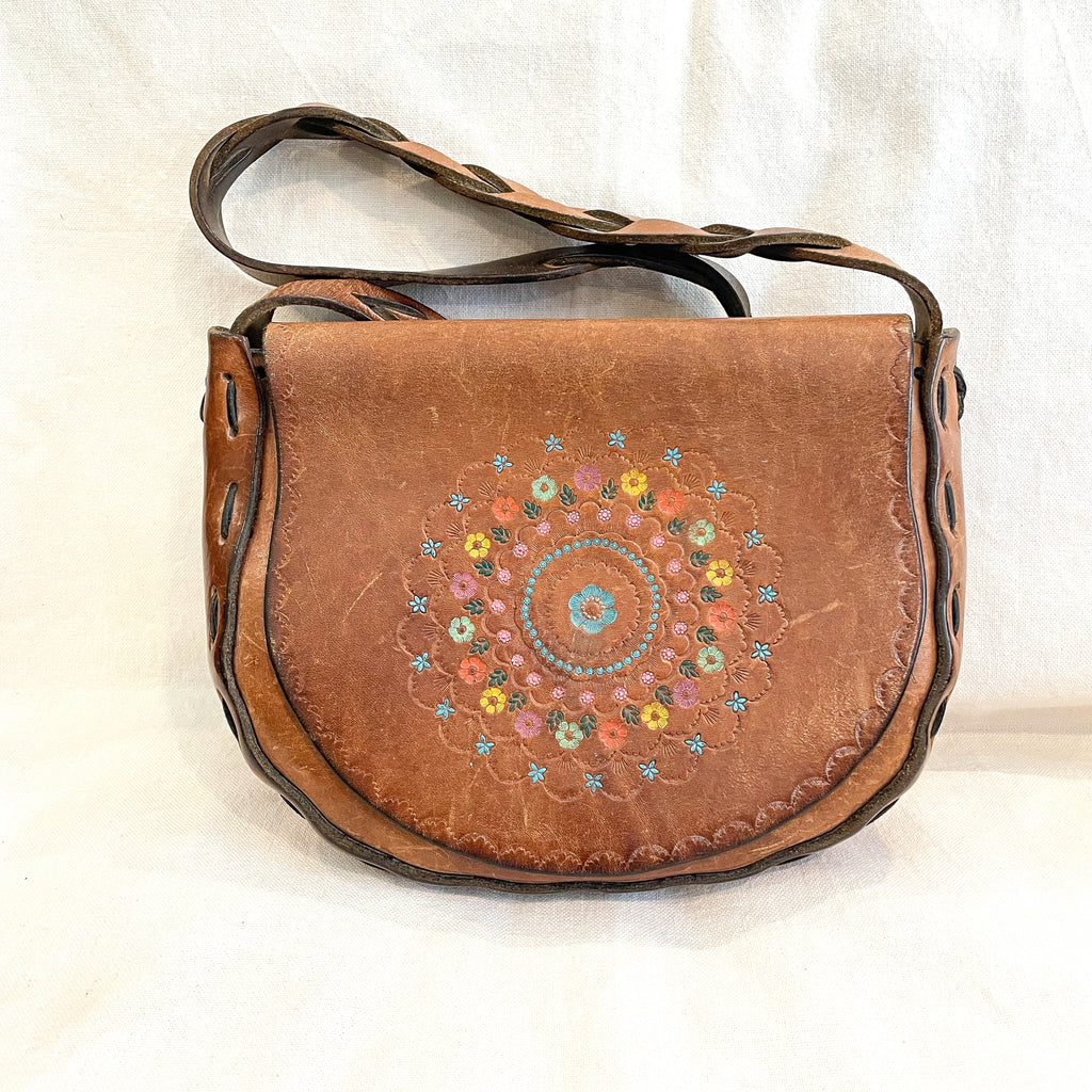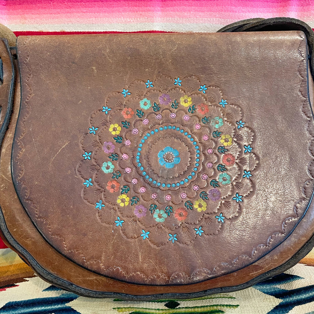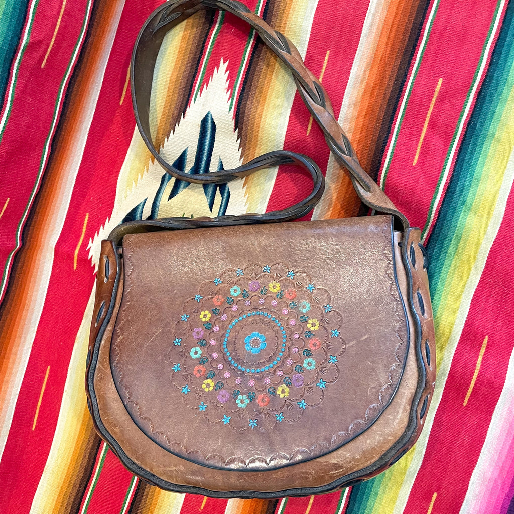 Vintage hand tooled and painted leather with flowers on the shoulder bag, and strap.