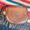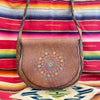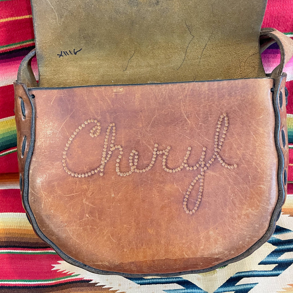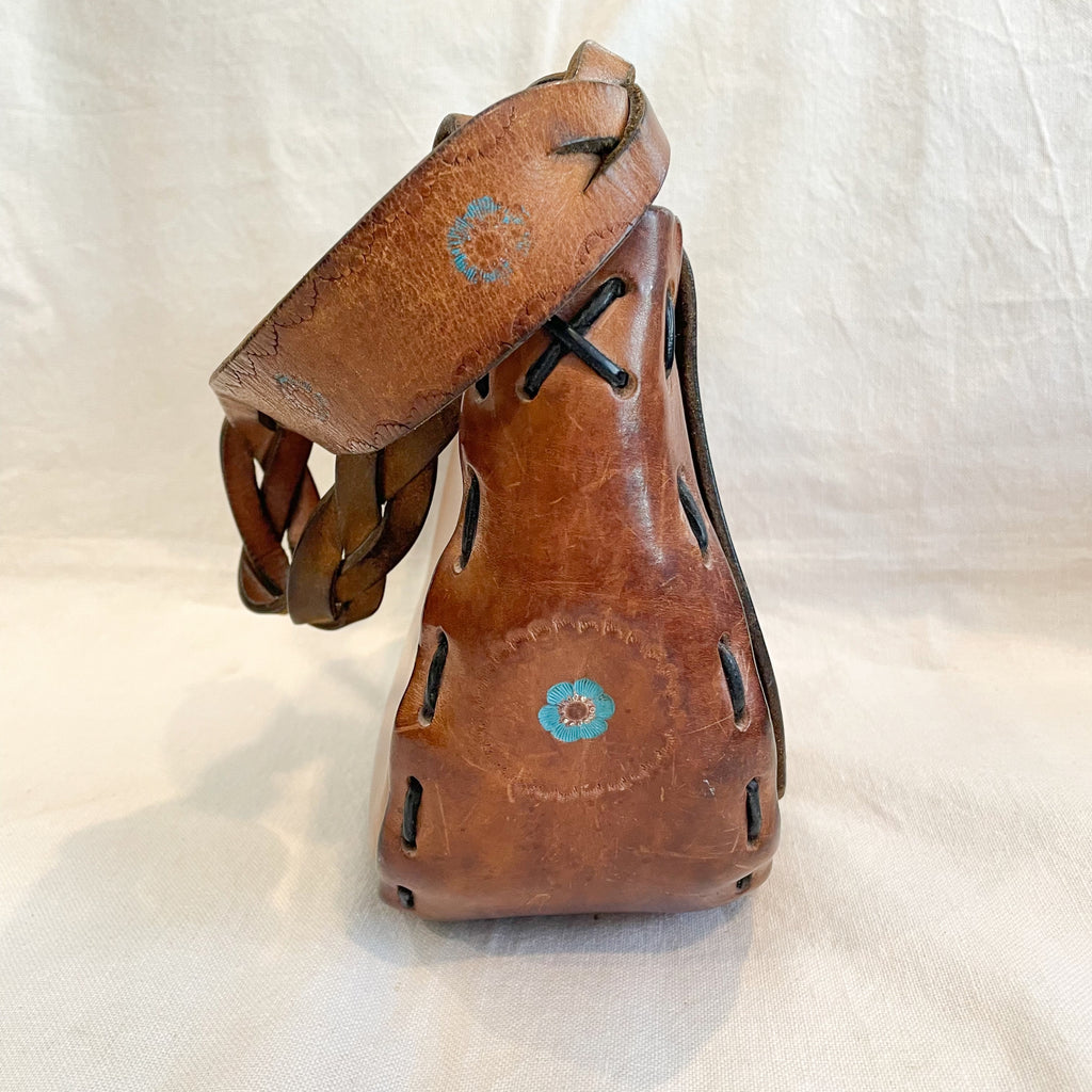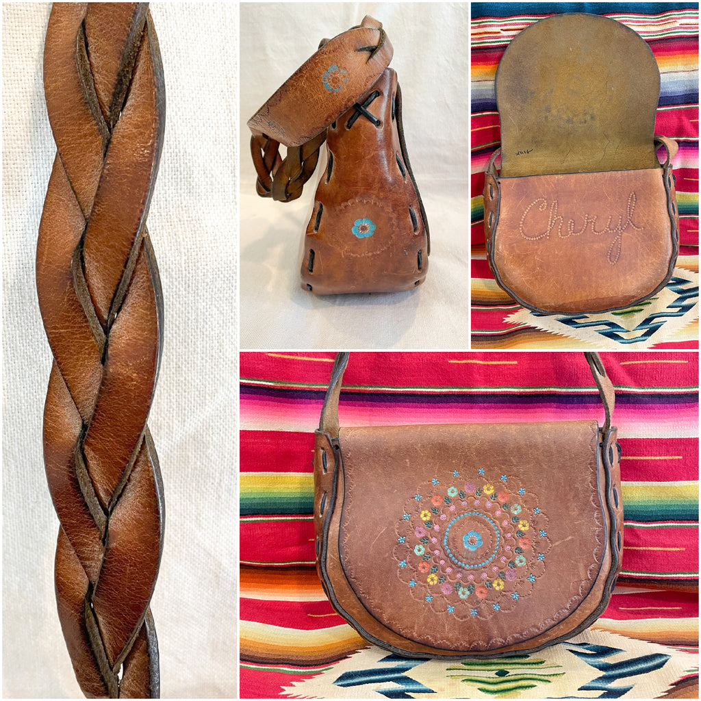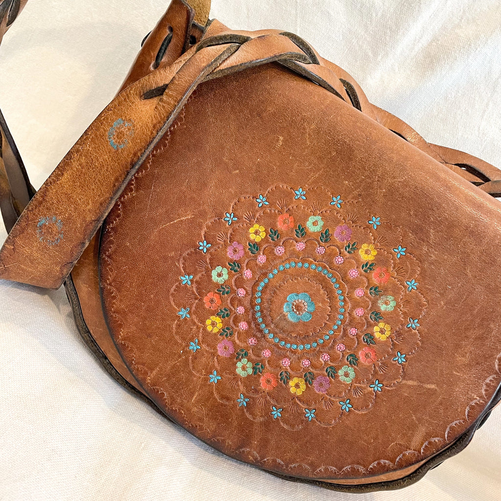 Vintage hand tooled and painted leather with flowers on the shoulder bag, and strap.
