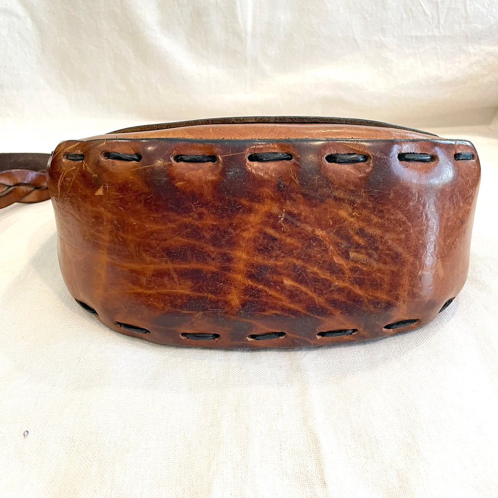 Leather handstitched sides. Split braided leather strap, not adjustable.