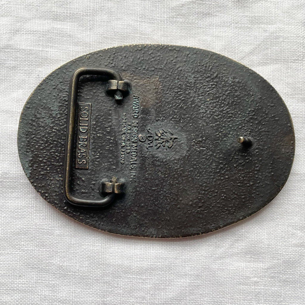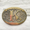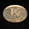 Monogrammed belt buckle with fancy K in the center, surrounded by etched flowers and swirls.