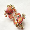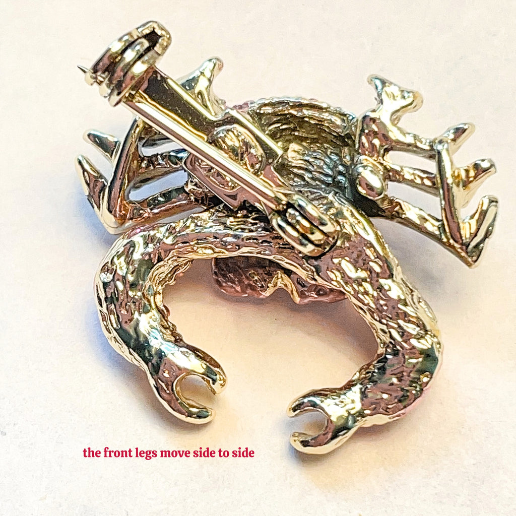 Gold tone, pink, yellow with rhinestone accents & green eyes.