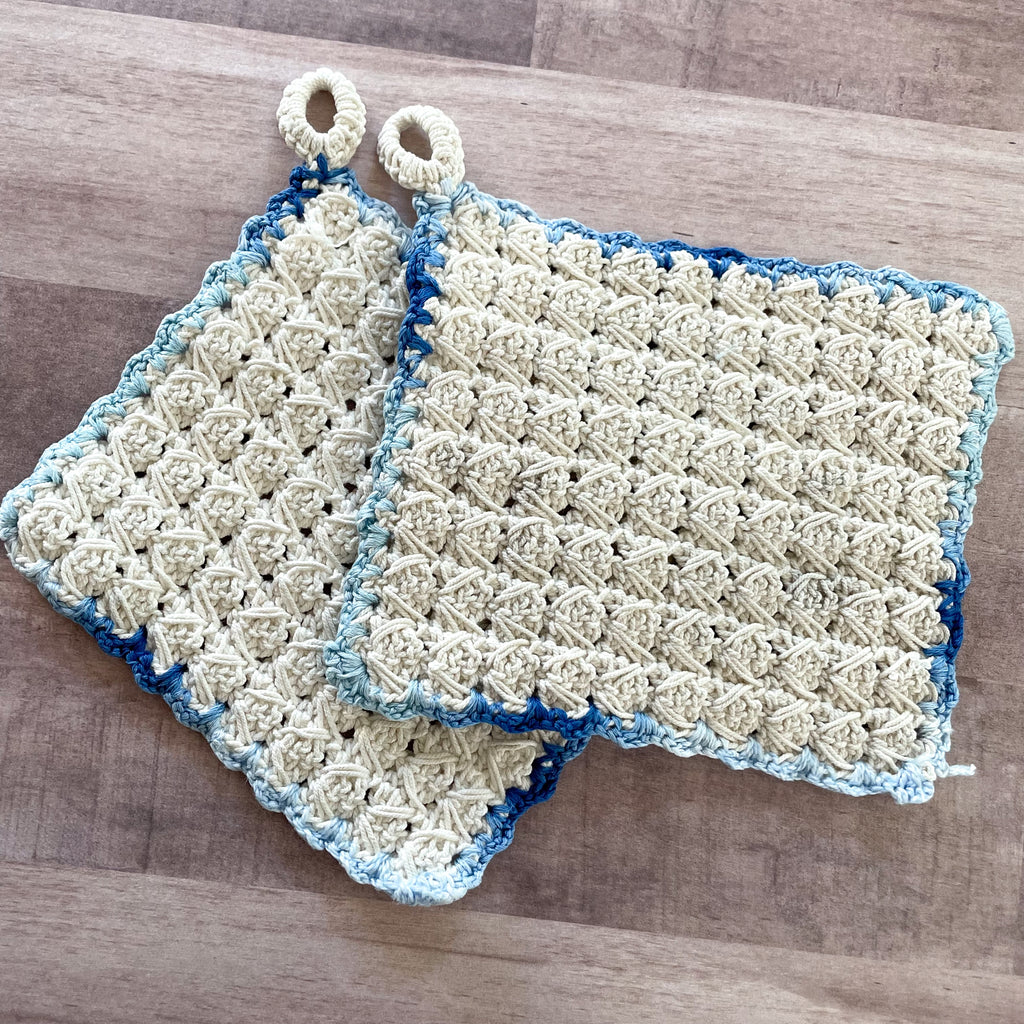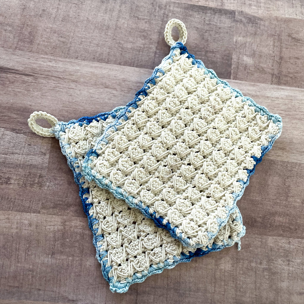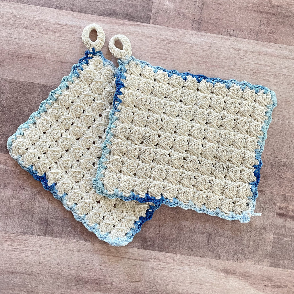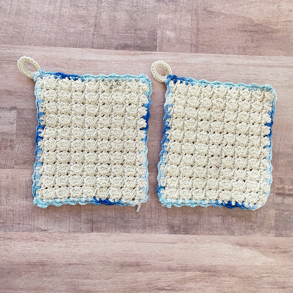 Vintage Crochet Pot Holders, White/Blue set of 2