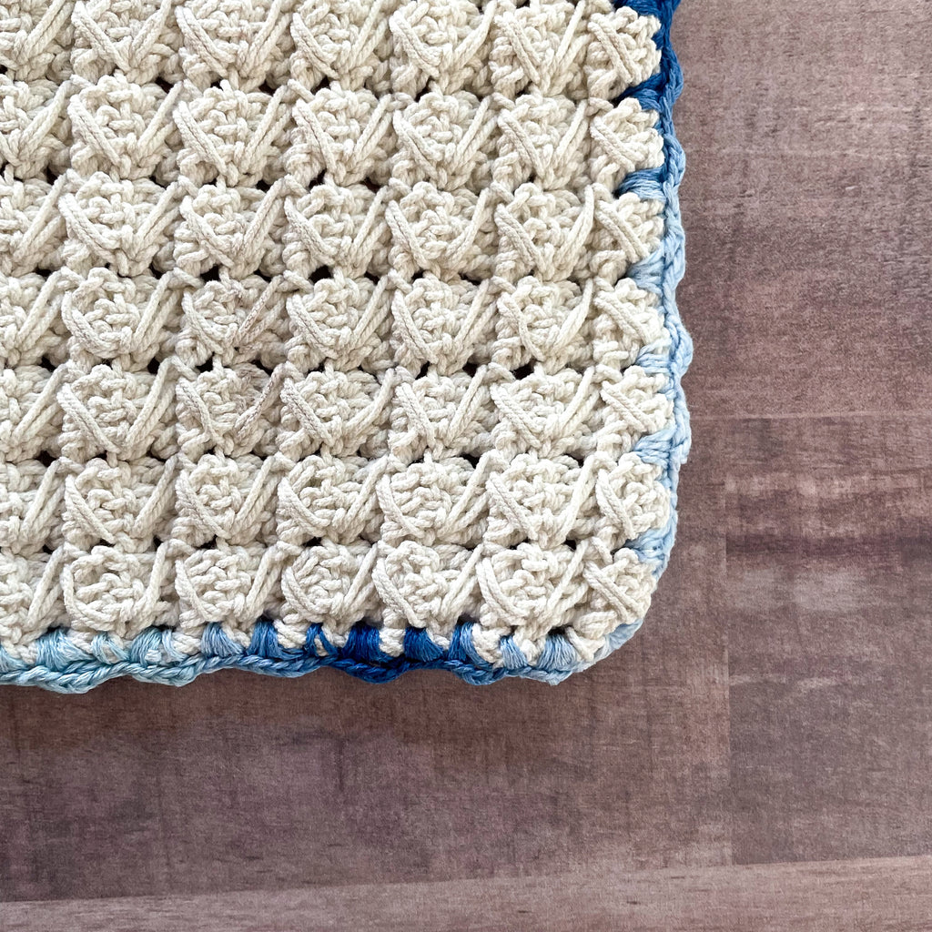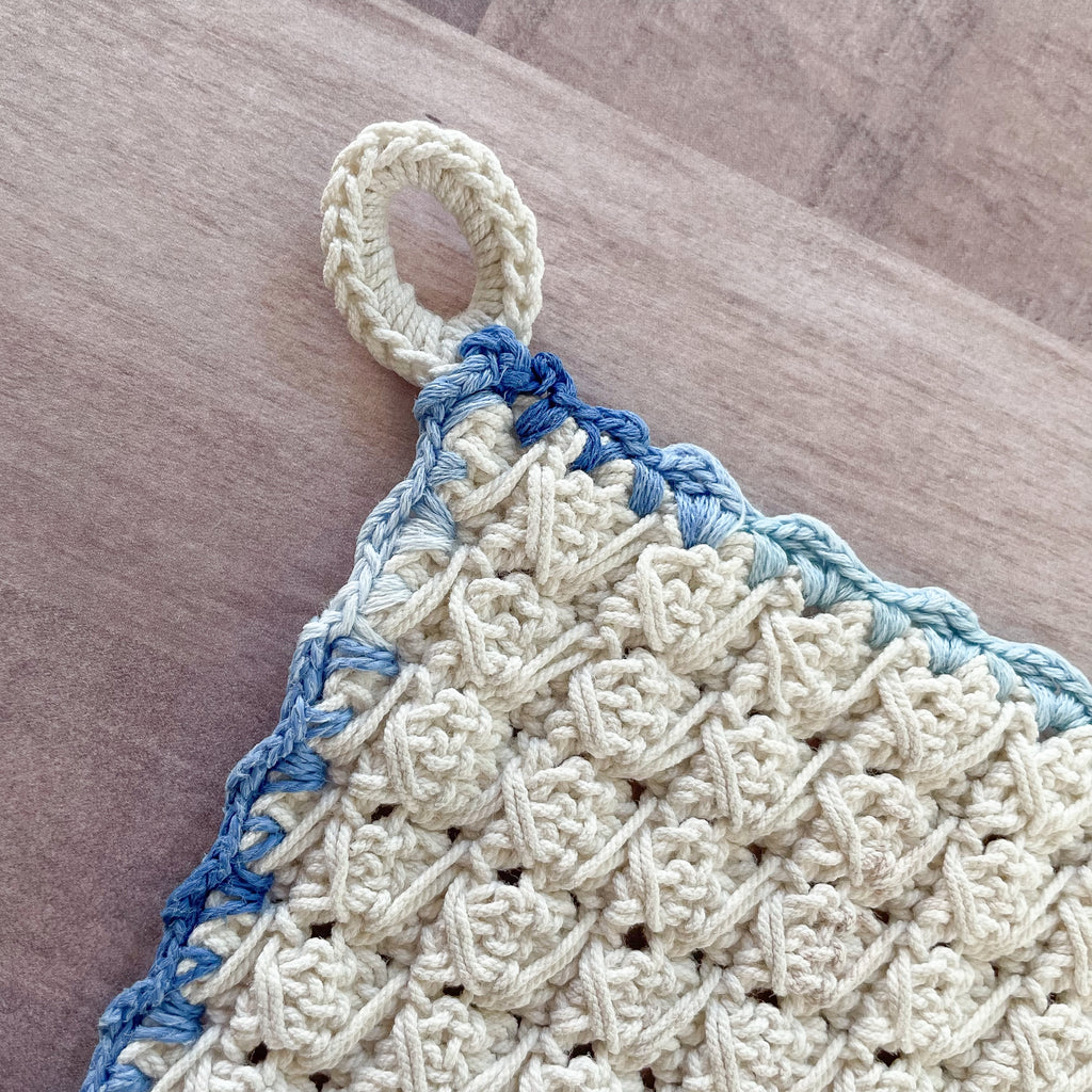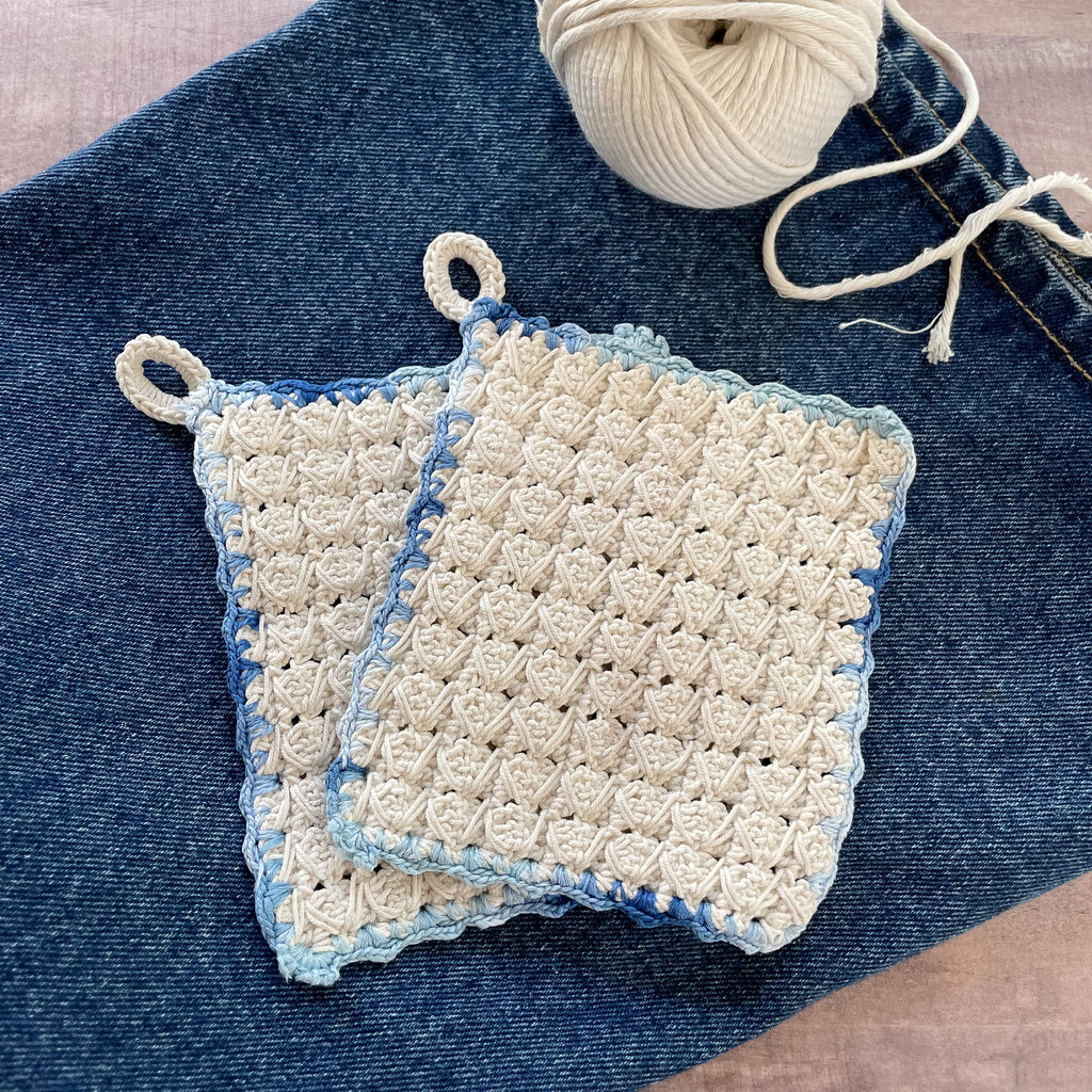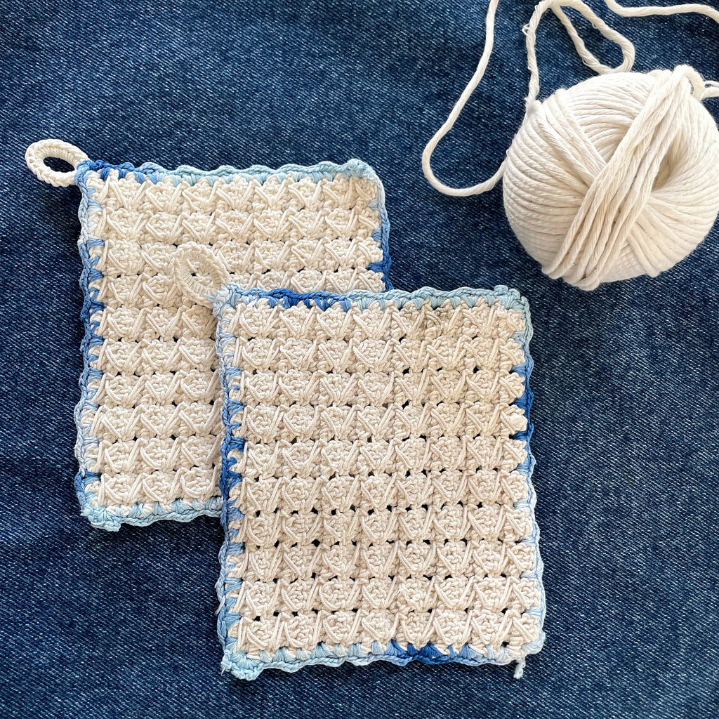 Vintage Crochet Pot Holders, White/Blue set of 2