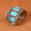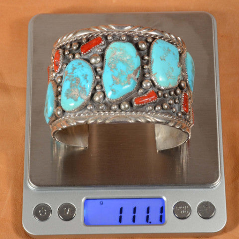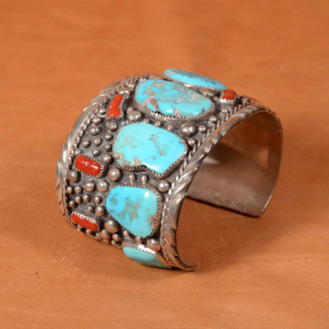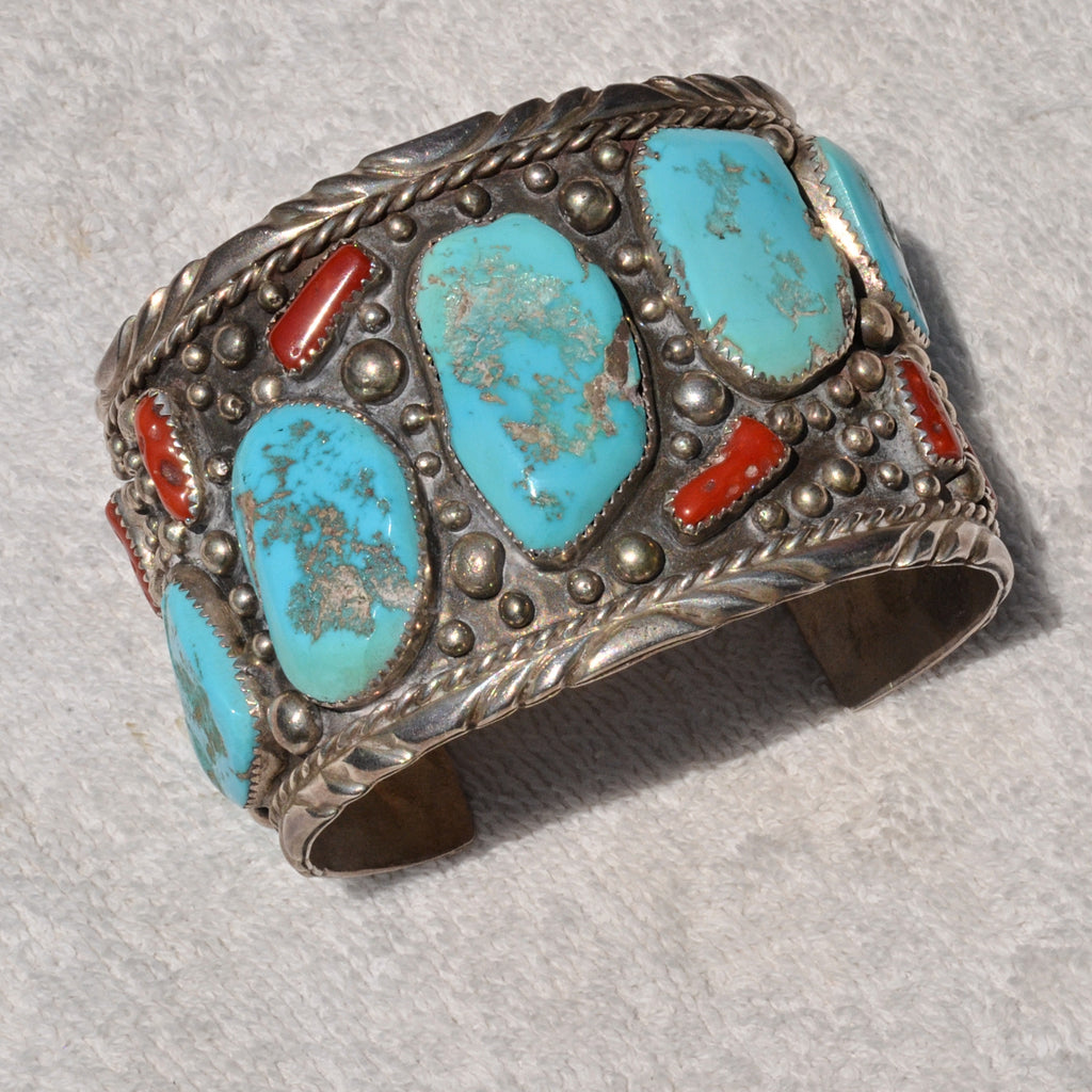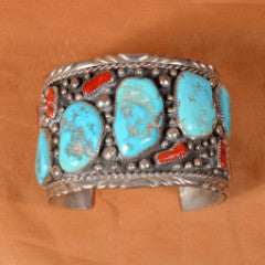 Accented with 7 turquoise stones and 6 smaller coral stones. Also accented with silver balls, twisted wire and hand stamping on edges of the bracelet.