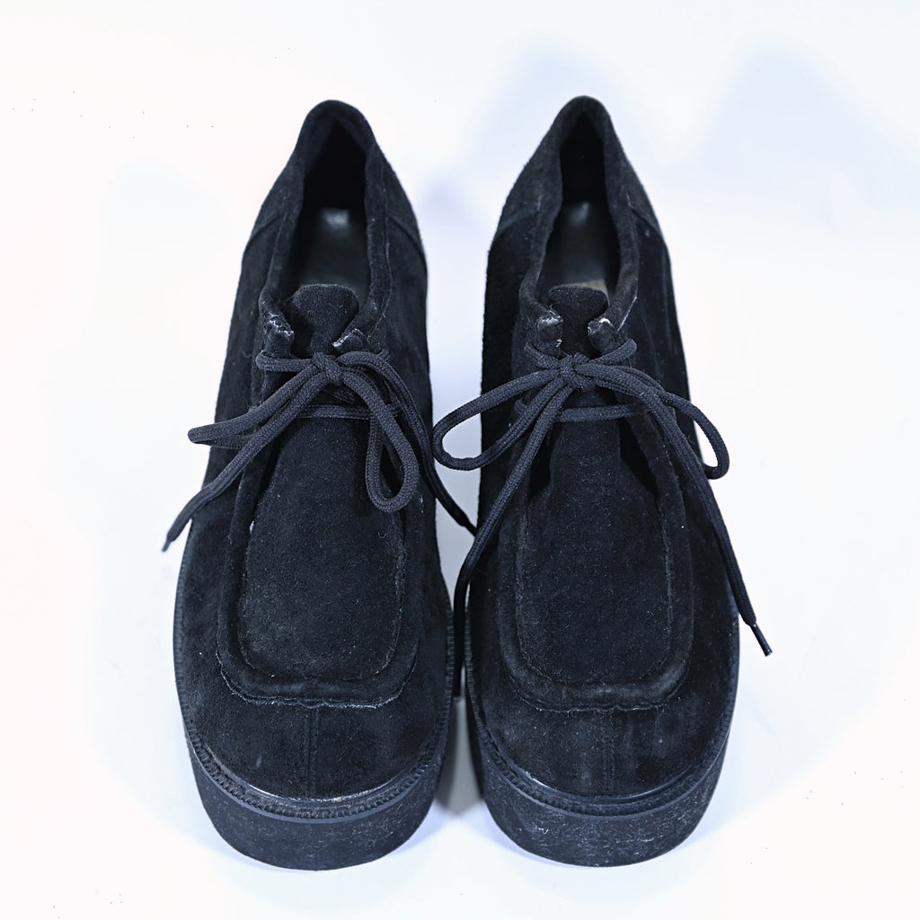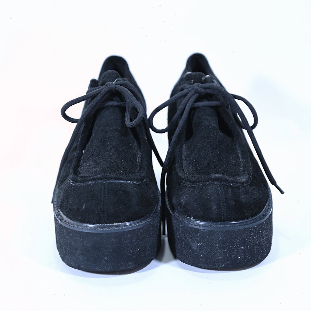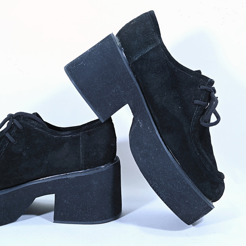 Black suede lace up oxford creepers in the style of Wallabees.