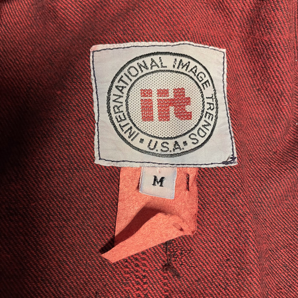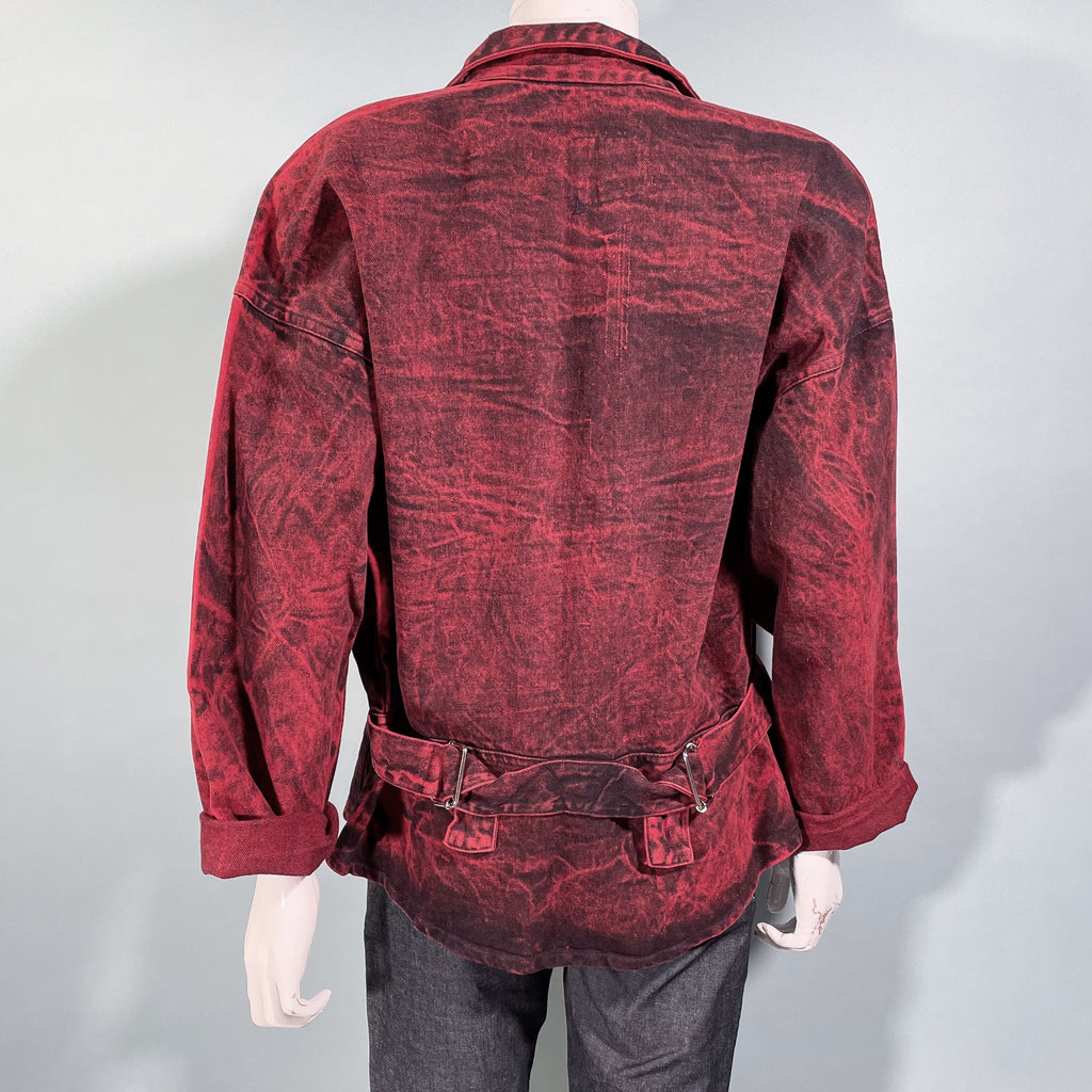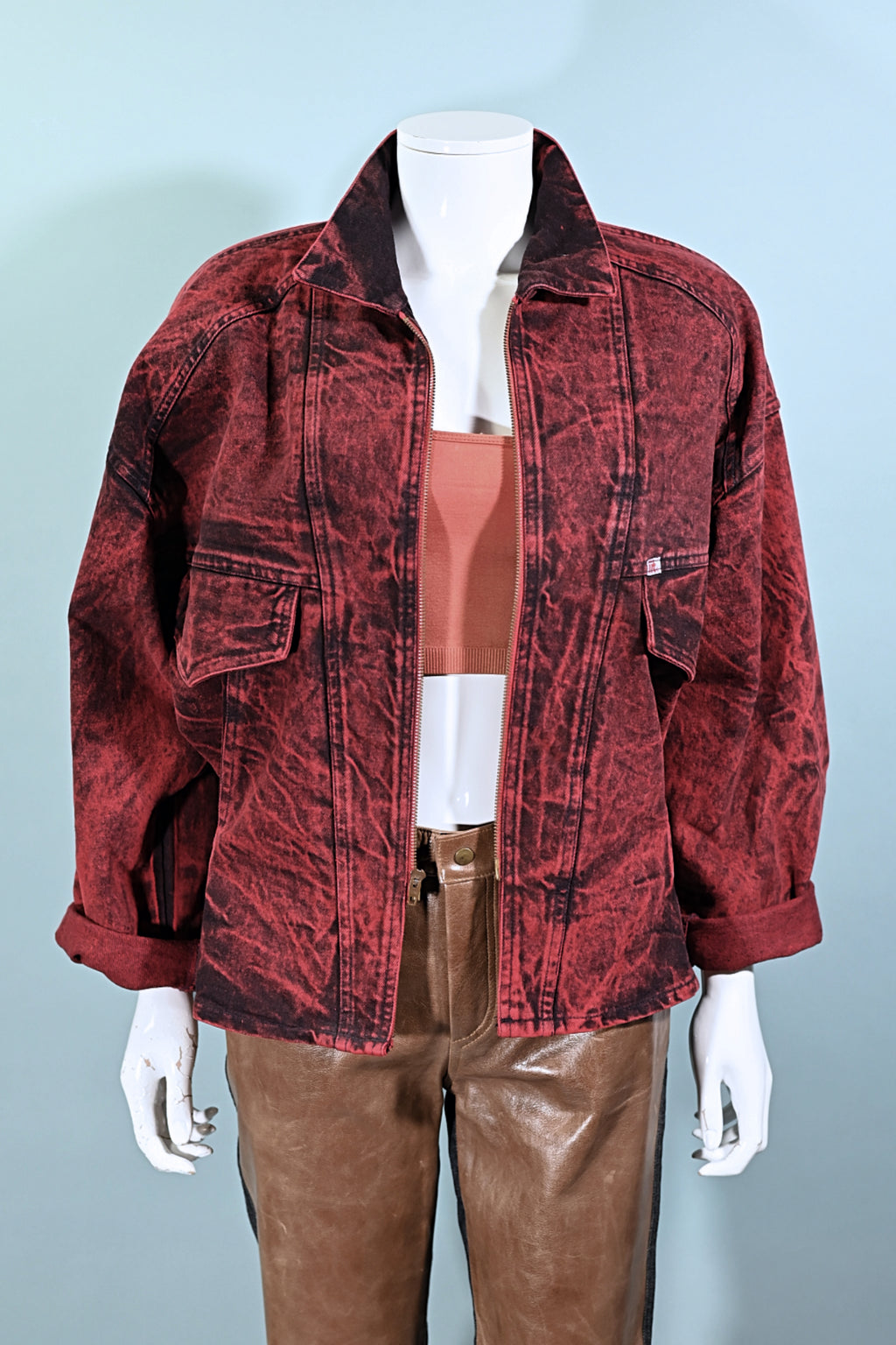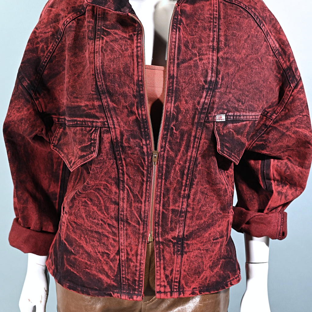 Great 1980s acid washed overdyed denim jacket with a red/black wash.