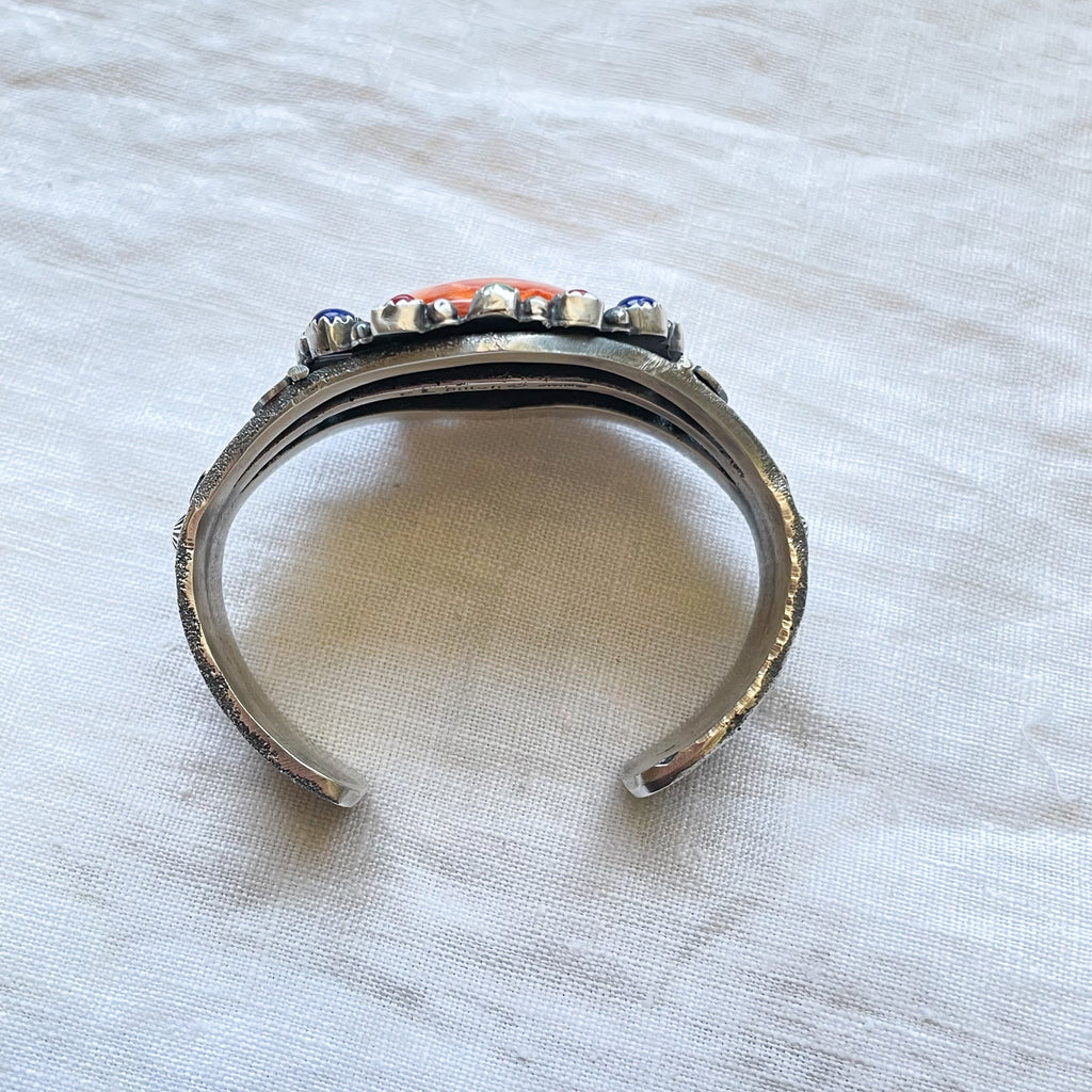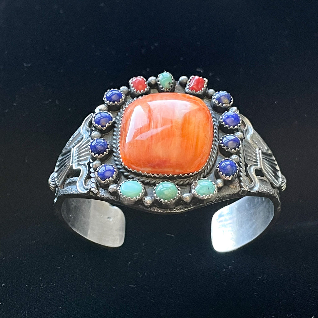 Spiny oyster center stone, turquoise, lapis, coral smaller stones.