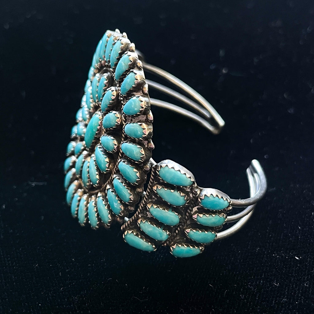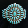 Zuni turquoise cluster cuff bracelet, sterling silver sawtooth bezel setting.