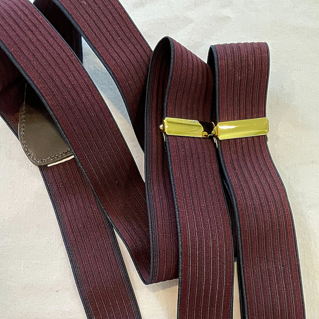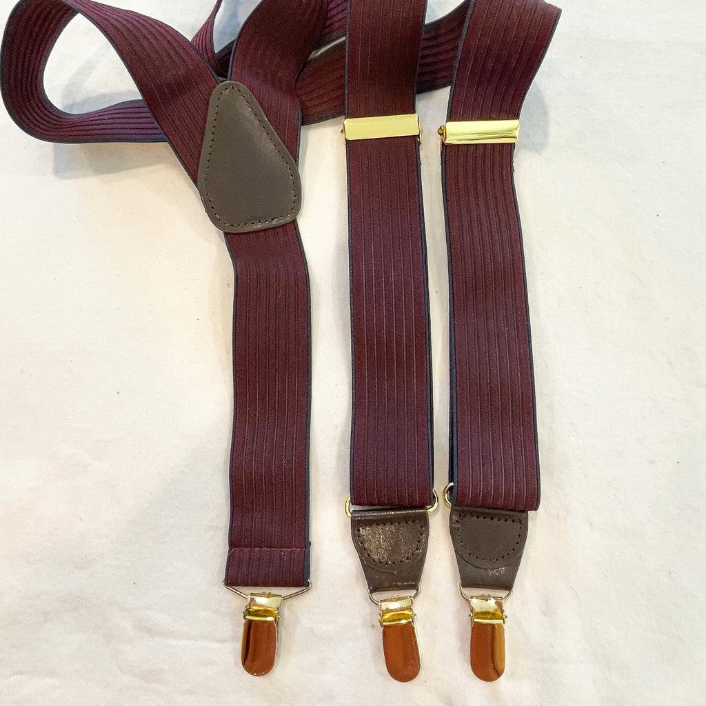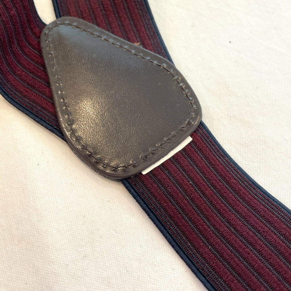 Vintage striped elastic suspenders. Stretchy elastic striped detail with brass clips for pants and adjustments.