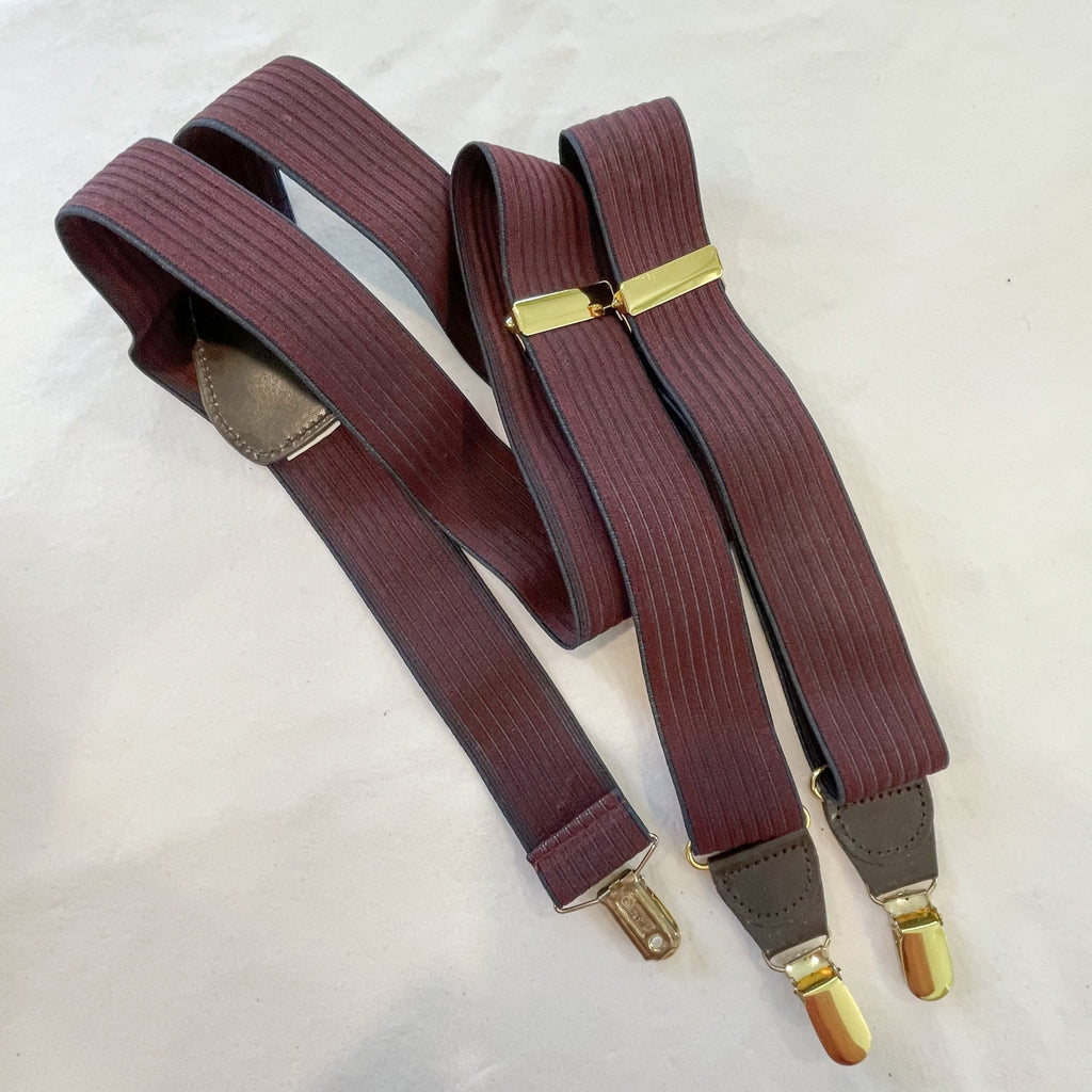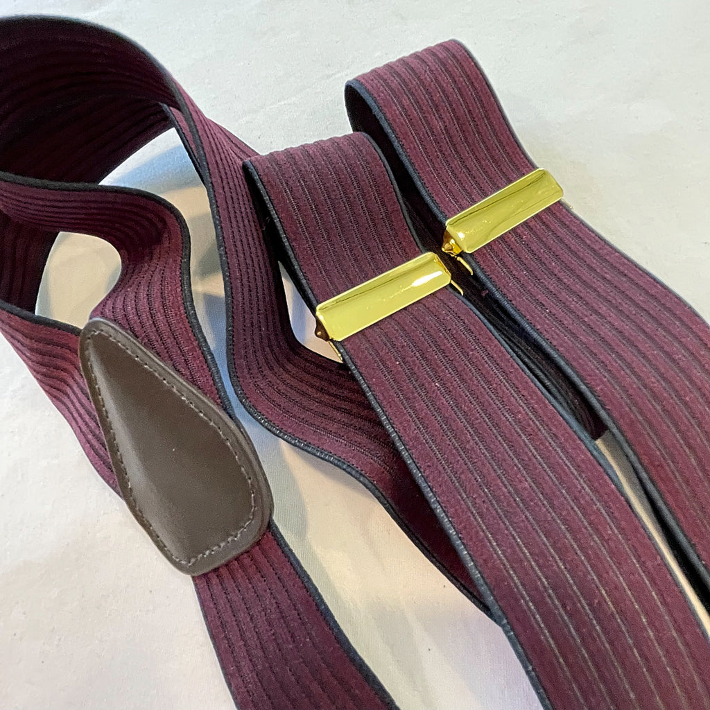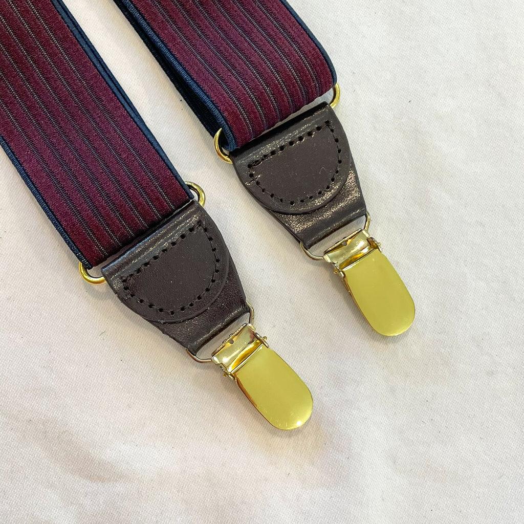 Vintage striped elastic suspenders. Stretchy elastic striped detail with brass clips for pants and adjustments.