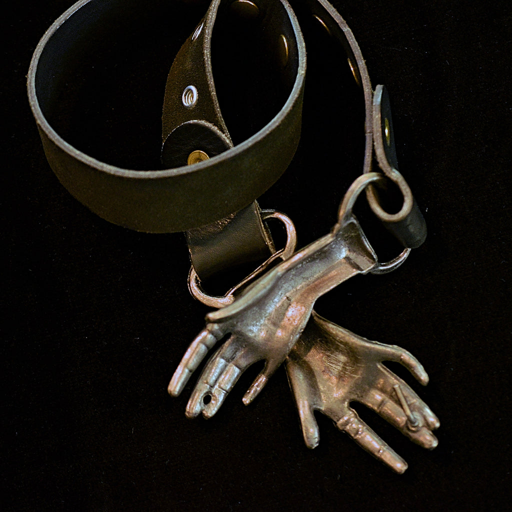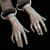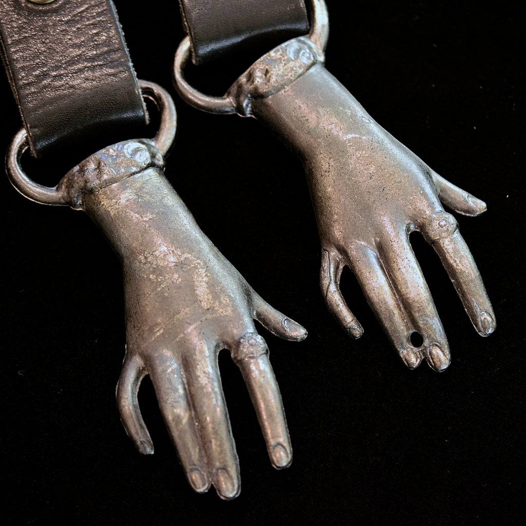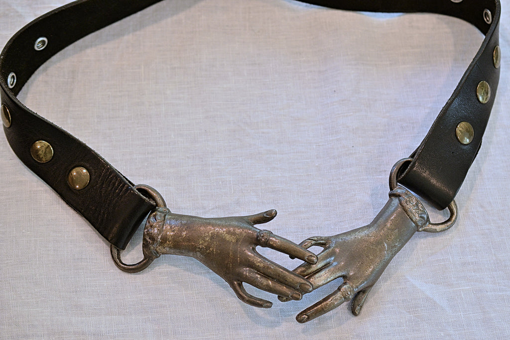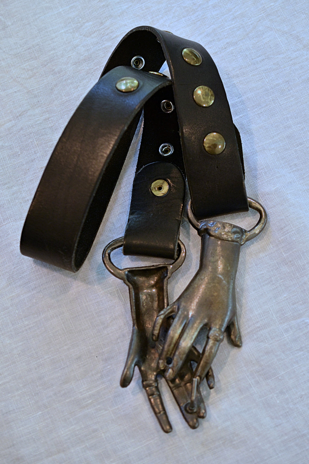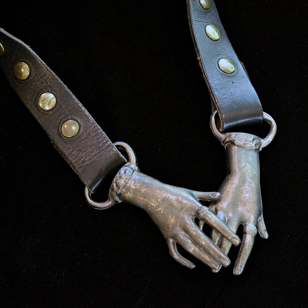 Vintage 1970s leather belt with amazing bronze clasping hands.