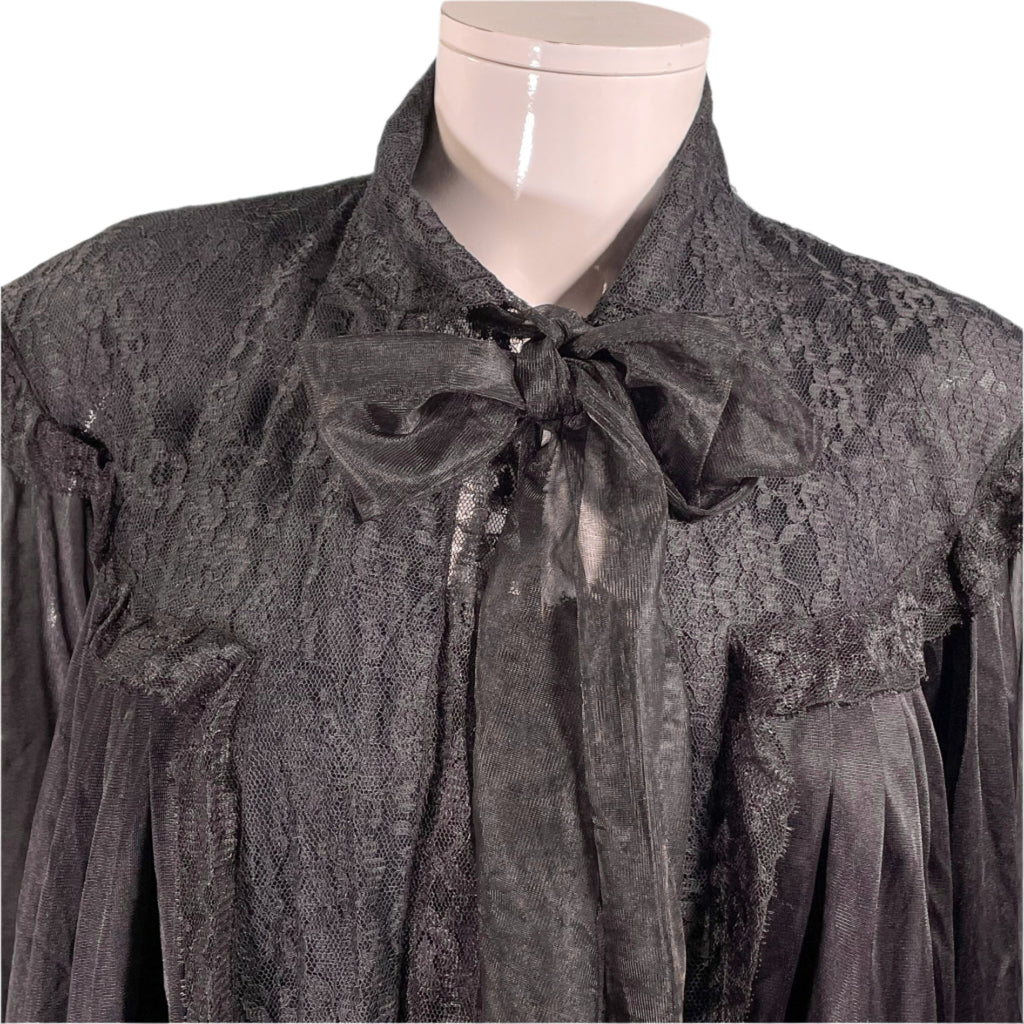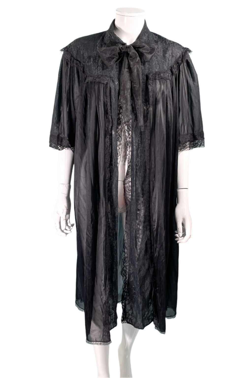 Peignoir/robe - rounded collar, pussy bow, short sleeves, yoke details, lace accents.