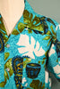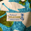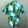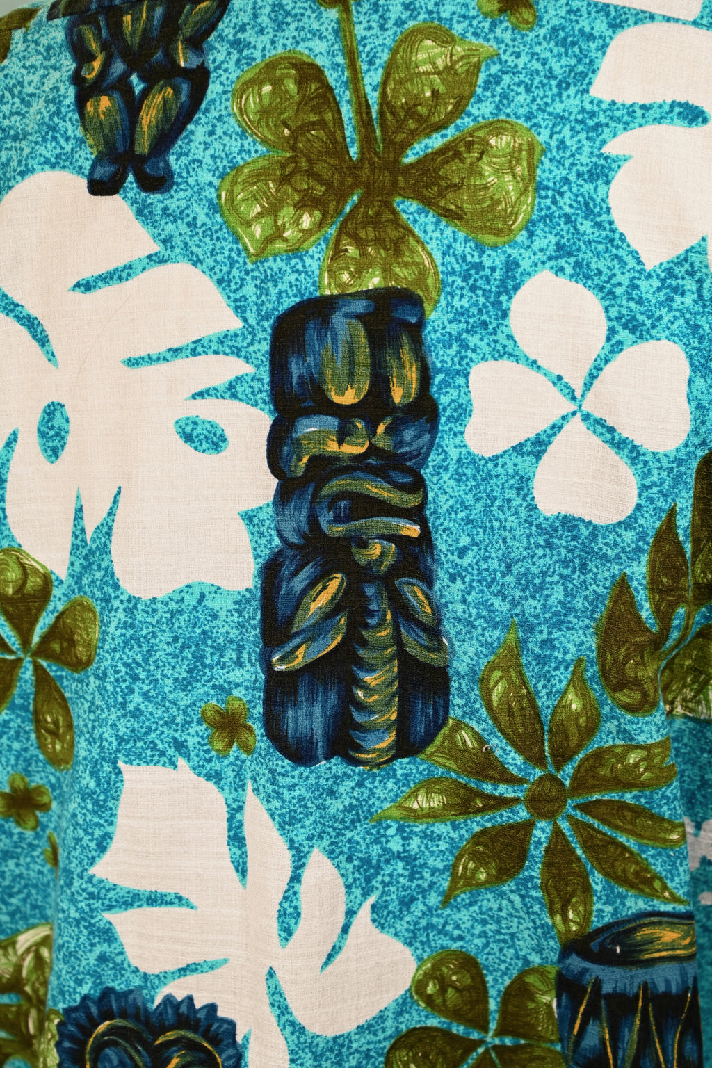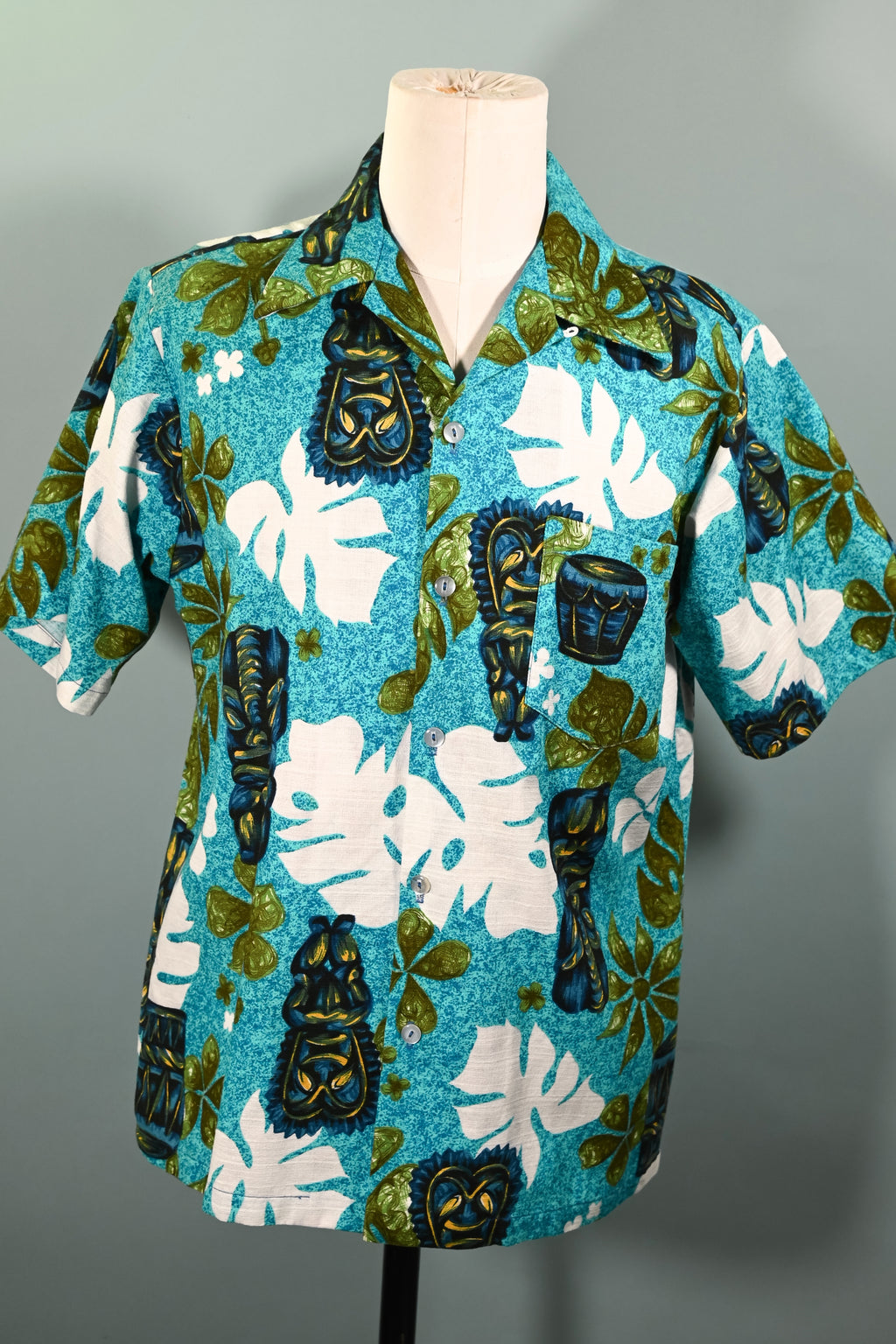 Vintage barkcloth Hawaiian shirt with Tiki and flower print.