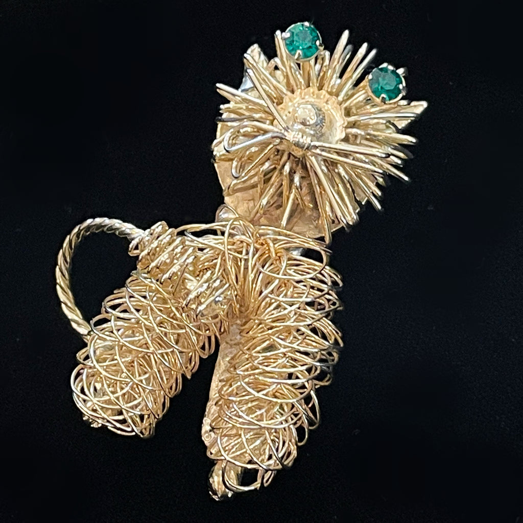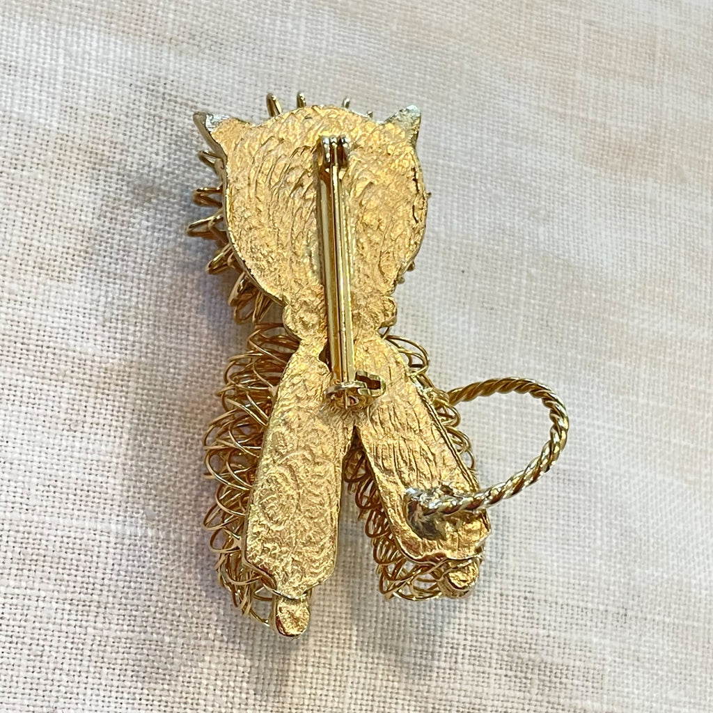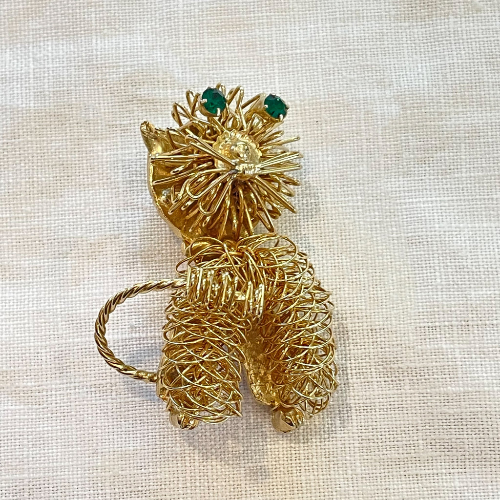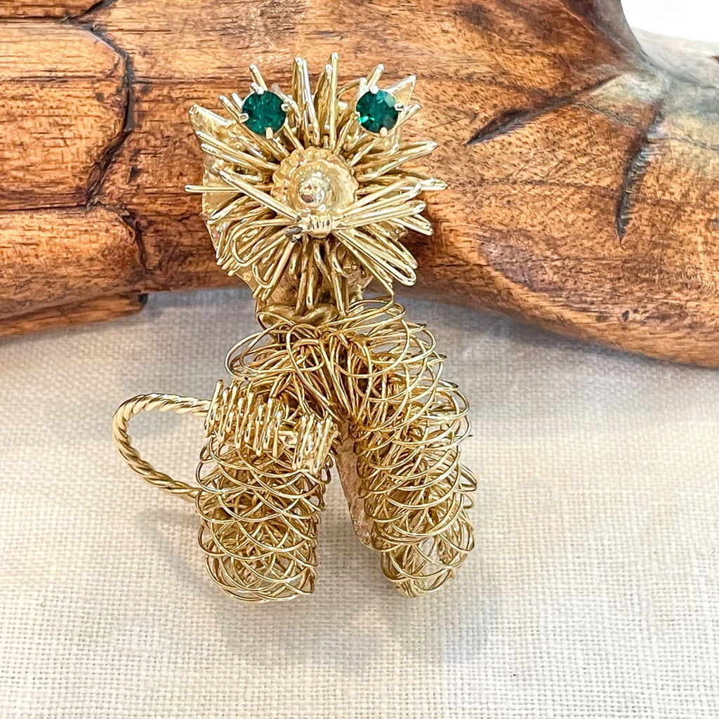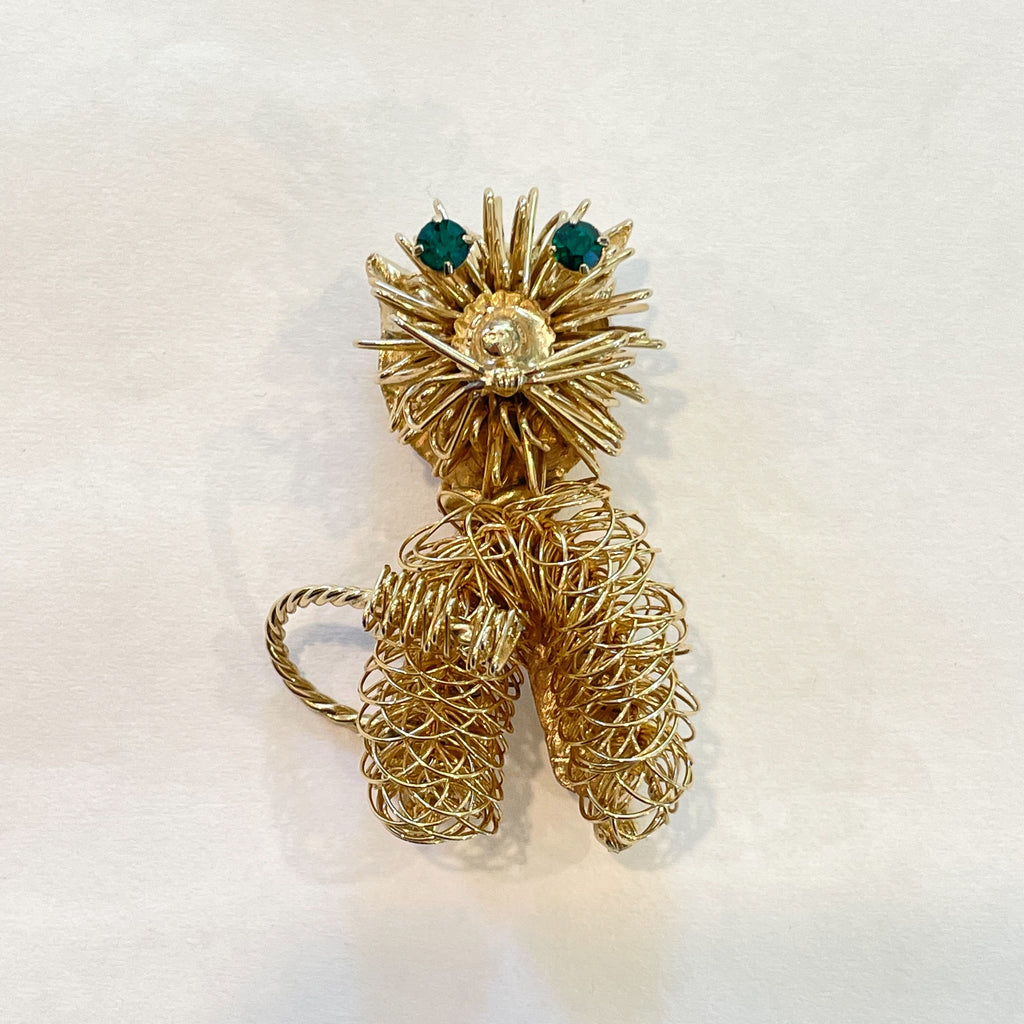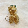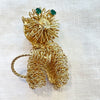 Super cute MCM gold tone twisted wire cat brooch with emerald green rhinestone eyes.
