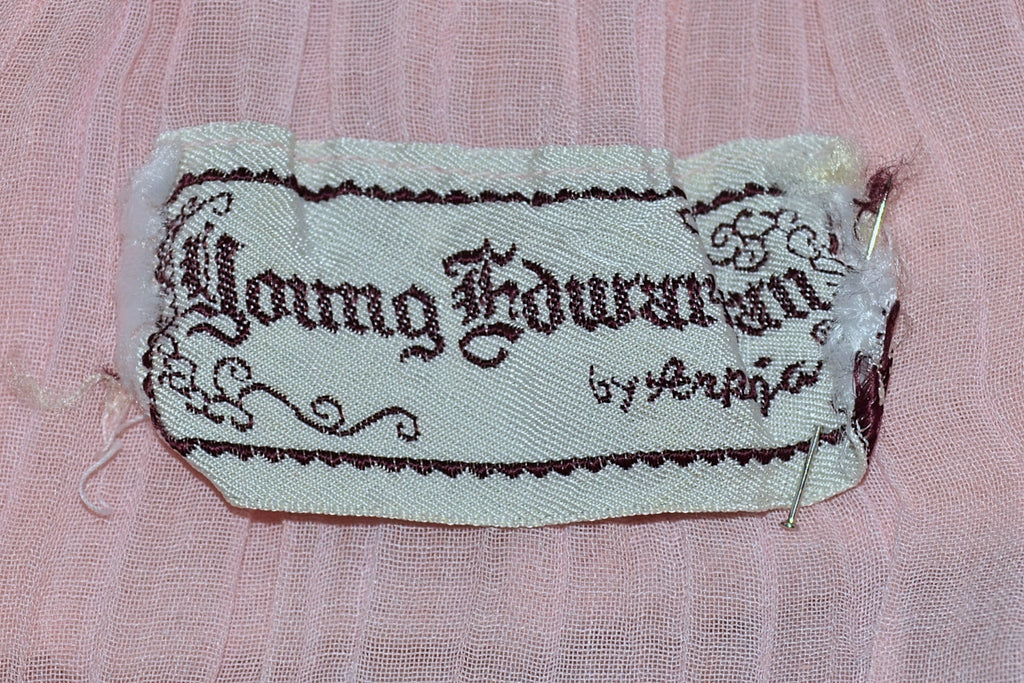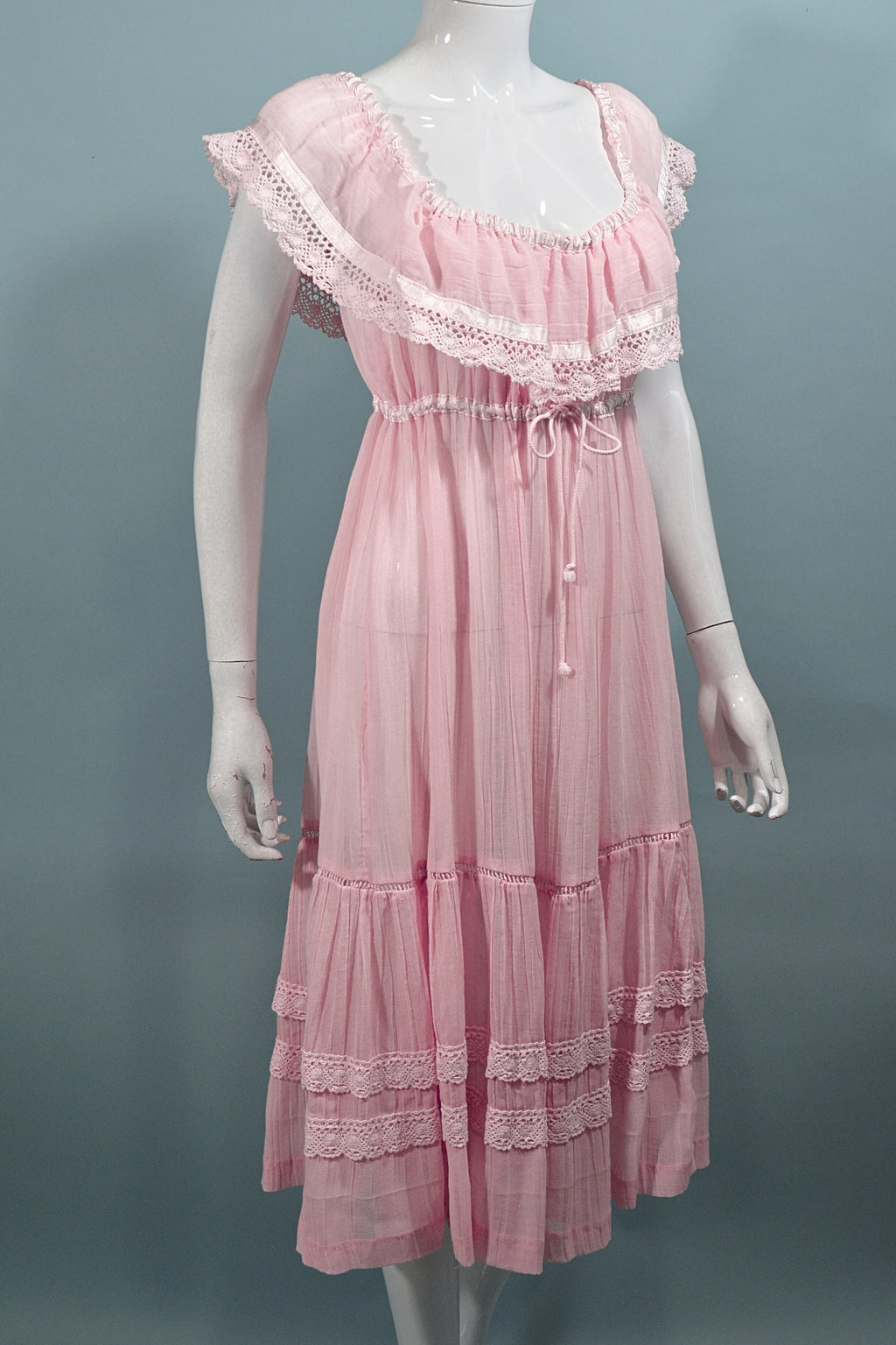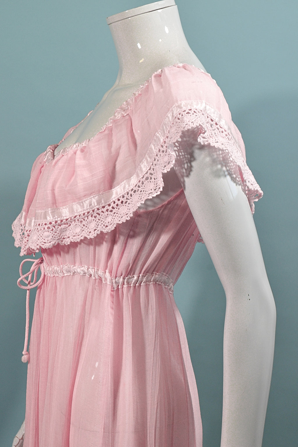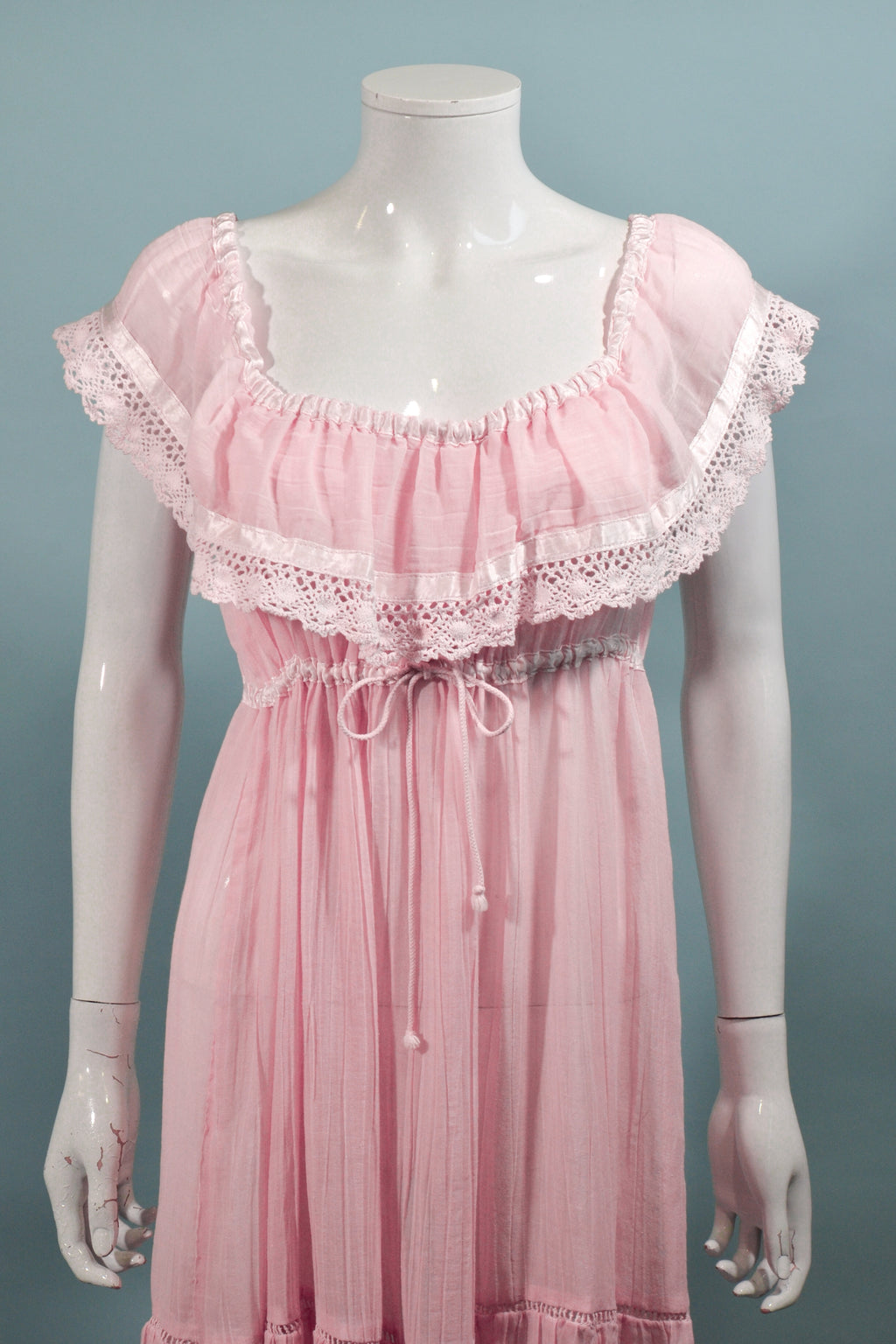 Soft pink lightweight gauze empire waist dress with ruffle neckline.