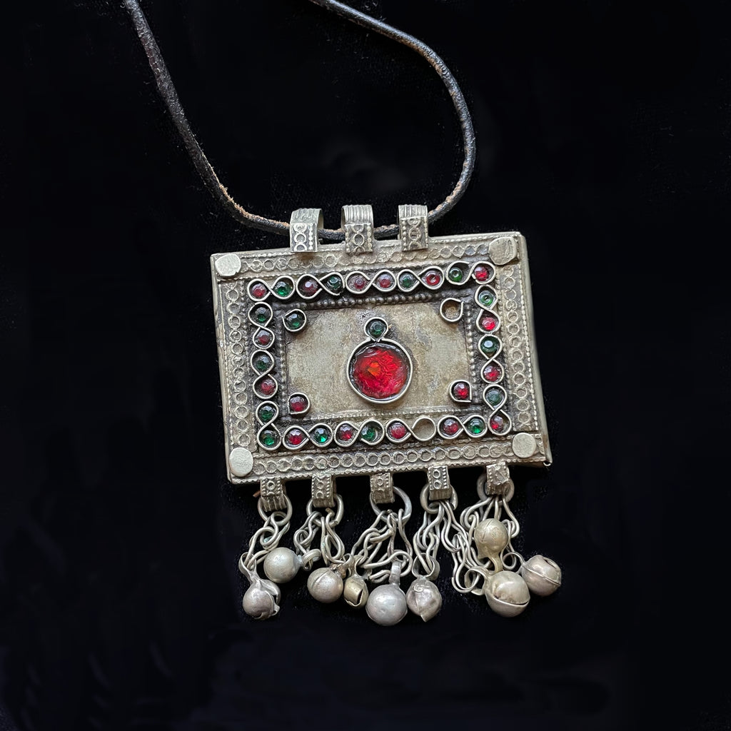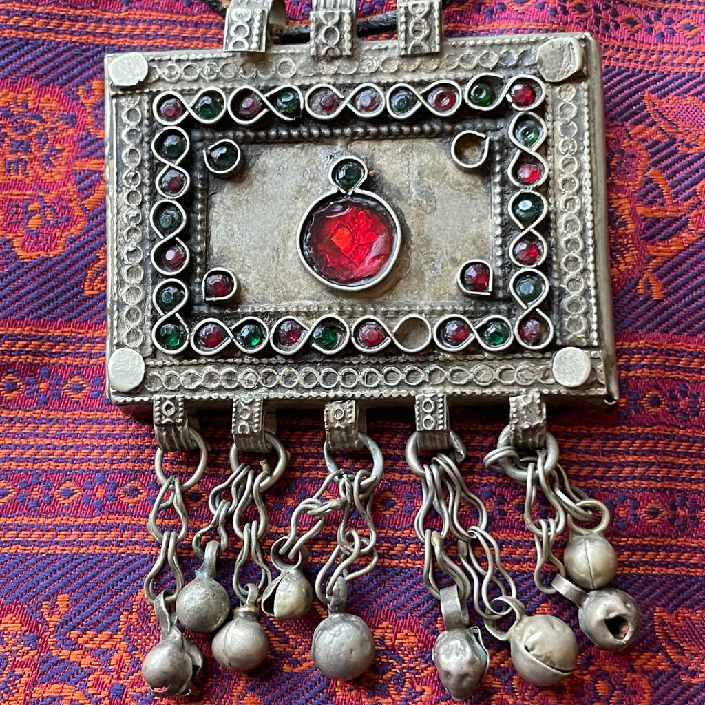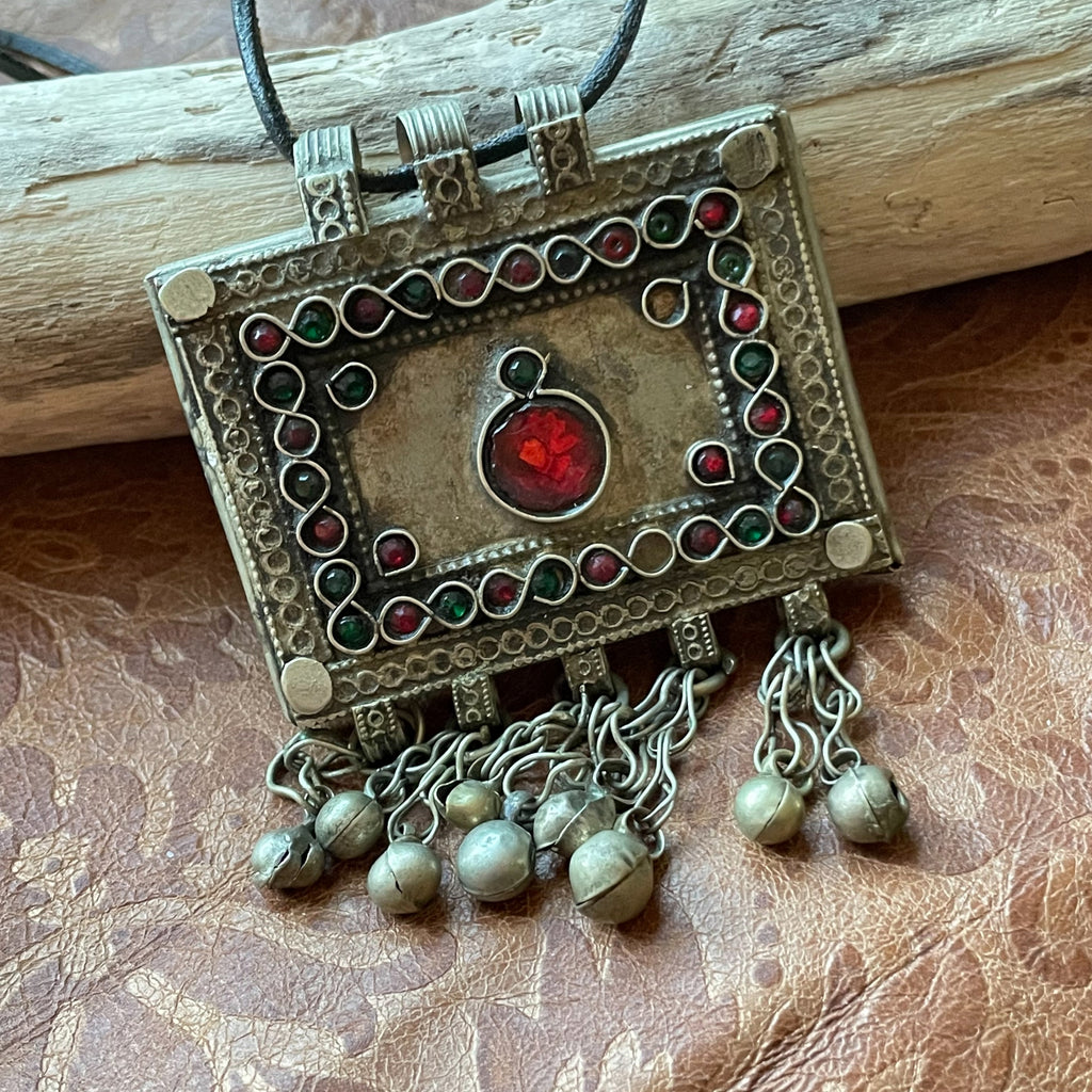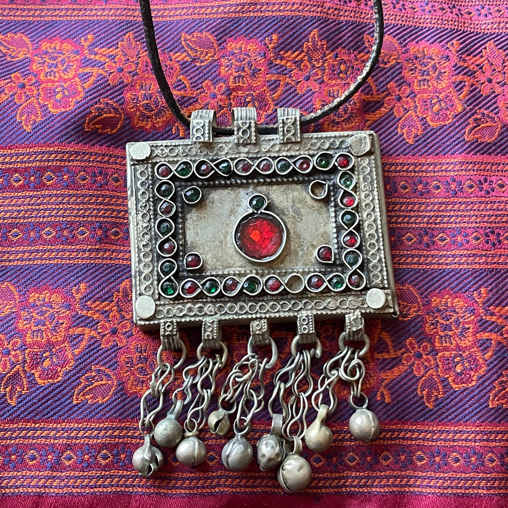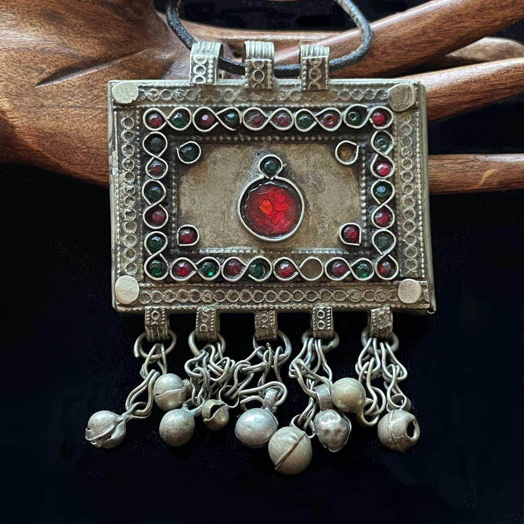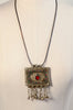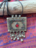 Vintage Afghani handcrafted silver-tone metal pendant, hand stamped accented with red and green glass beads and metal tassels.