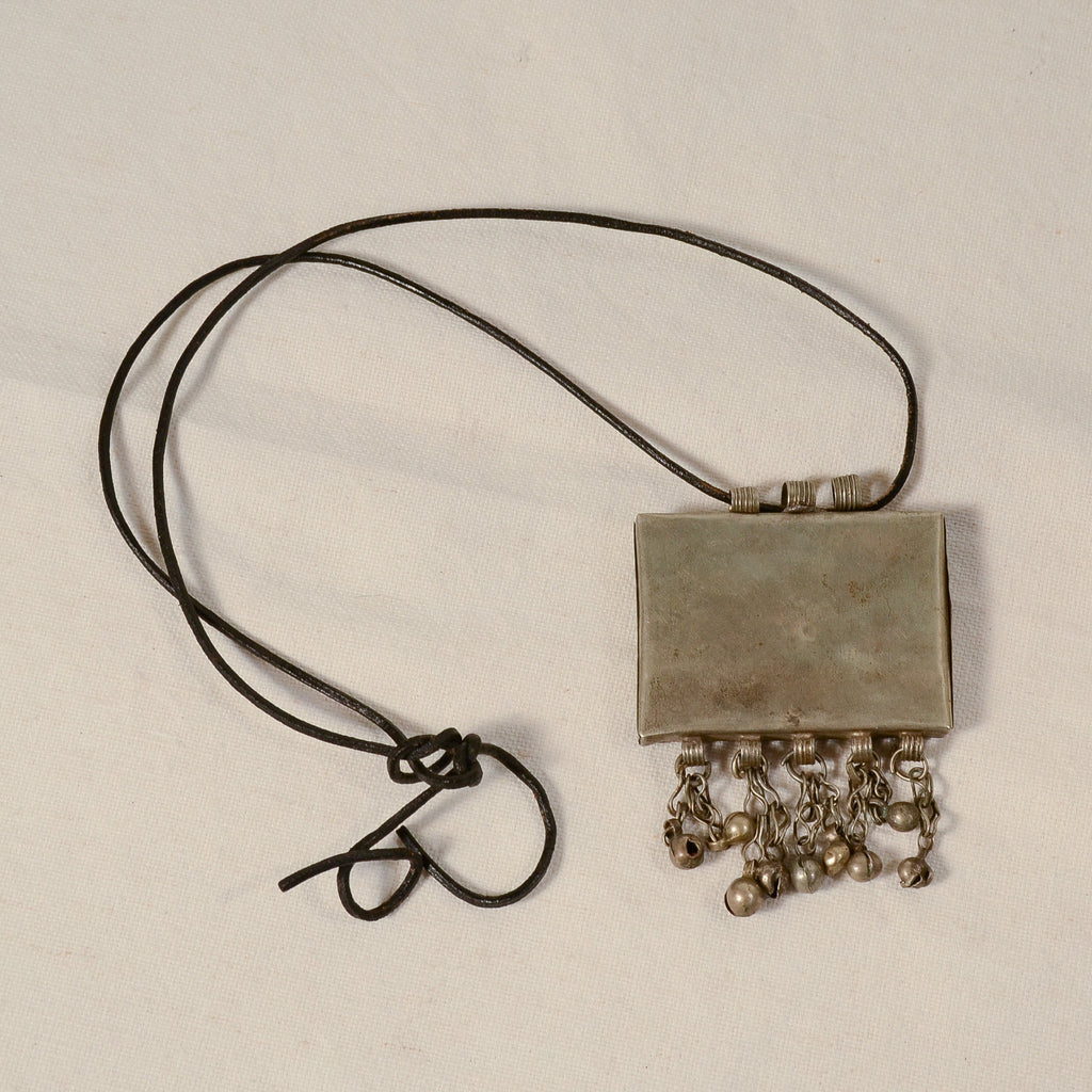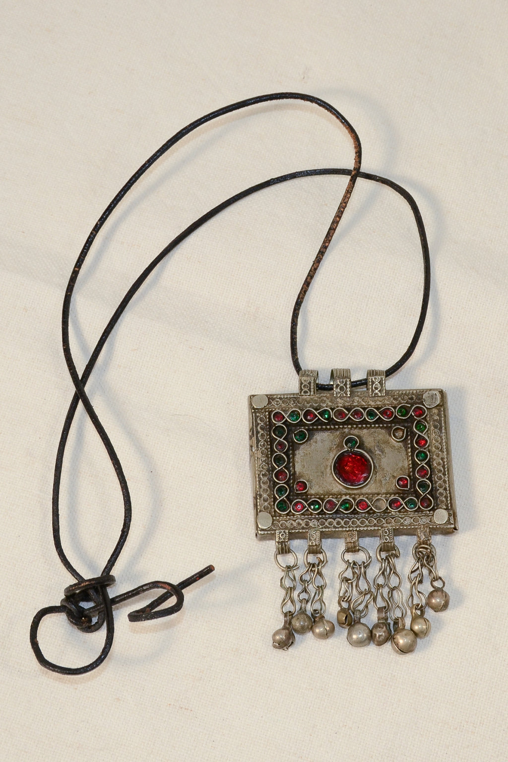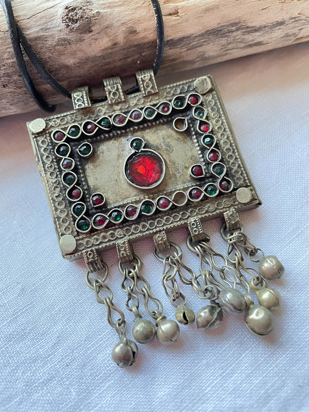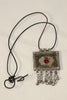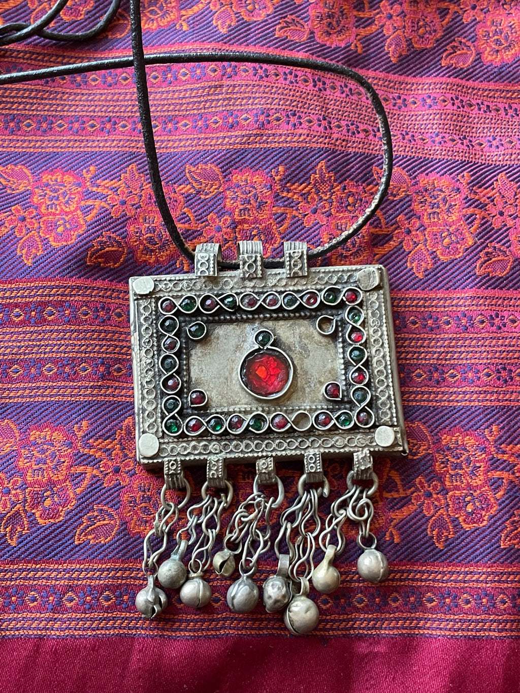 Vintage Afghani handcrafted silver-tone metal pendant, hand stamped accented with red and green glass beads and metal tassels.