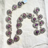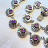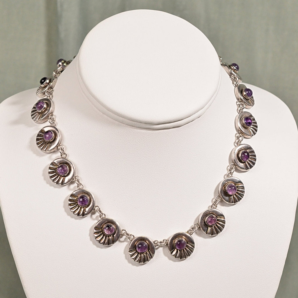 Vintage Fred Davis sterling silver necklace with cabochon set amethysts. The stones are set into repousse discs in a stylized sunrise pattern. There are 20 discs and amethyst stones connected by chain links.