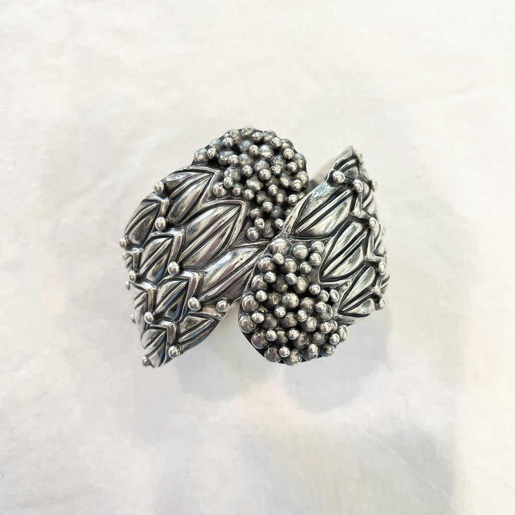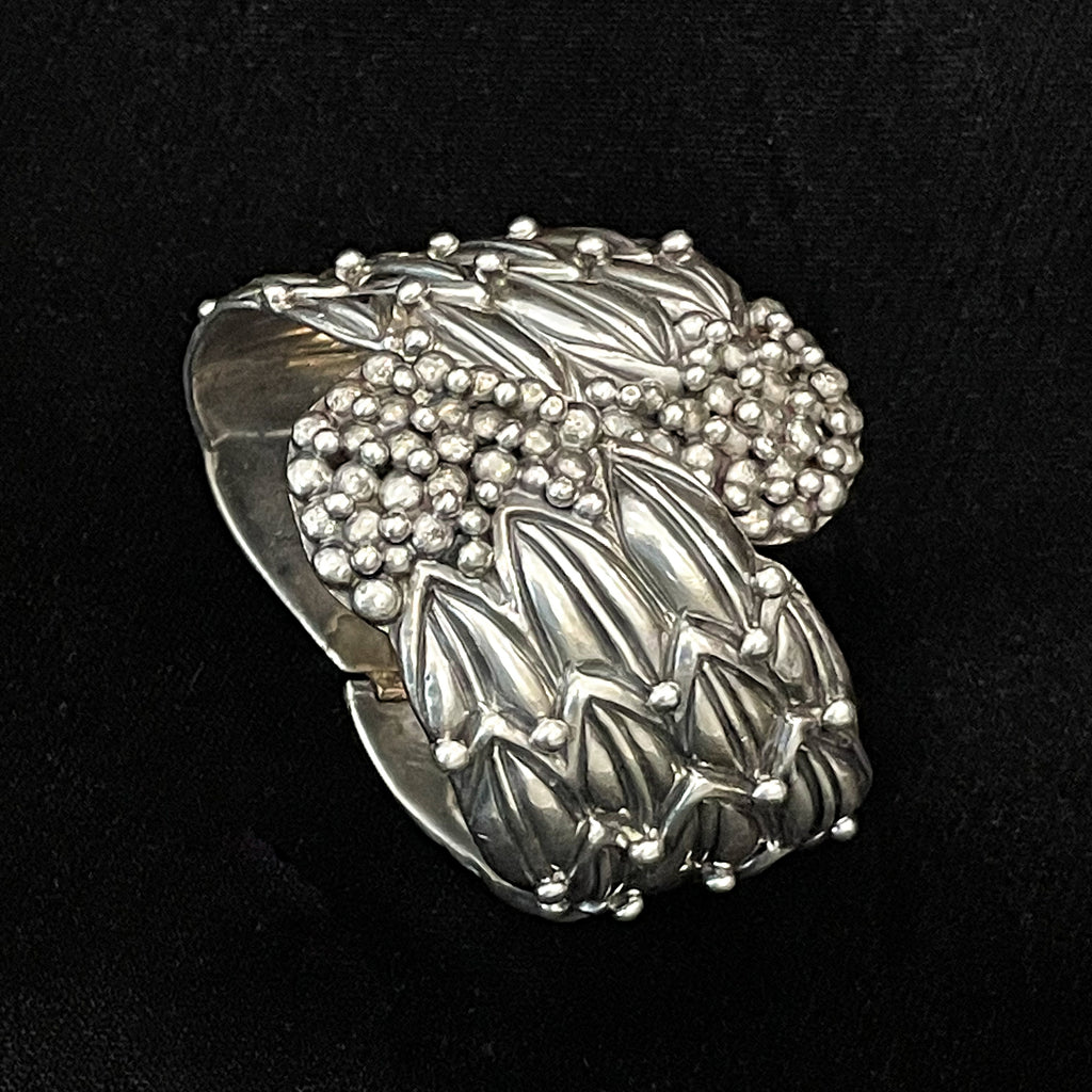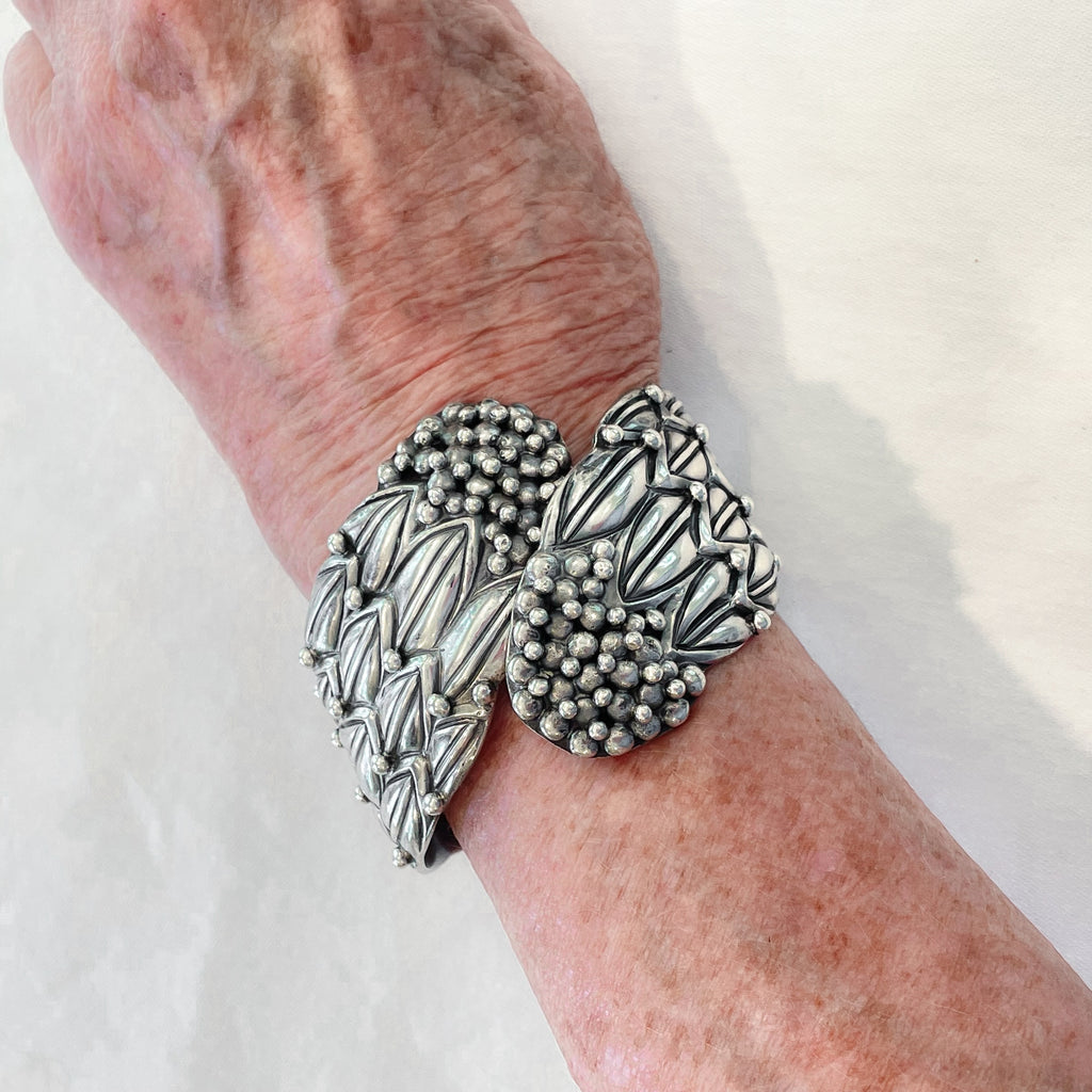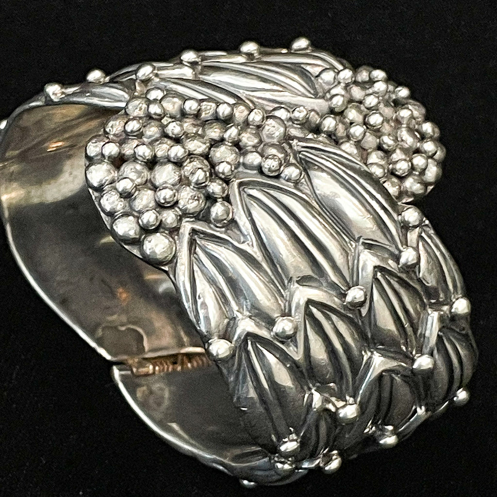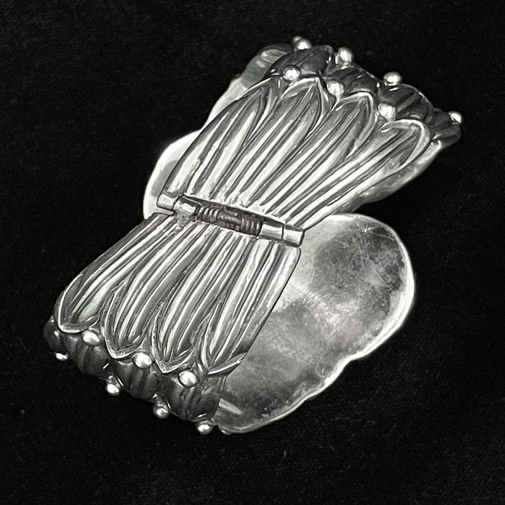 Margot De Taxco sterling silver spring hinge clamper cuff bracelet.