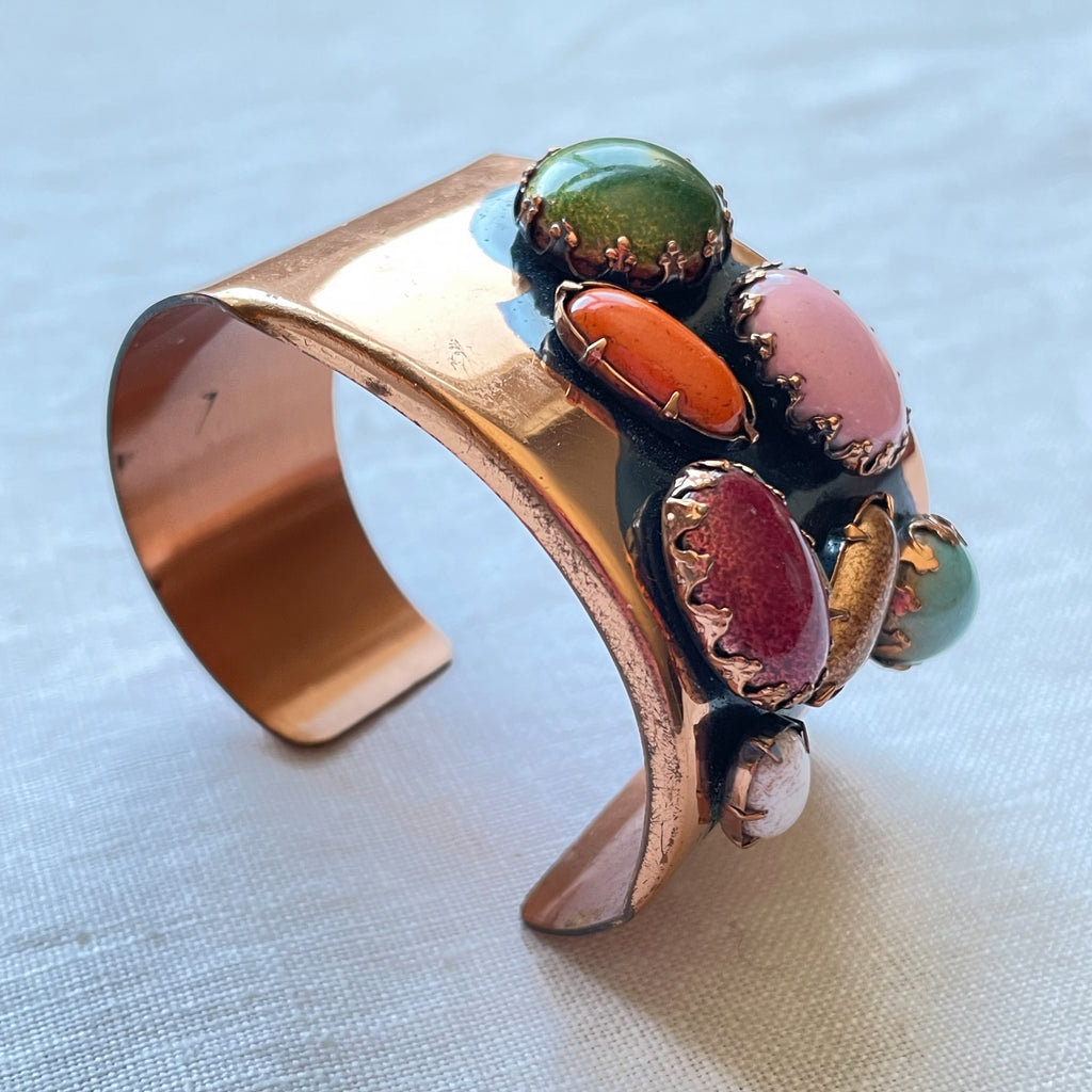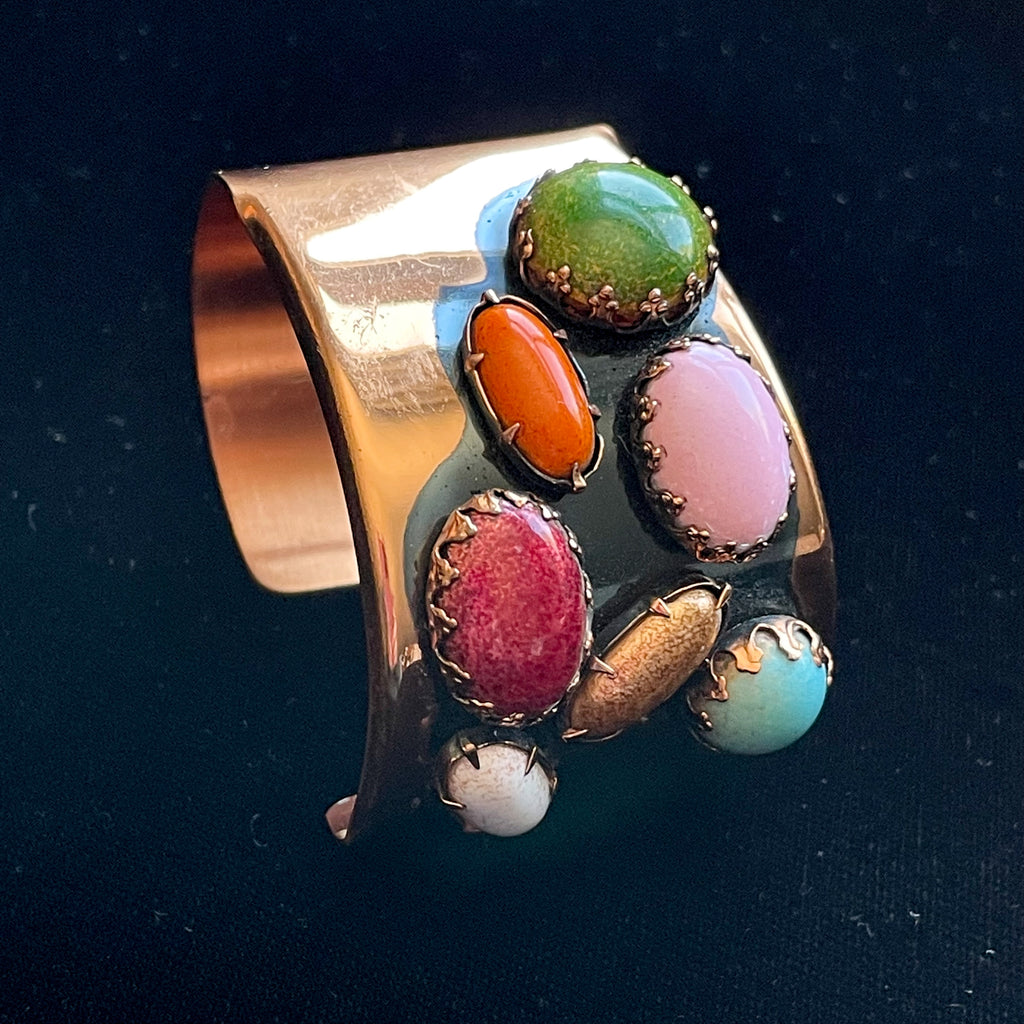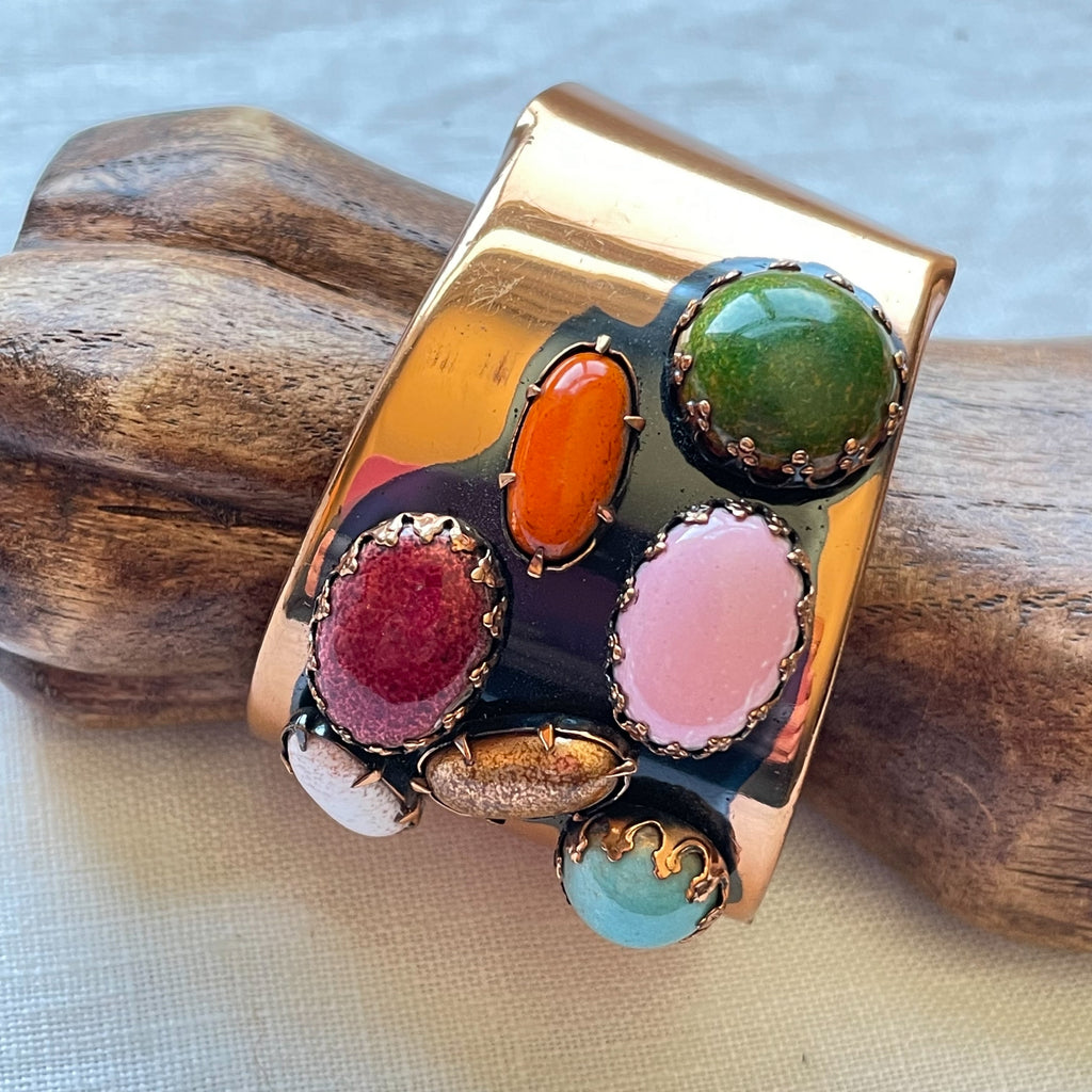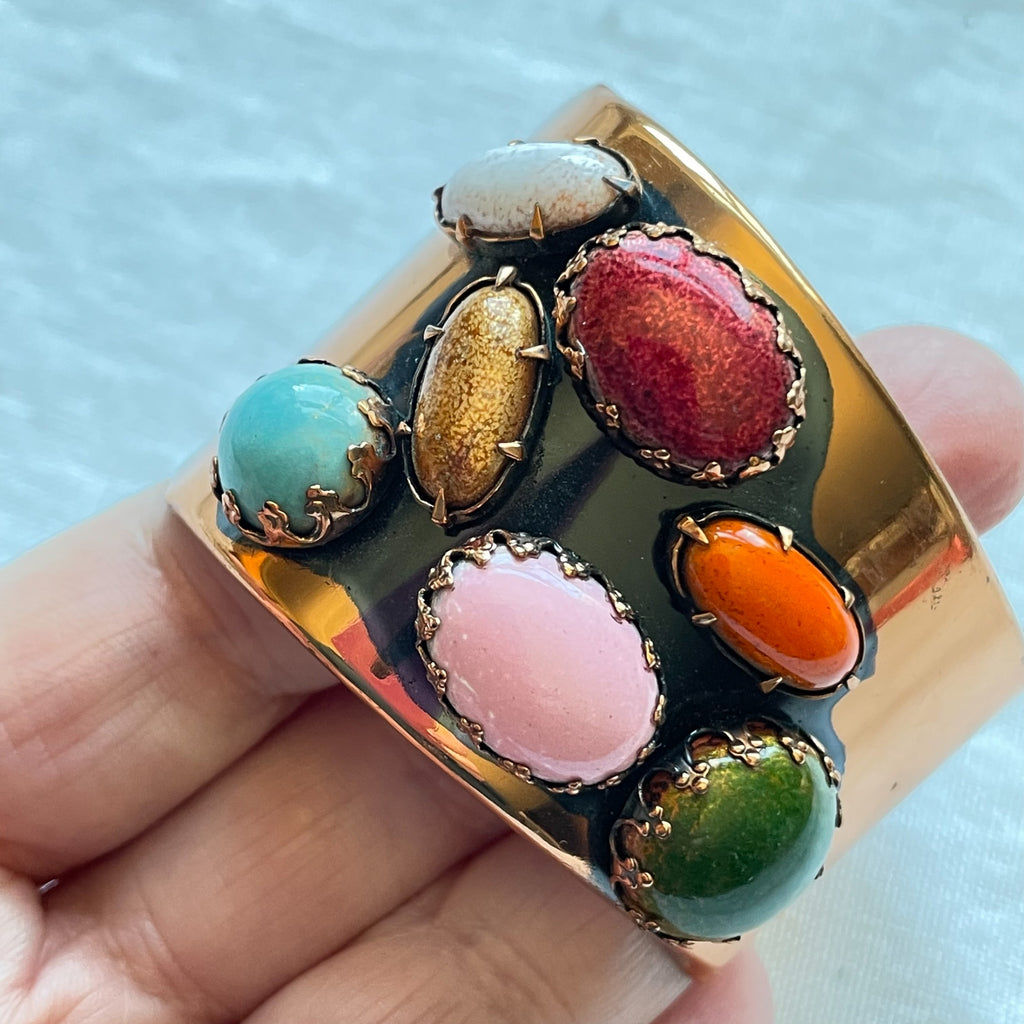 Vintage 60s handcrafted cuff bracelet with large colorful prong set costume jewels.