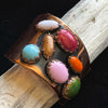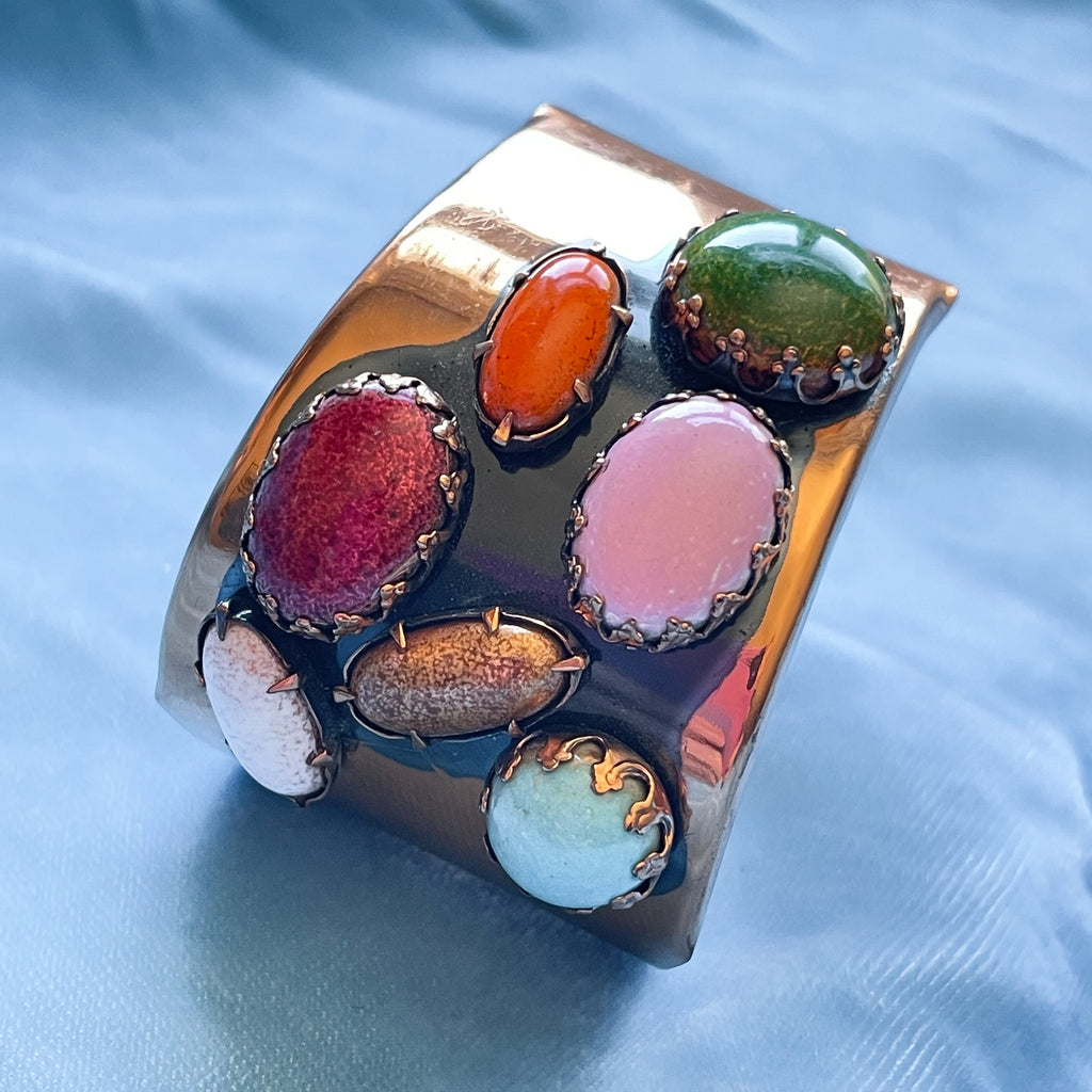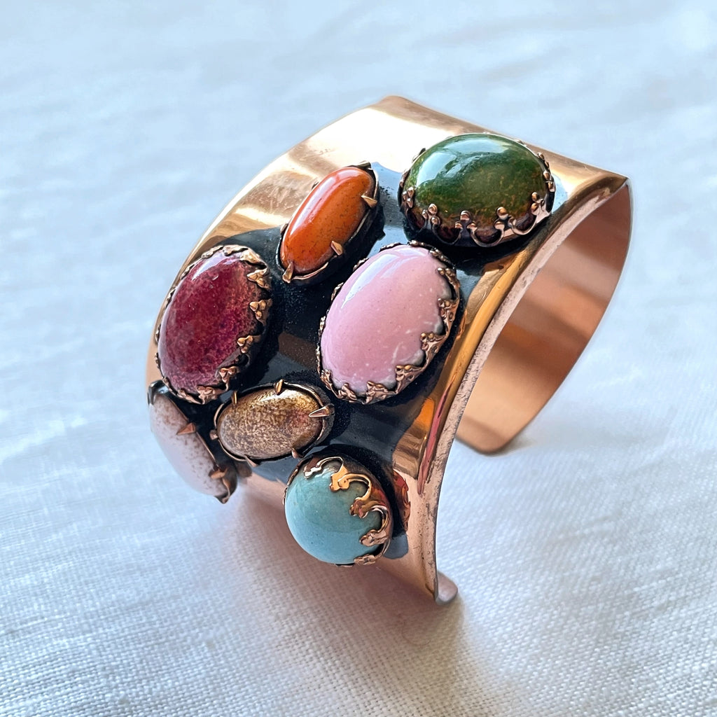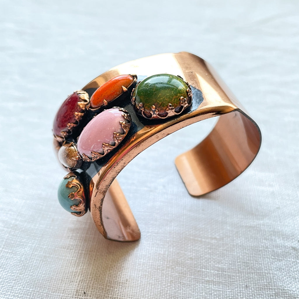 Vintage 60s handcrafted cuff bracelet with large colorful prong set costume jewels.