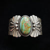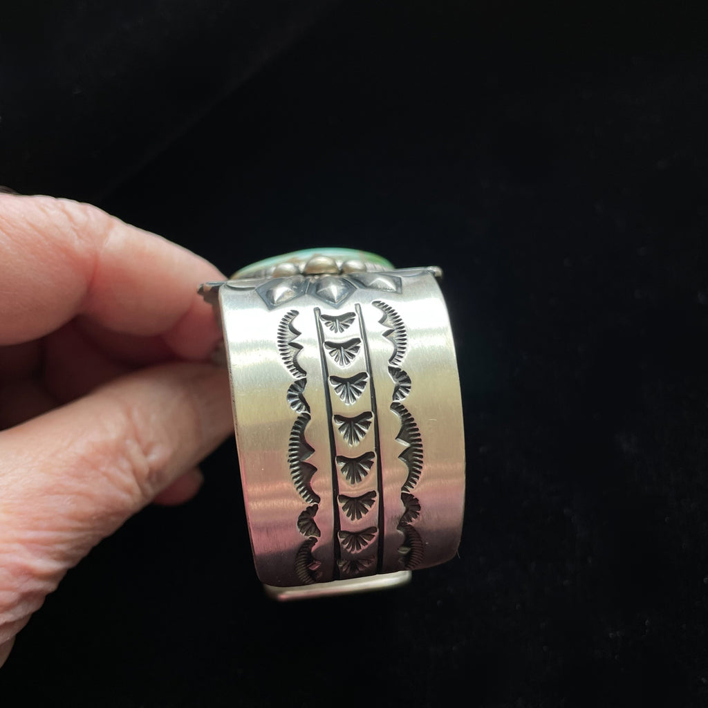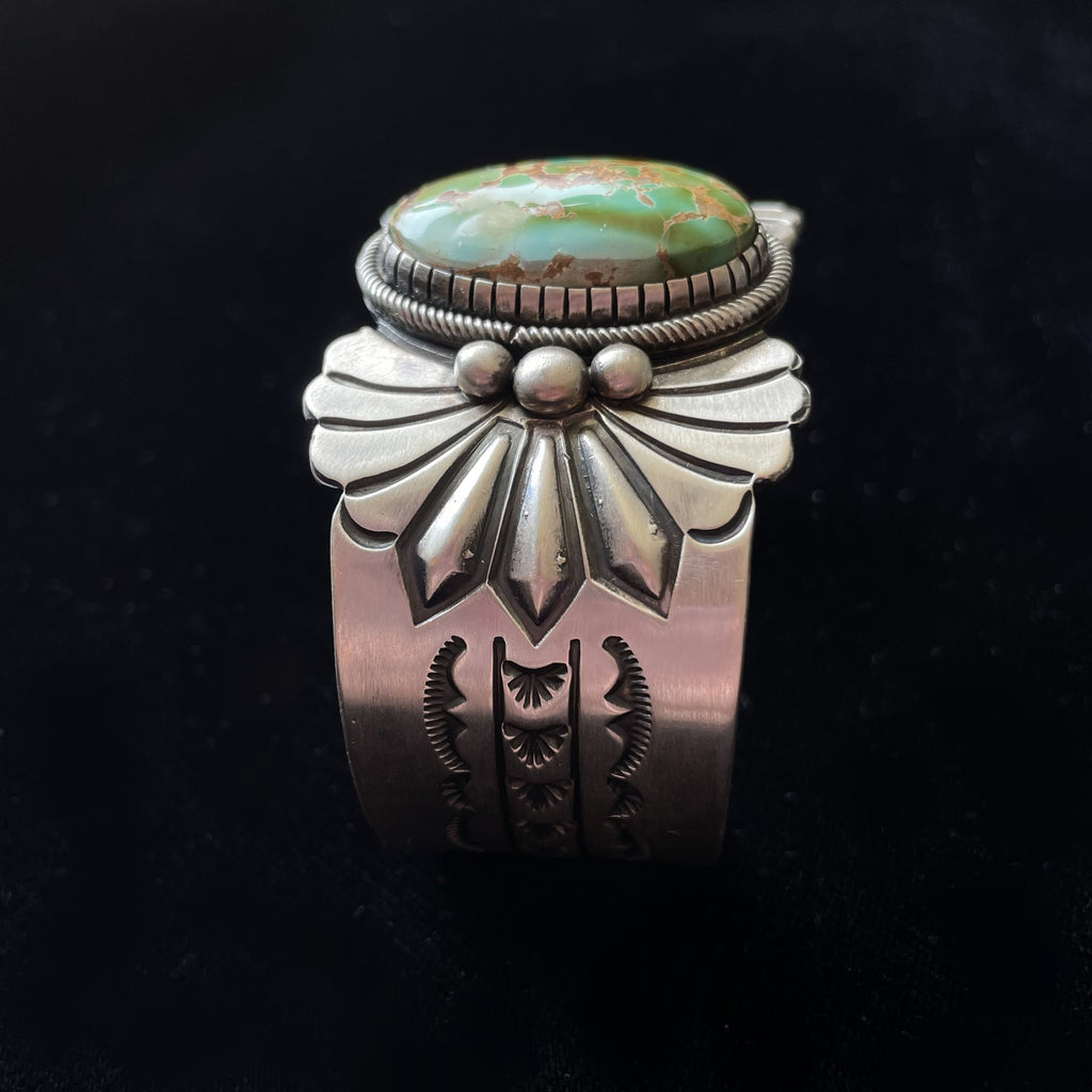 Gorgeous sterling silver Navajo cuff bracelet with turquoise stone in the center.