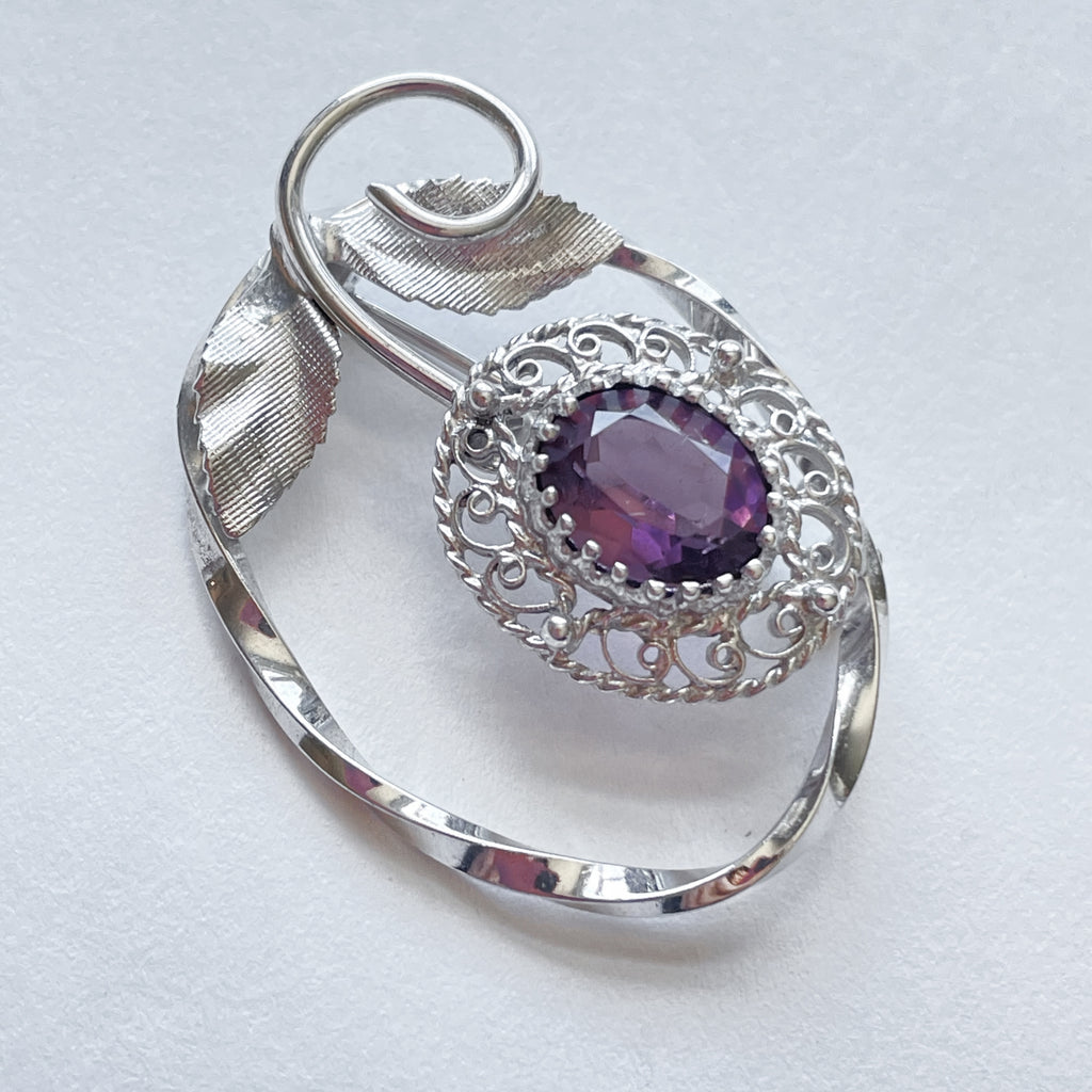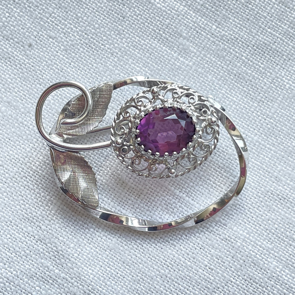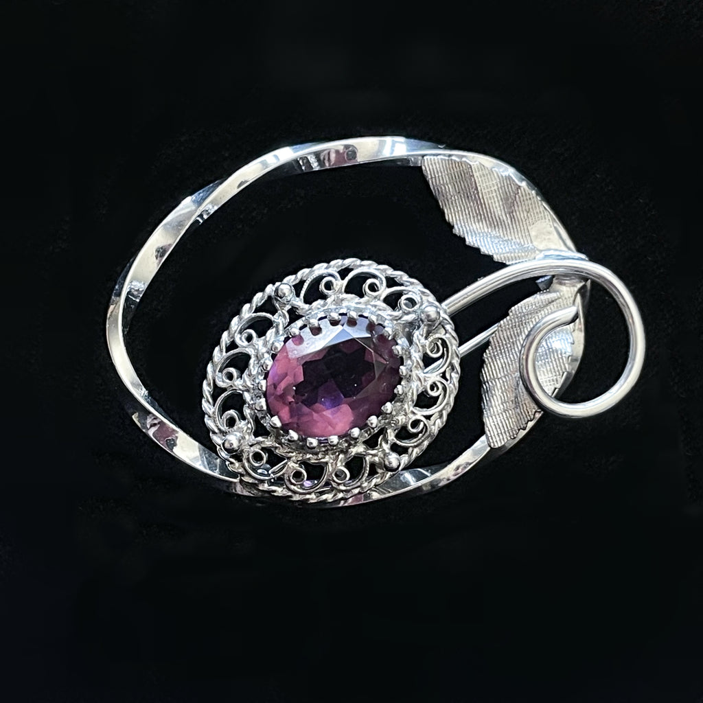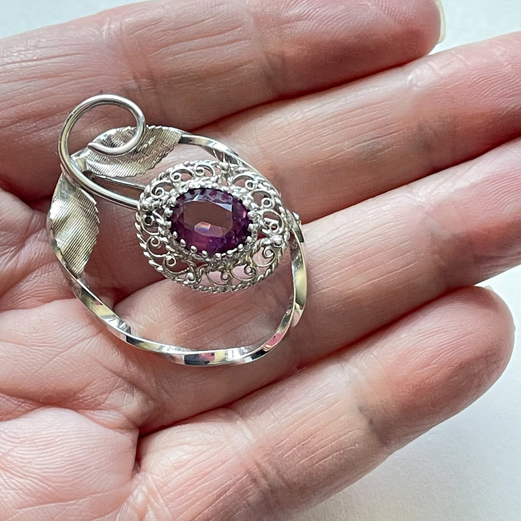 Vintage sterling silver brooch with amethyst stone surrounded by filigree prong setting.