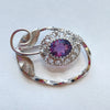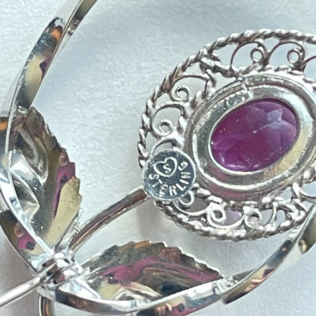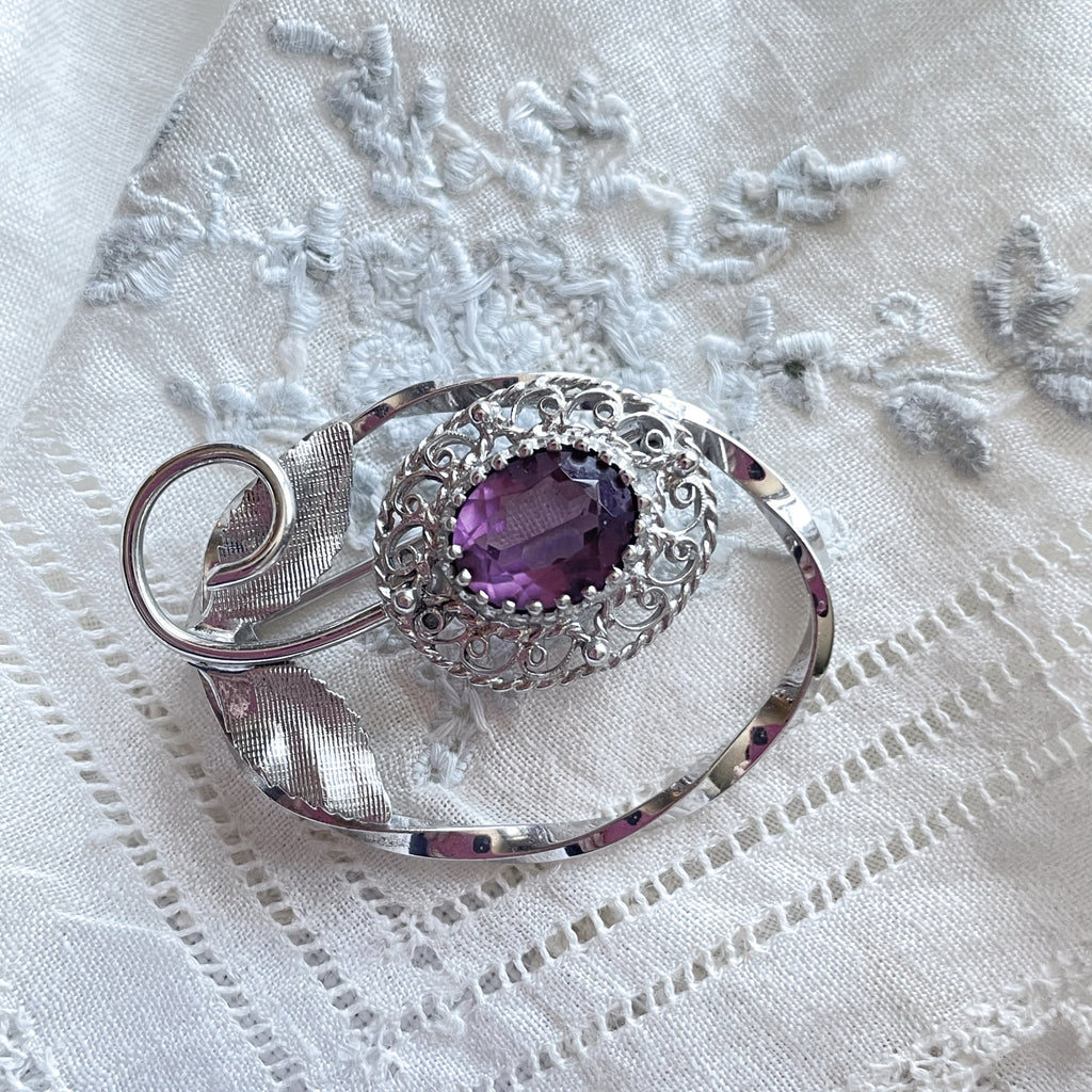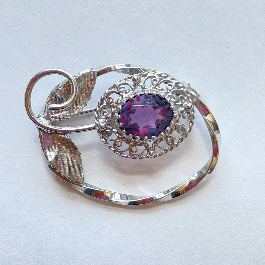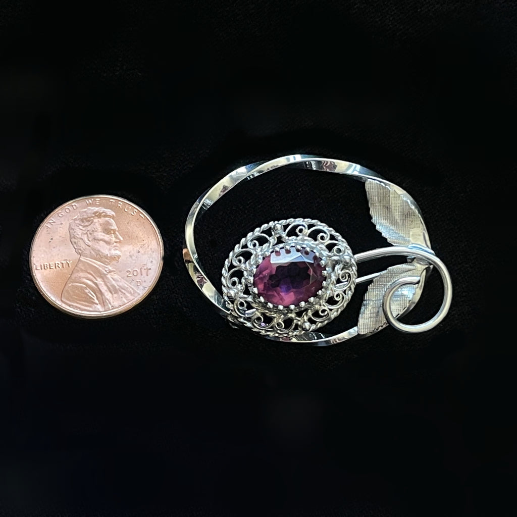 Vintage sterling silver brooch with amethyst stone surrounded by filigree prong setting.