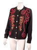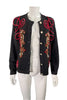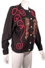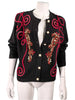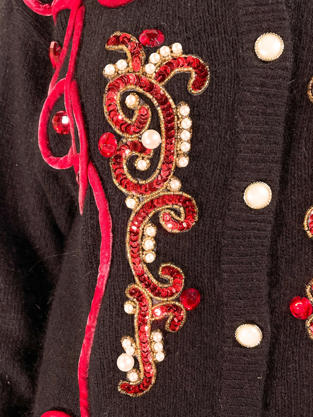 Large jewels, raised velvet cord trim, faux pearl/gold buttons up the front.