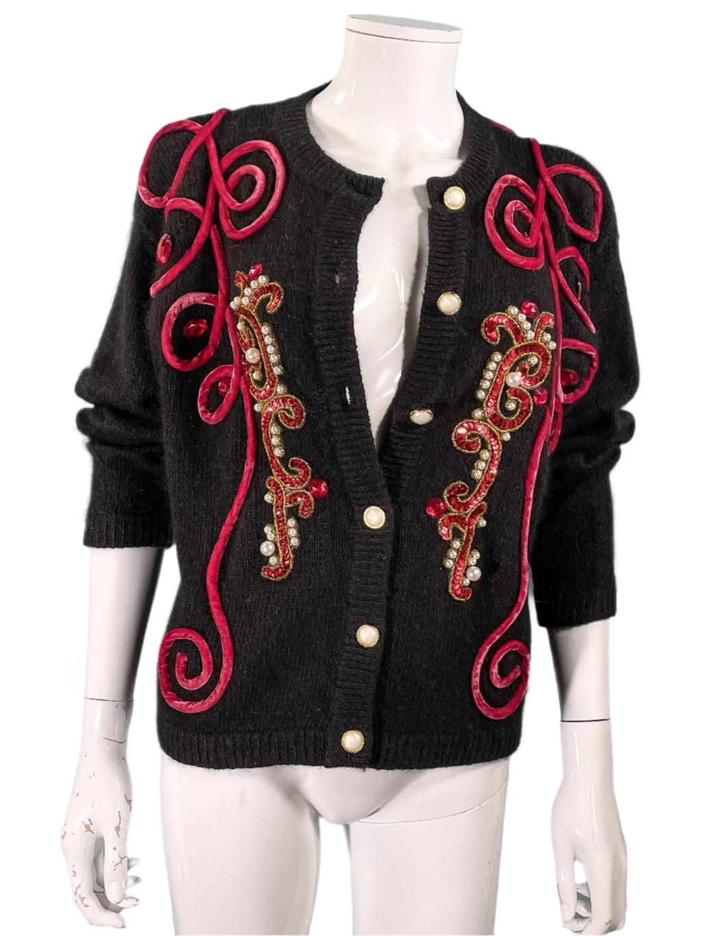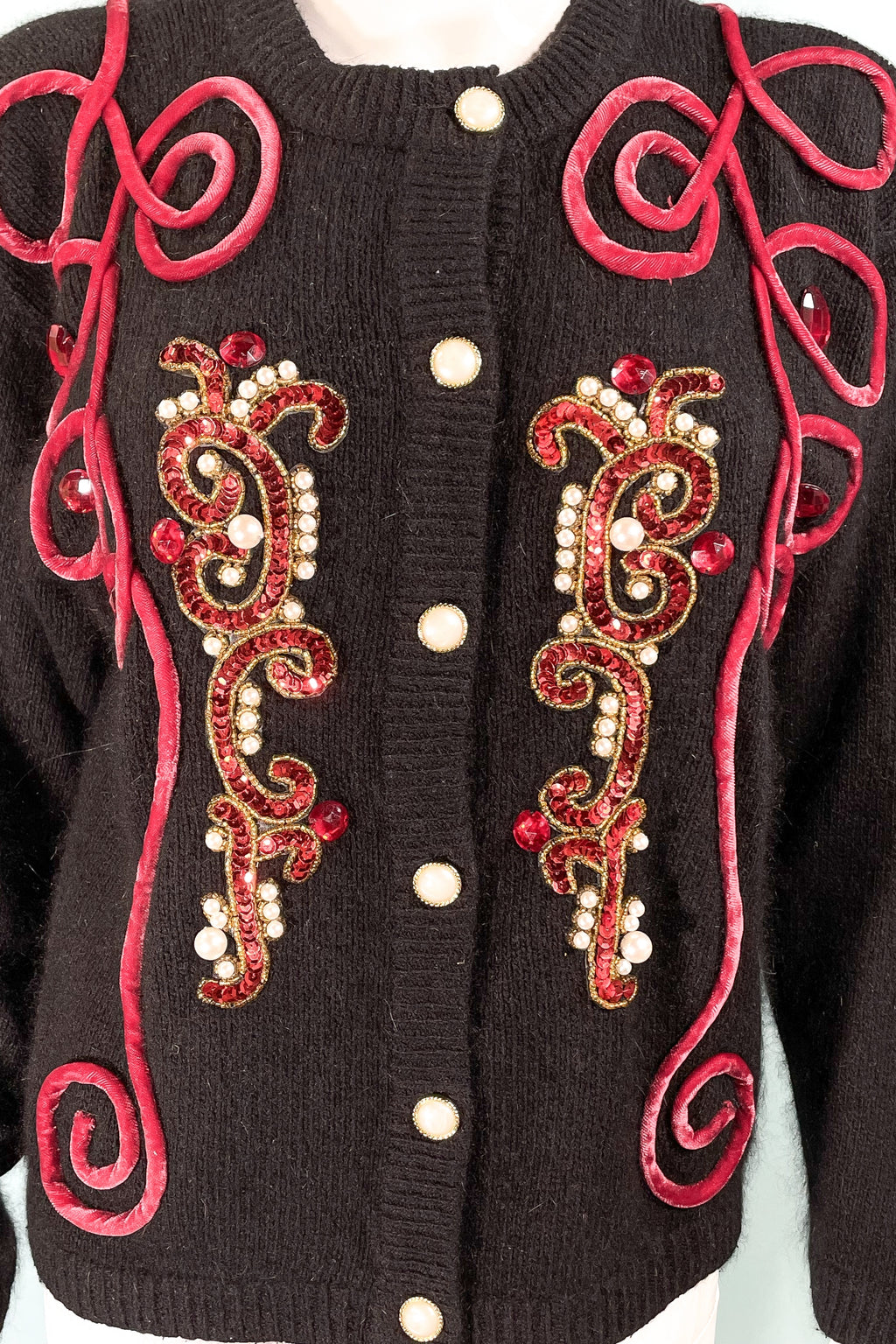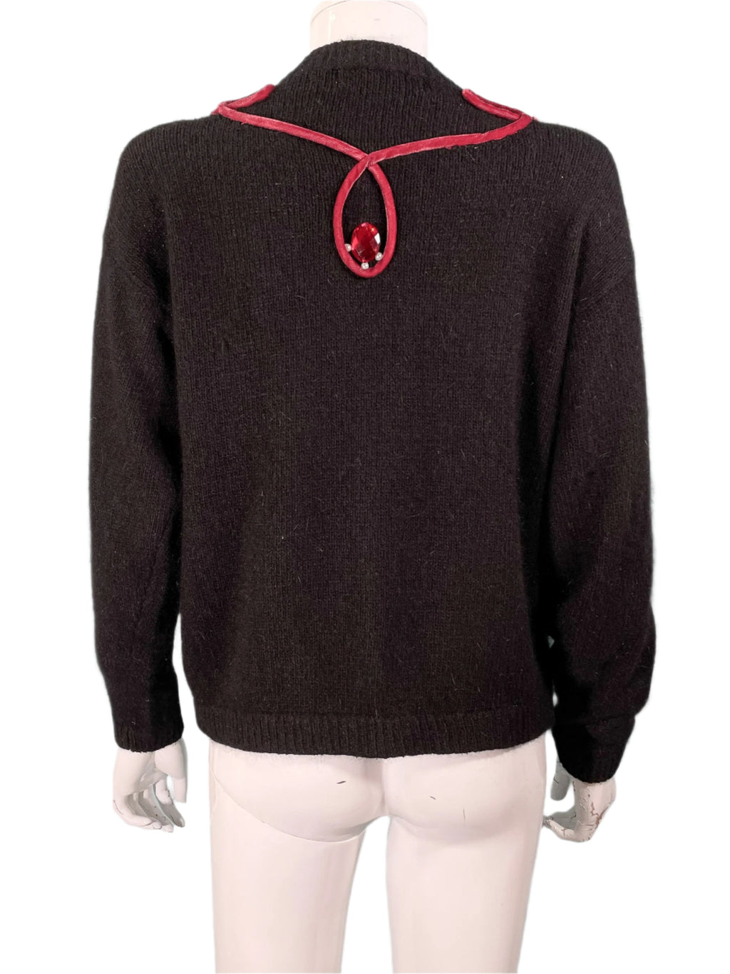 Tony Lambert Collection black angora sweater with jewels & velvet trim.