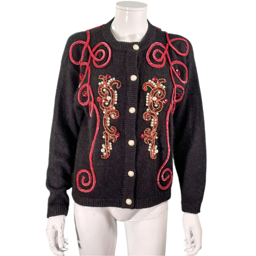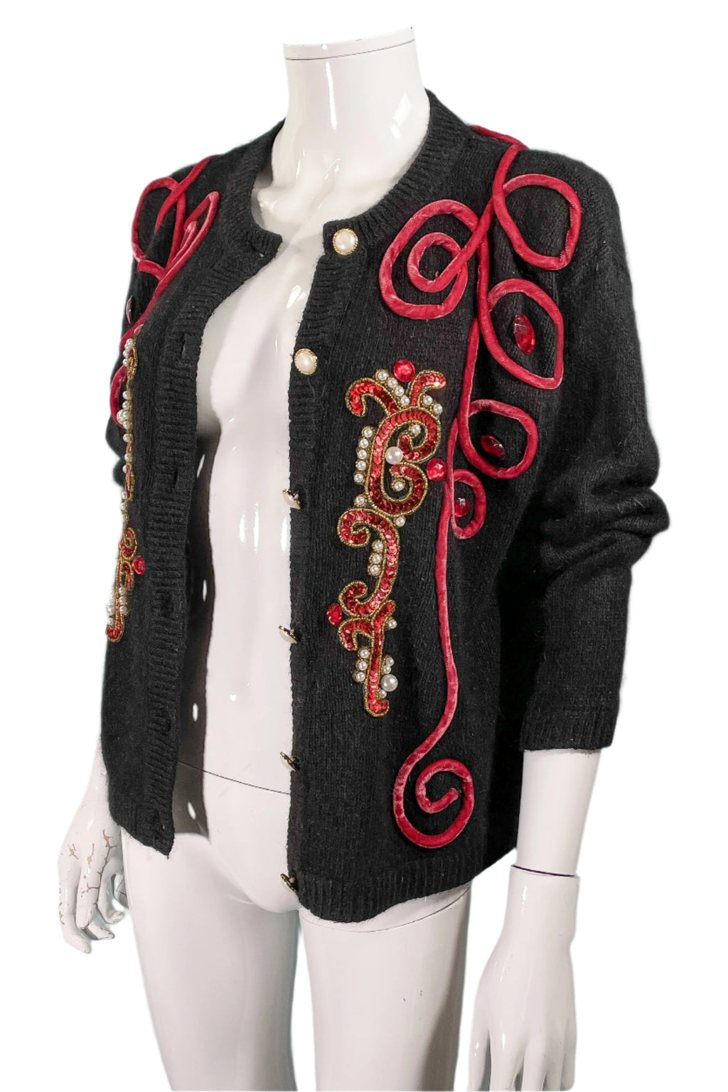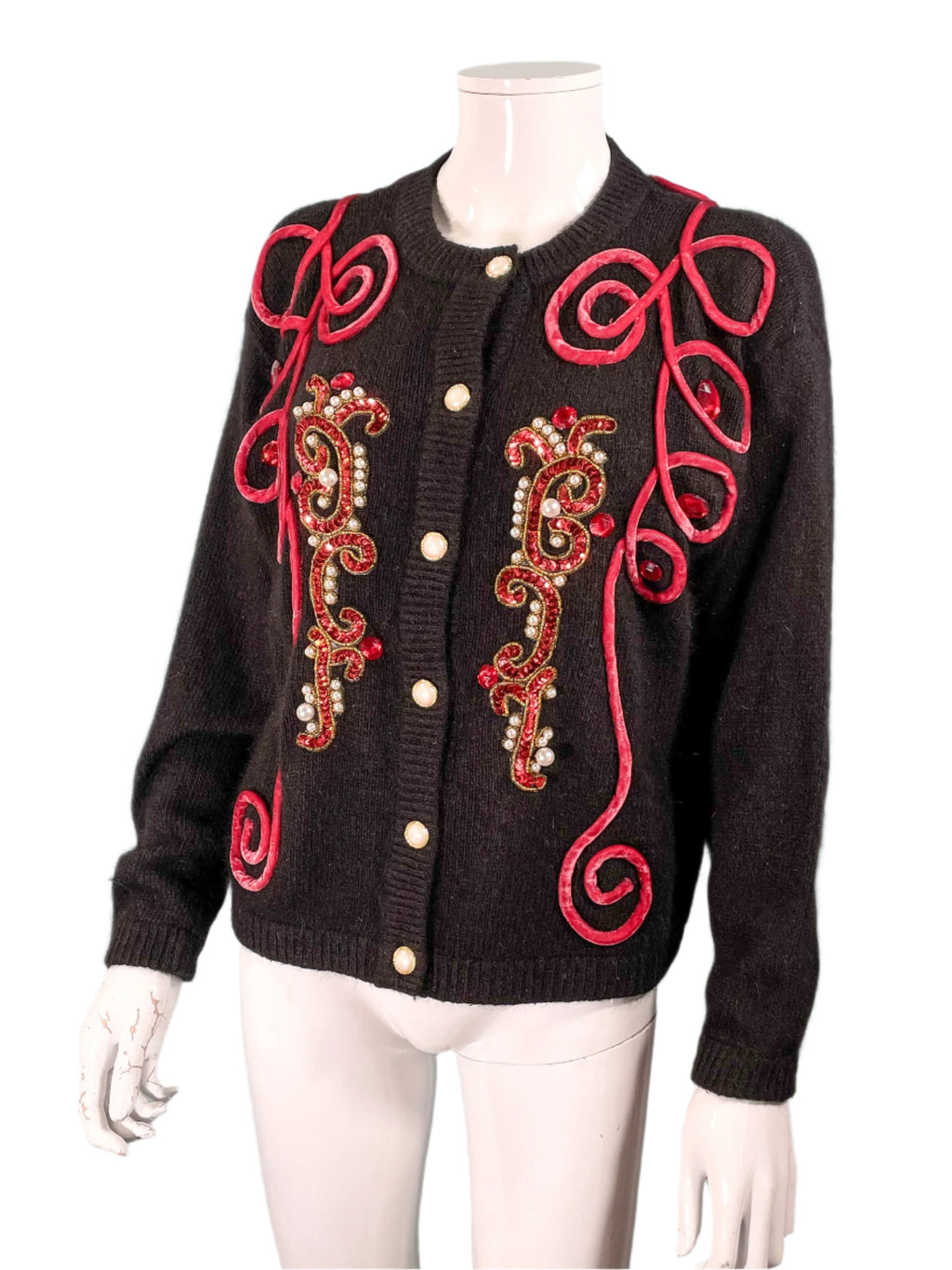 Tony Lambert Collection black angora sweater with jewels & velvet trim.