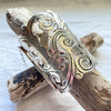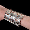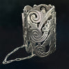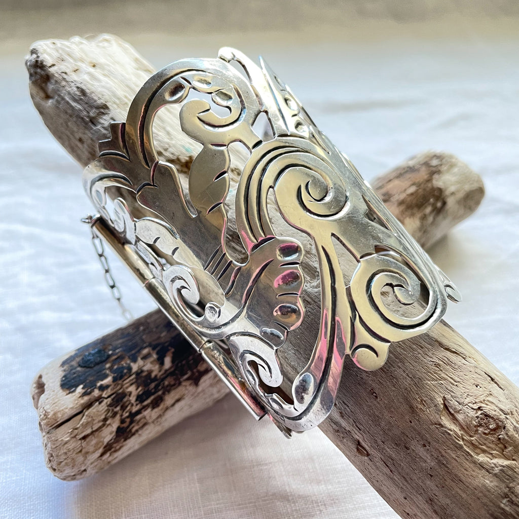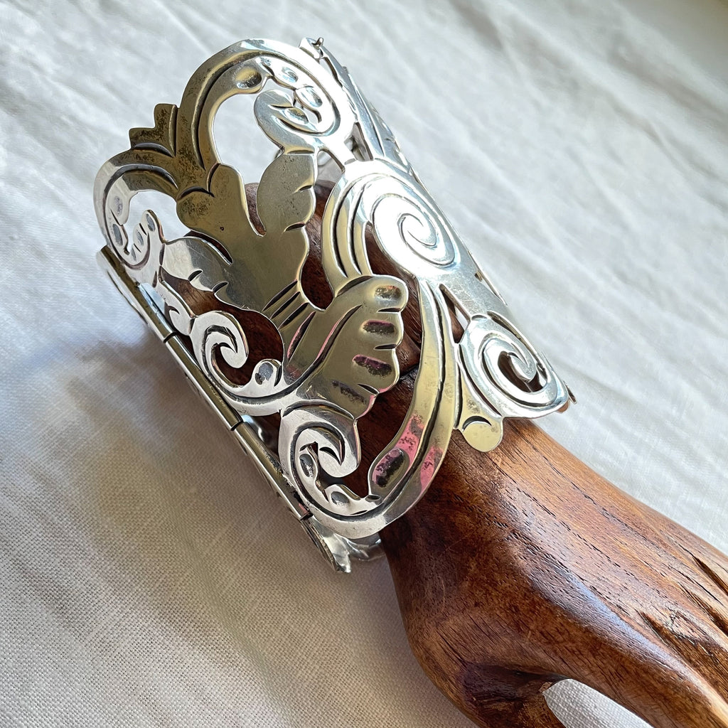 Beautiful Sterling Silver repousse scrollwork design wide panel bracelet Mexican bracelet.