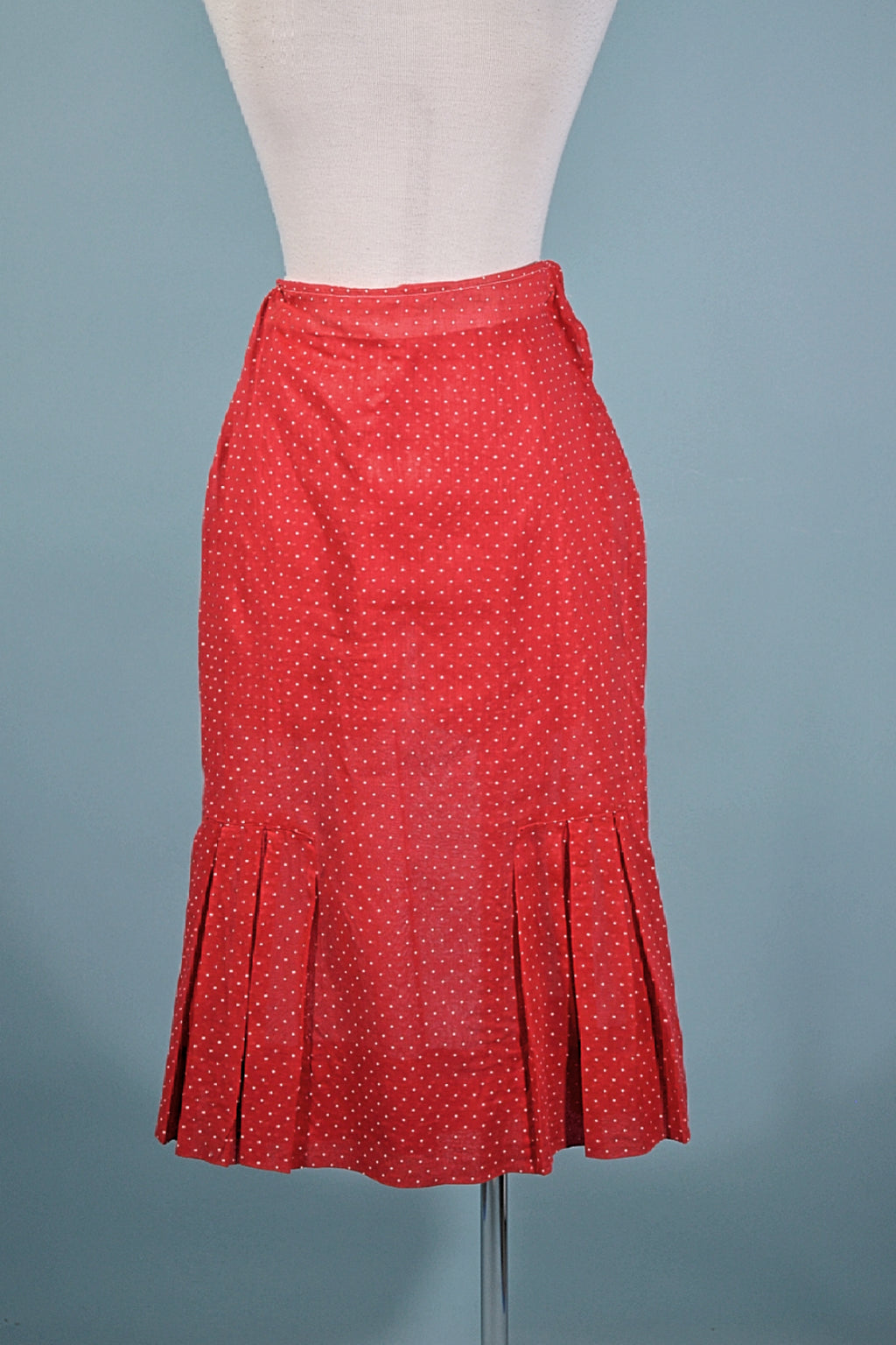 The skirt is a straight slim fit. There are pleats the front on either side near the hem. The back panel is flat. The closure is on the side with on snap and hook and eye.