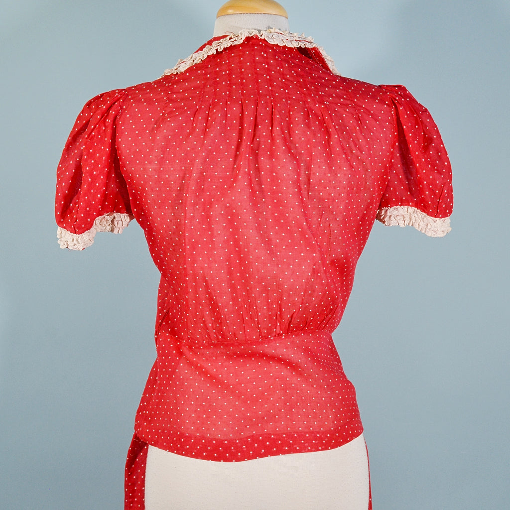 The blouse is fitted at the waist, accented with puff sleeves and lovely tiny lace details.