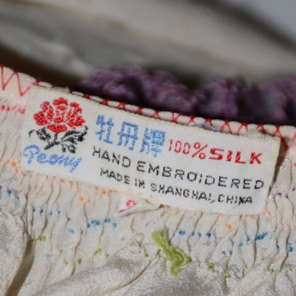 LABEL:  Peony, Hand Embroidered, Made in Shanghai China.