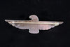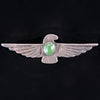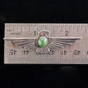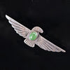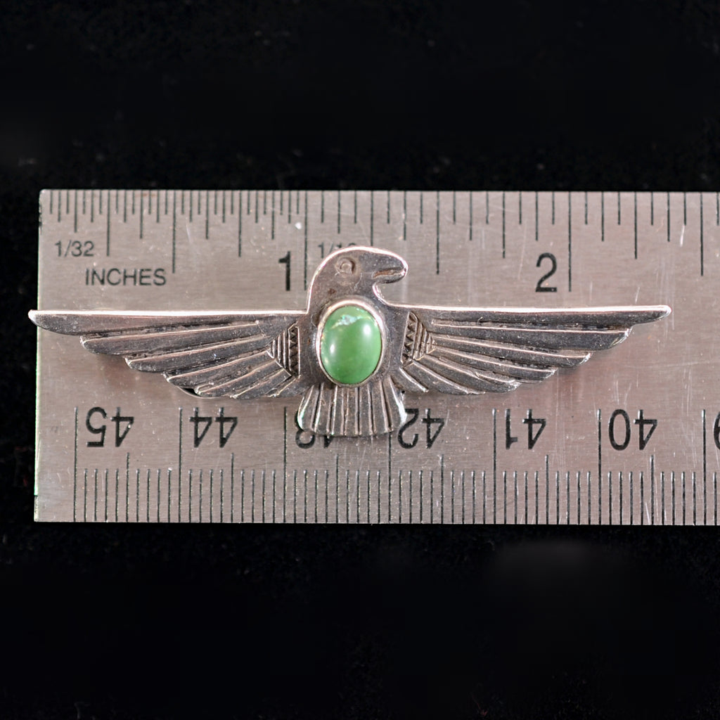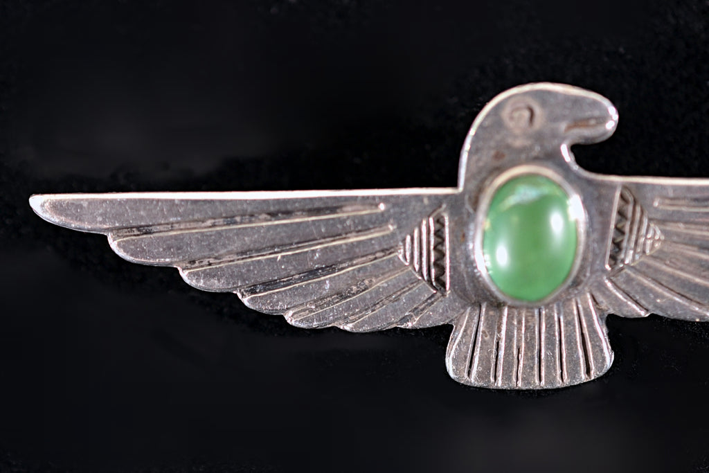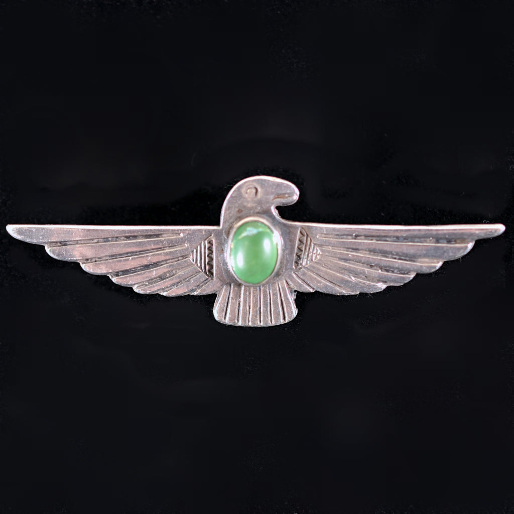 DESCRIPTION: Fred Harvey era silver brooch with a green turquoise stone in the center. Thunderbird design with stamped details.