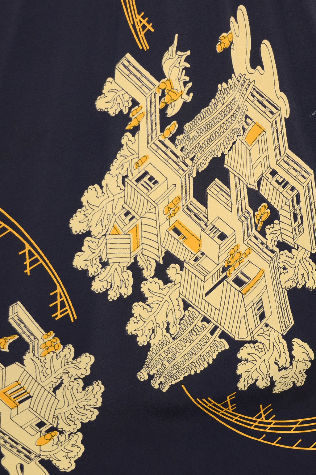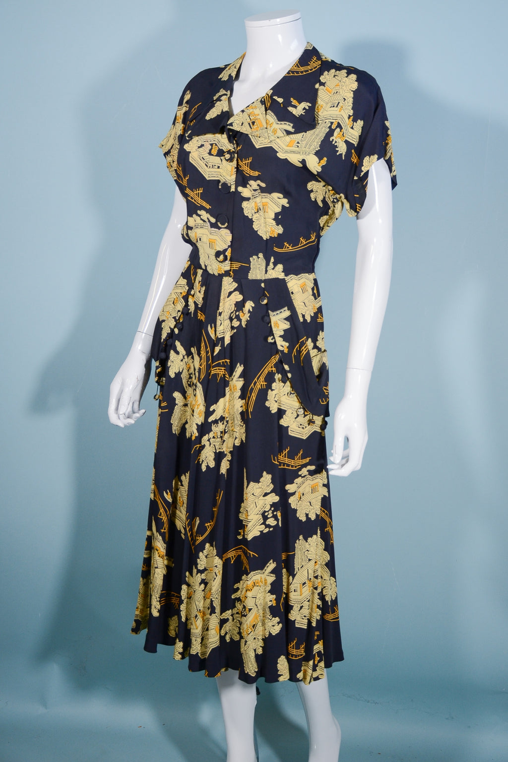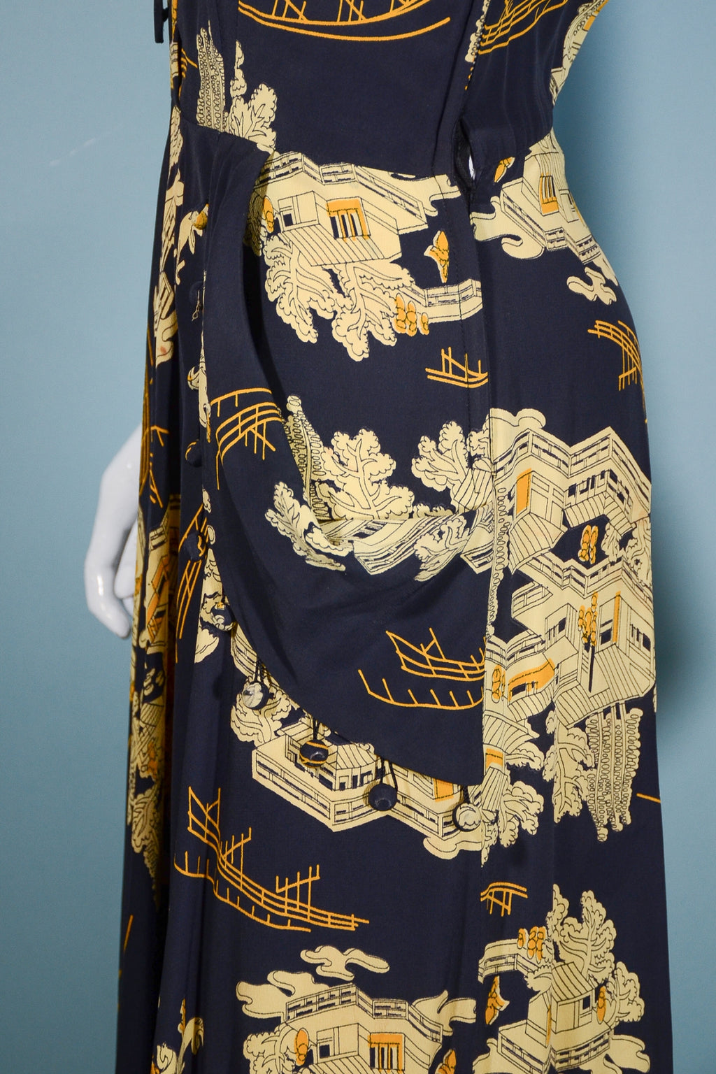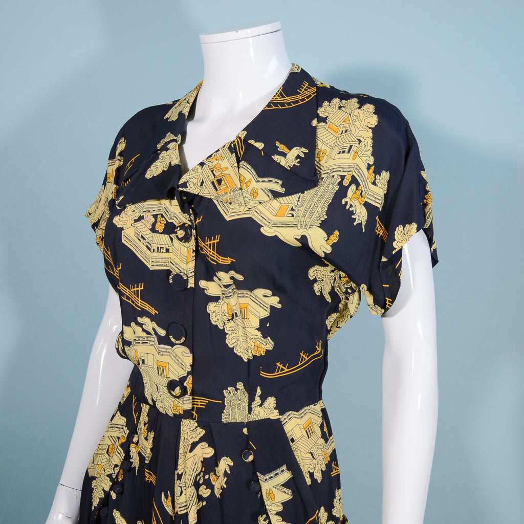 Lovely vintage 1940s print dress with Asian theme buildings and bridges.