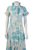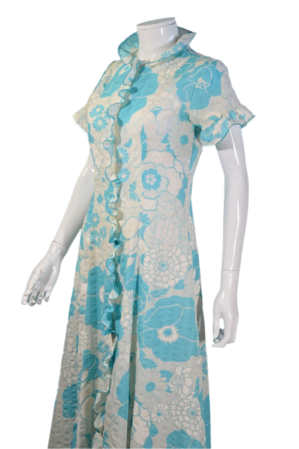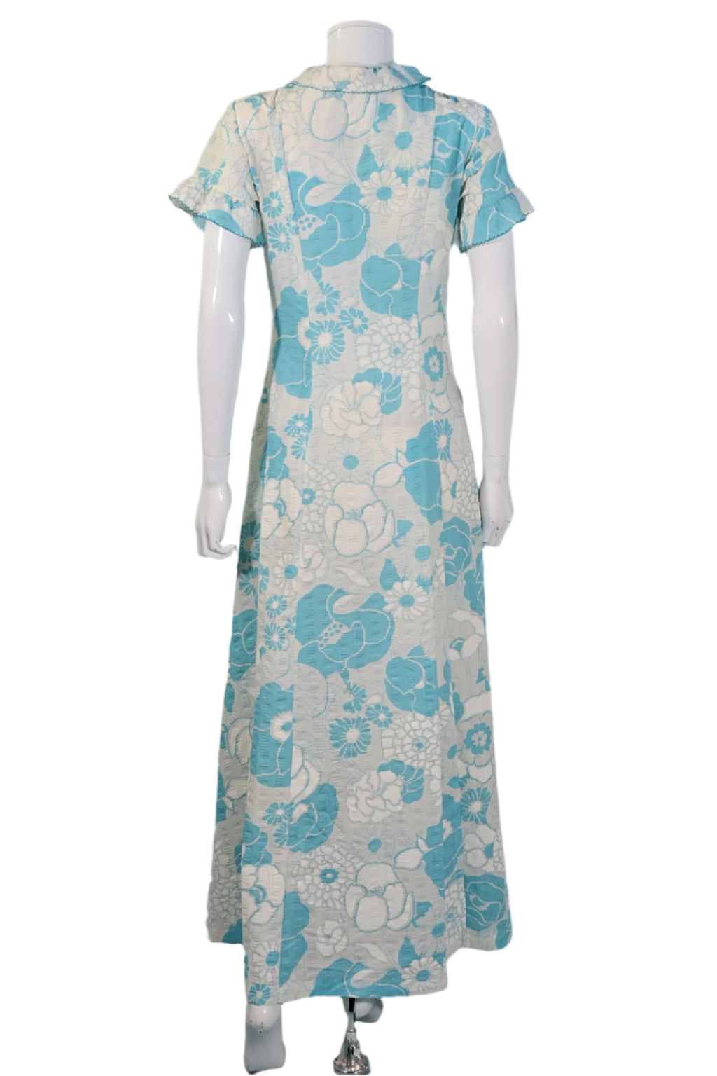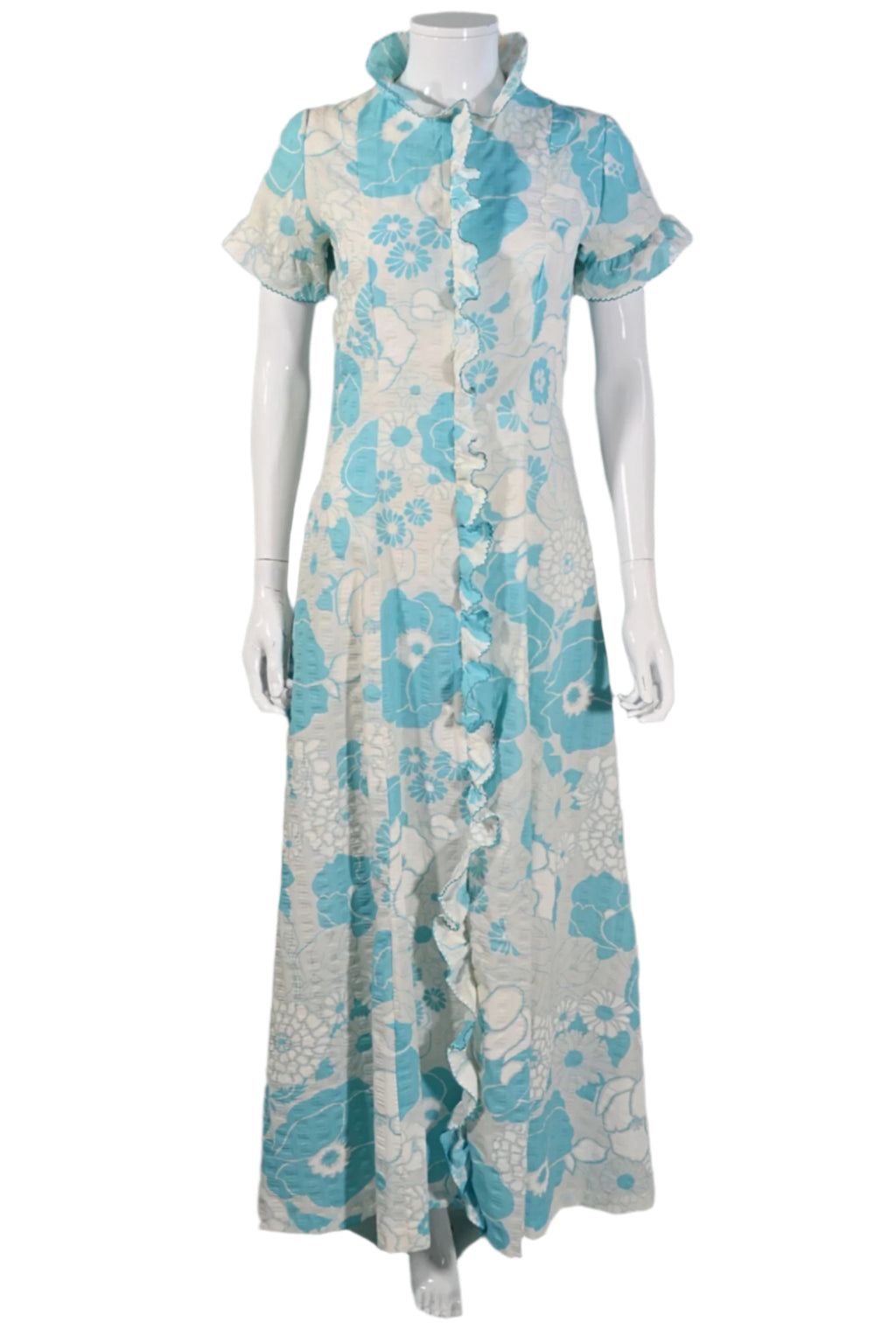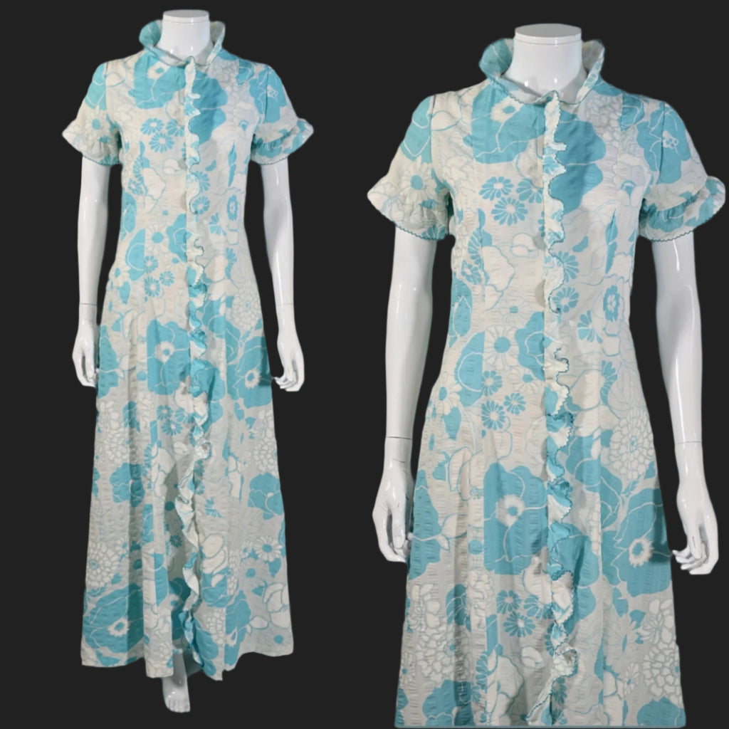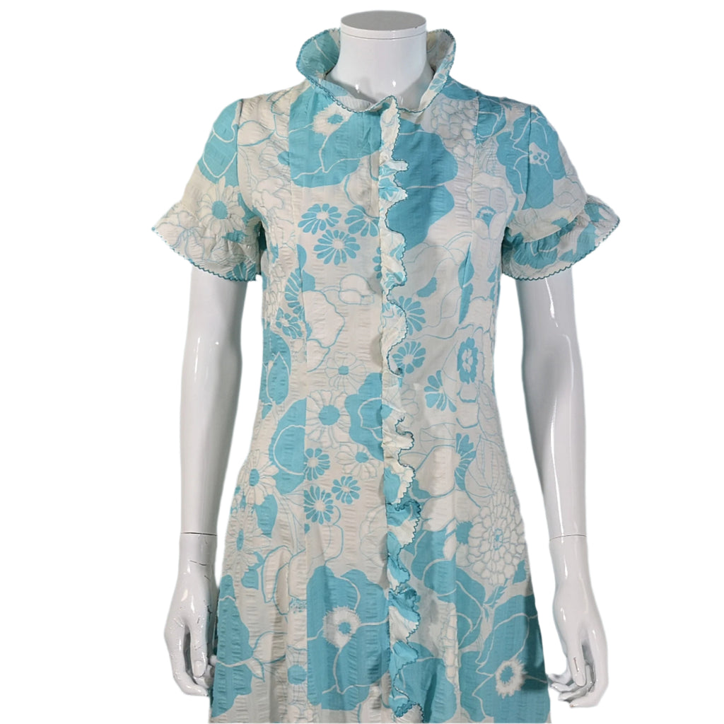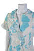 A concealed zipper up the front, short sleeves, and pockets in the side seams.