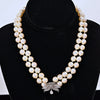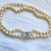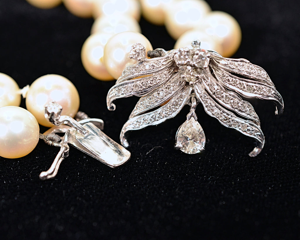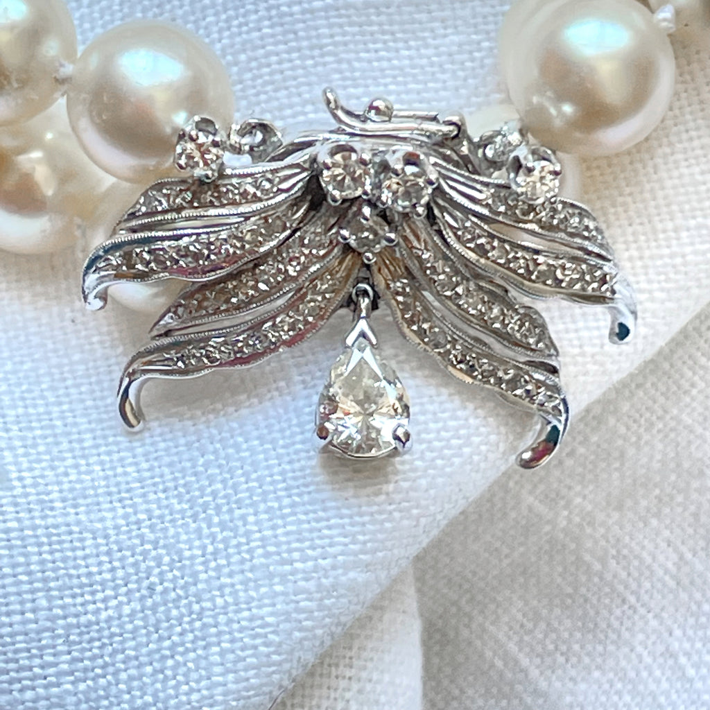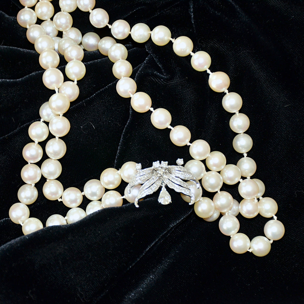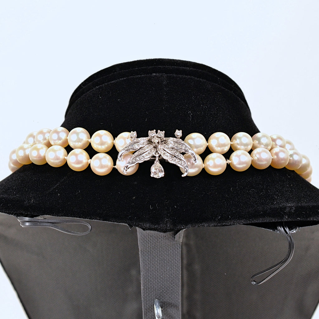 One double strand of cultured pearls attached to a 14K white gold diamond pave detail.