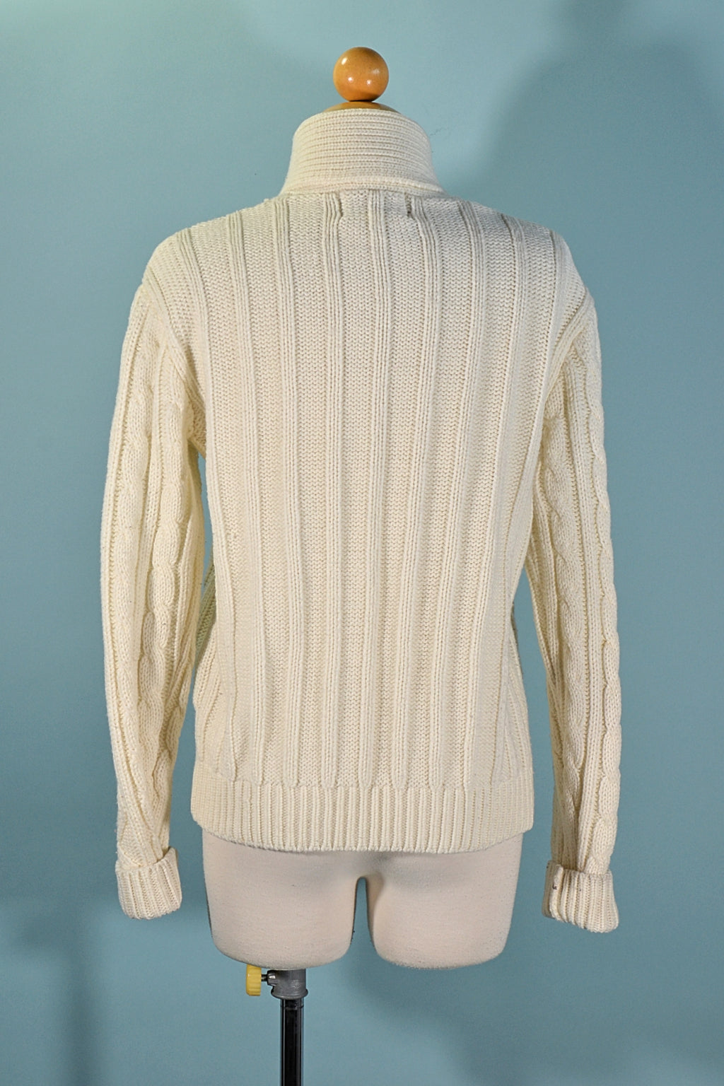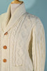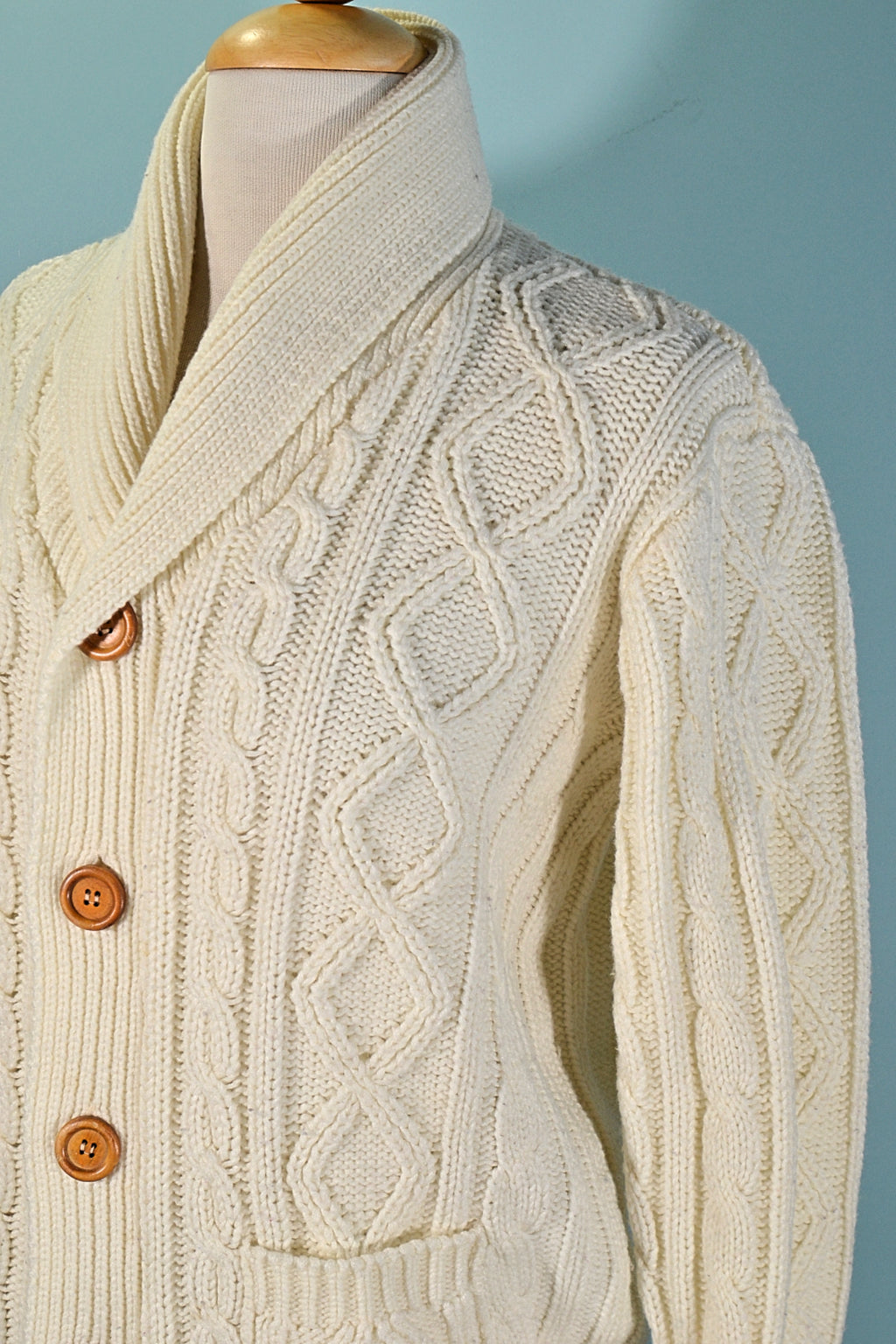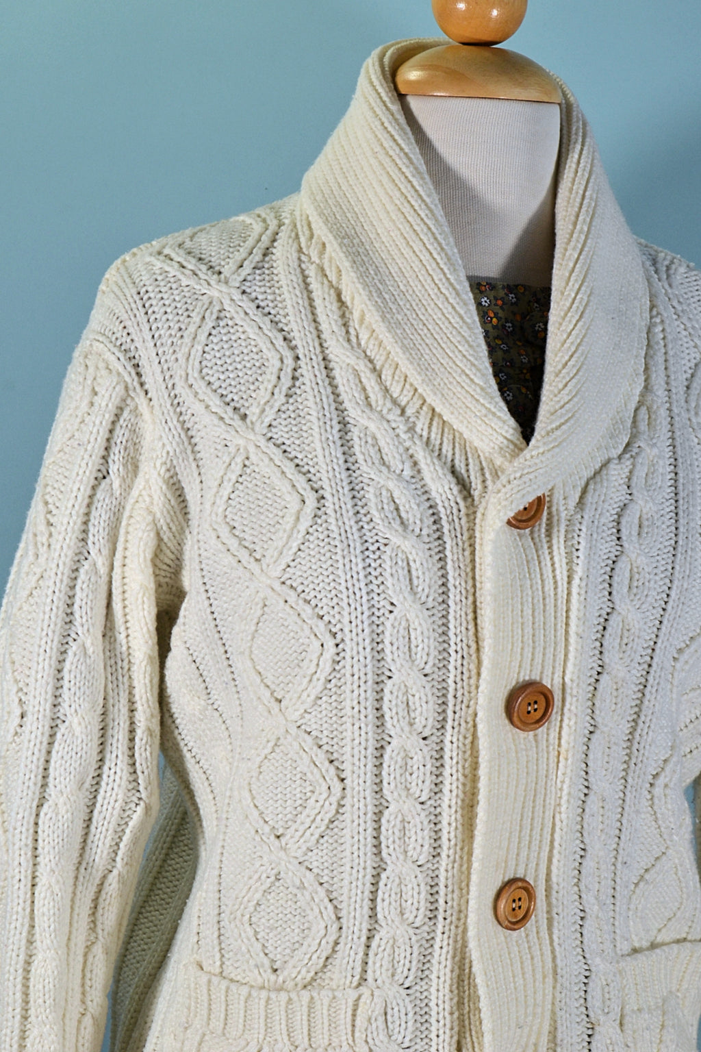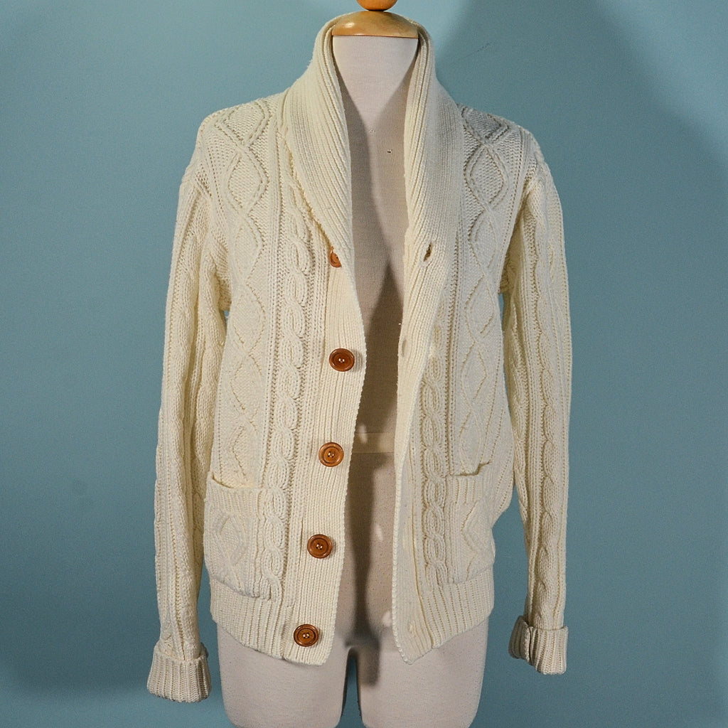 Vintage cable knit cream cardigan sweater. Wooden buttons up the front, patch pockets & shawl collar.