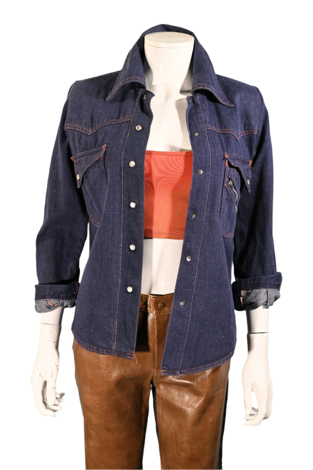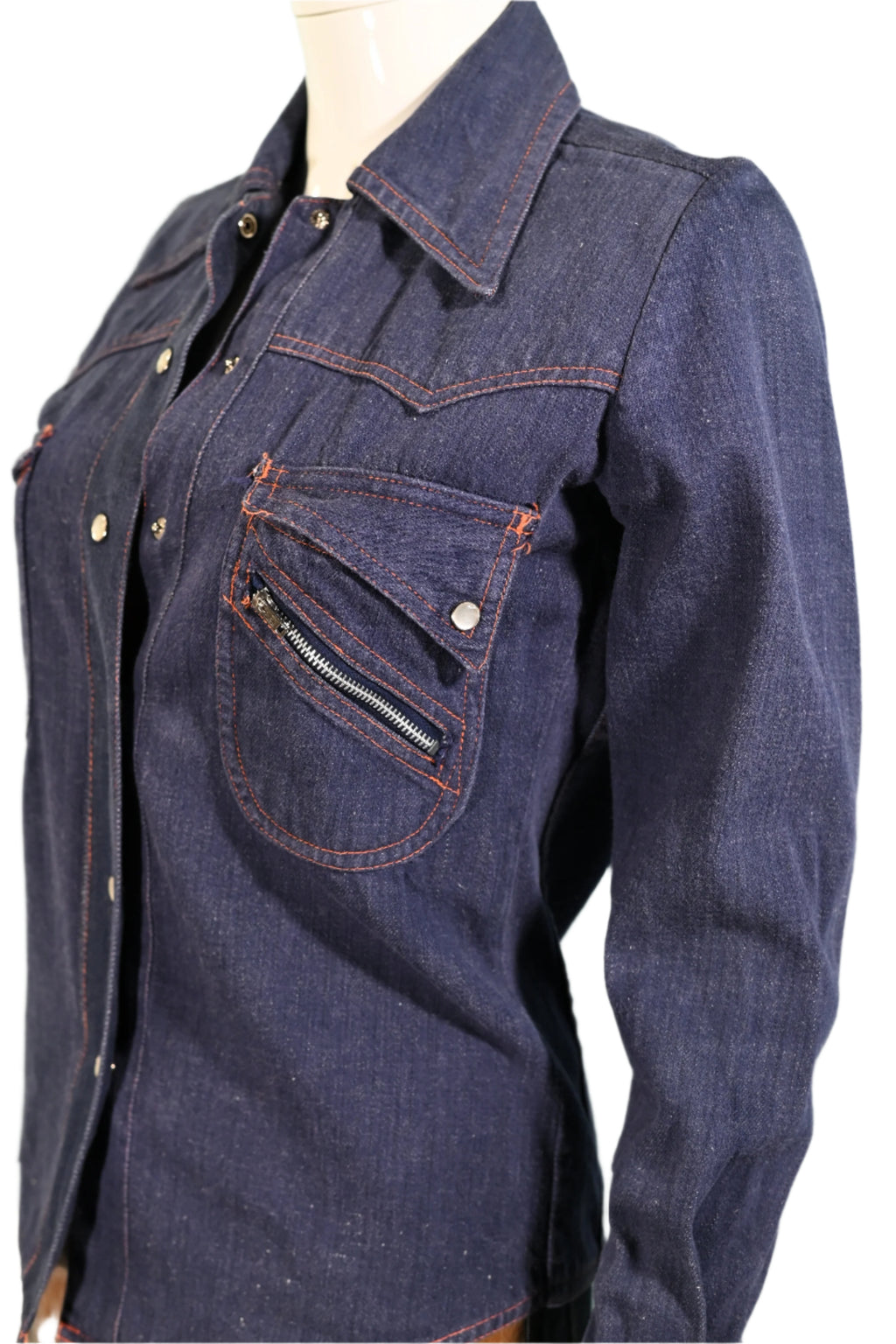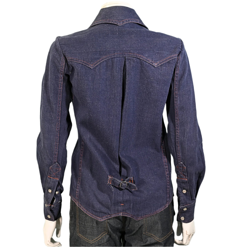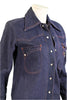 Great vintage dark wash denim top with orange top stitching.