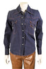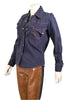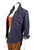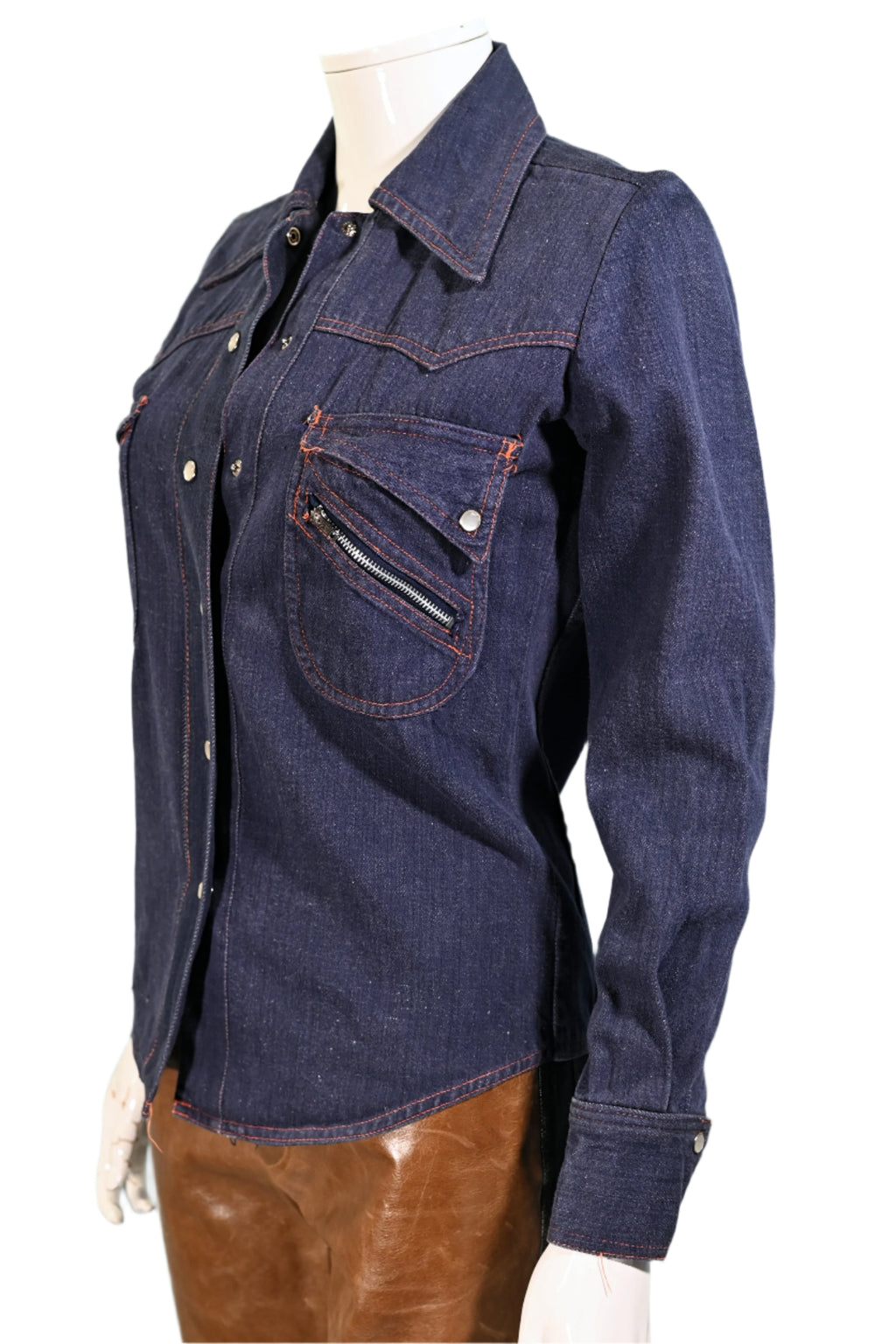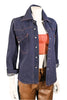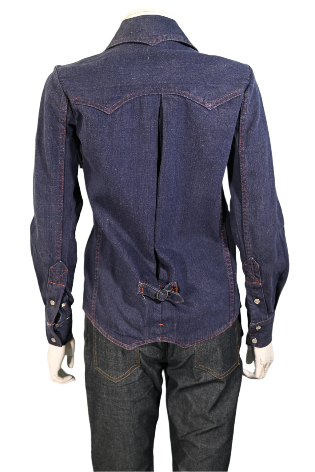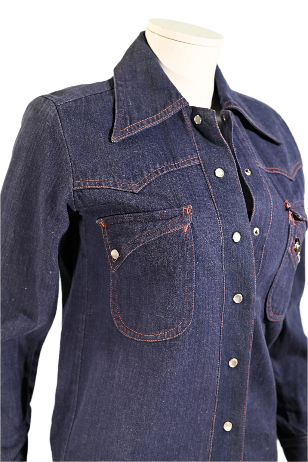 Great vintage dark wash denim top with orange top stitching.