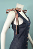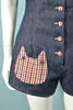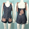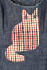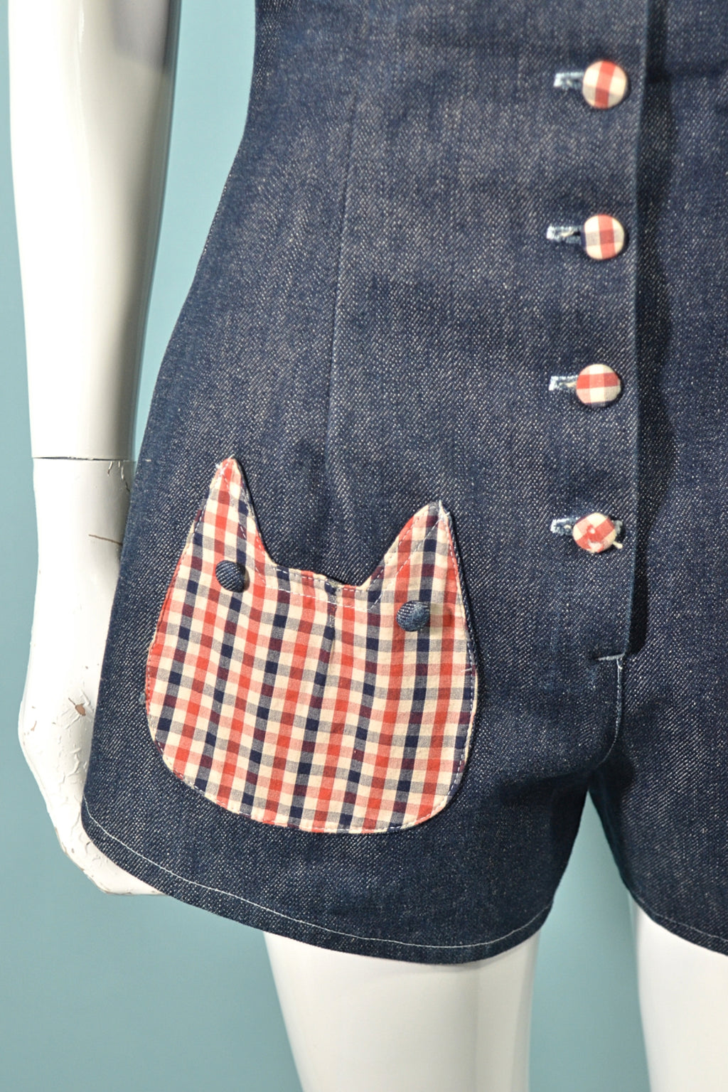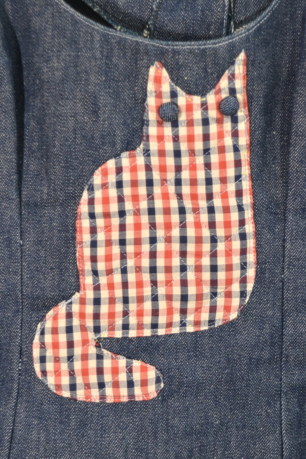 We have never seen a romper as amazing as this one. Denim romper with gingham ties at the shoulders, covered buttons, and quilted applique cat pockets on the front & a cat on the back.