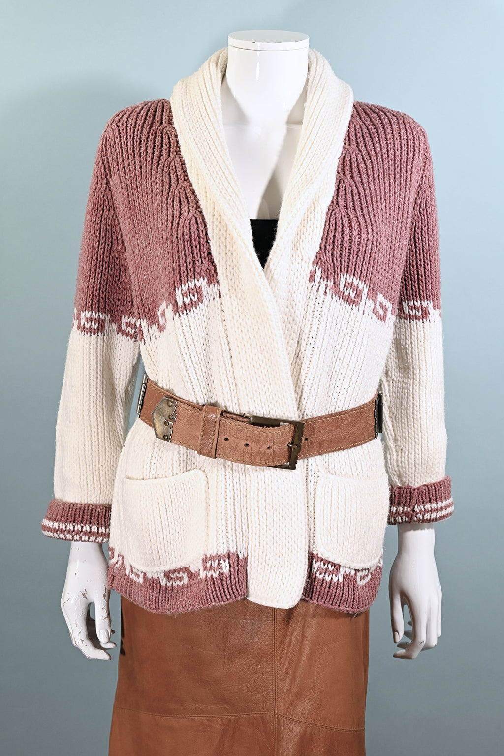 Shawl collar and pockets, relaxed fit. Original belt unavailable.