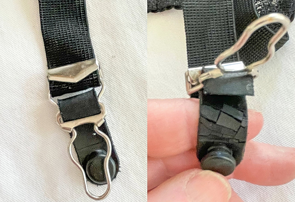Condition: The elastic on the back has no more give. Rubber under the snaps is brittle and breaking. Can be replaced.